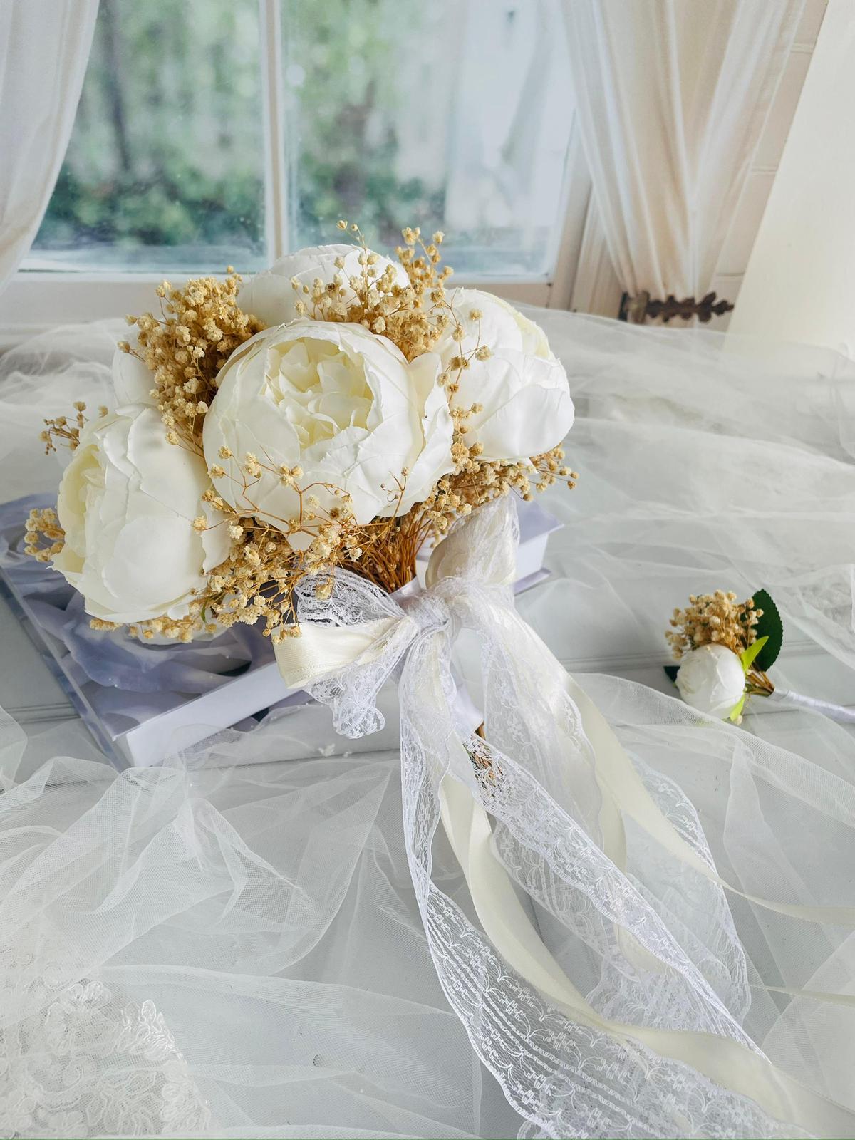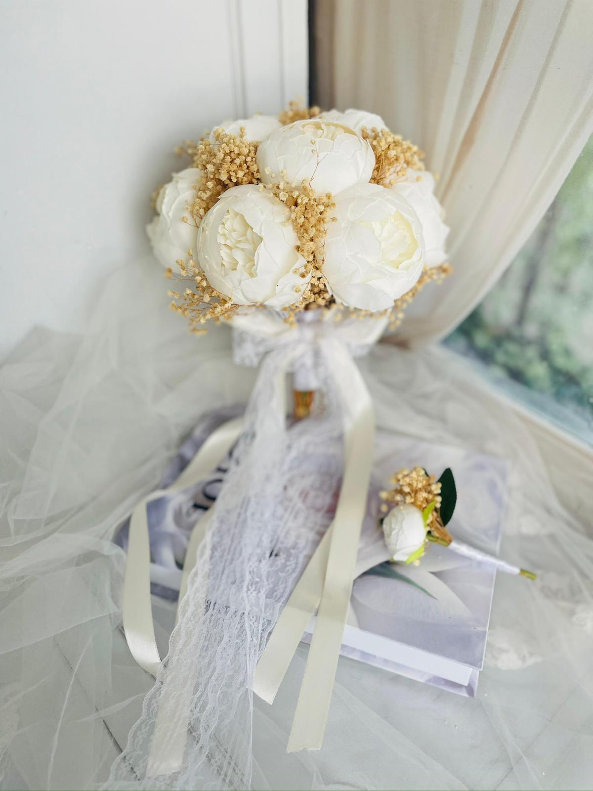 💐Gerçek çiçek görünümündeki birinci sınıf kumaş çiçek ve şoklanmış çiçekler ile hazırlanmıştır. Zarif ve sade tasarımıyla her gelinliğe uyum sağlar . Orta boydur ne büyük ne de küçük . Yaka çiçeği hediyedir. Teslim süresi 15-20 iş günüdür; acil tarihler için not kısmına belirtmeniz yeterlidir.💖 💌Ürünlerimiz tamamen el yapımıdır; bu nedenle her buket ve süs benzersizdir. Çiçeklerin yerleşimi ve detayları ufak farklılıklar gösterebilir, bu da ürünlerimize özel bir karakter katar. 💐