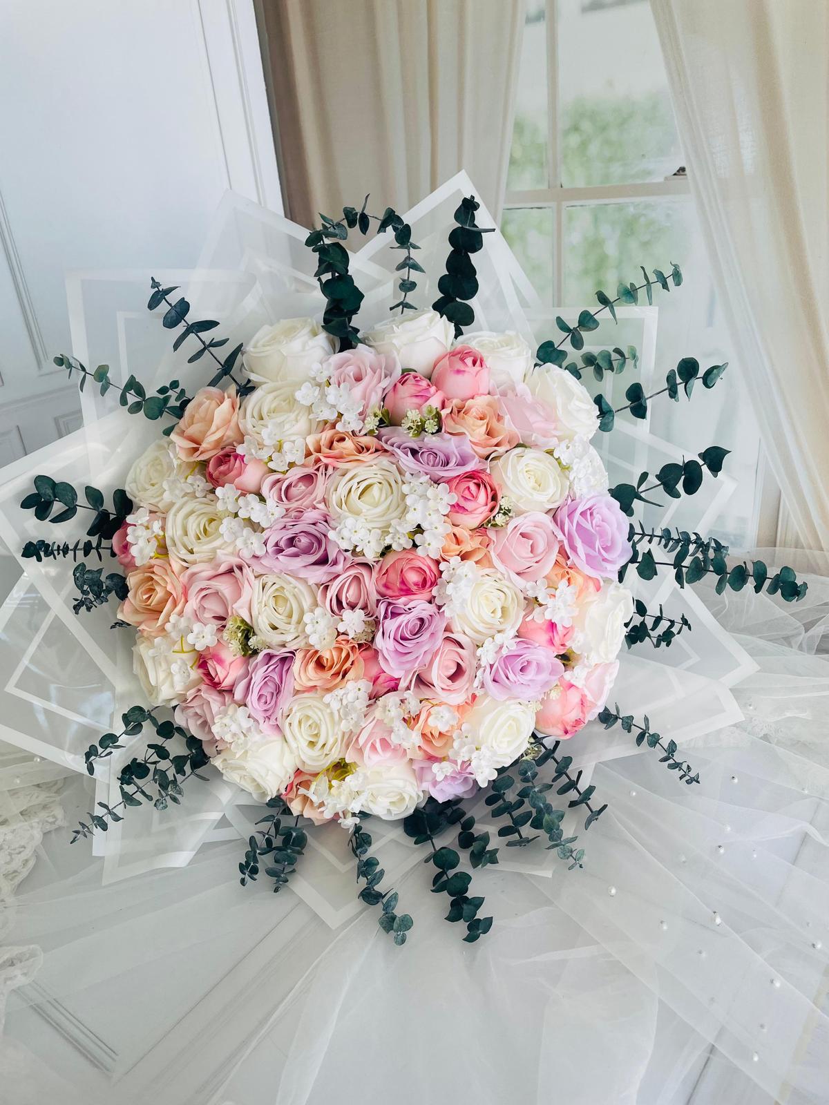 💫Göz alıcı pastel tonlar, modern tasarım ve kusursuz zarafet… İsteme ve nişan törenlerine masalsı bir dokunuş 💍✨ Ömürlük birinci sınıf kalitedeki kumaş çiçeklerden ve şoklanmış okaliptüsden oluşmaktadır Ekstra büyük boydur Teslim süresi 15-20 iş günüdür; acil tarihler için not kısmına belirtmeniz yeterlidir. 🤎 💌Ürünlerimiz tamamen el yapımıdır; bu nedenle her buket ve süs benzersizdir. Çiçeklerin yerleşimi ve detayları ufak farklılıklar gösterebilir, bu da ürünlerimize özel bir karakter katar. 💐
