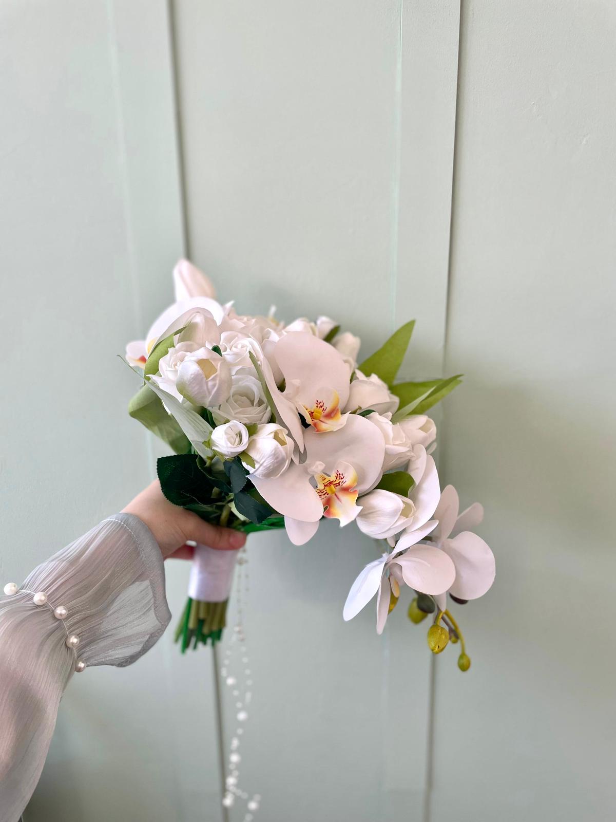 🤍Beyaz orkidelerin sade güzelliğiyle tasarlanan bu gelin buketi, modern gelinlerin ışıltısına zarif bir dokunuş katar. Her detayında huzur, her bakışta asalet. 💫 Islak dokulu orkide ve kumaş güllerden oluşmaktadır . Elde duruşu görseldeki gibidir. Yaka çiçeği hediyedir. Teslim süresi 15-20 iş günüdür; acil tarihler için not kısmına belirtmeniz yeterlidir. 💌Ürünlerimiz tamamen el yapımıdır; bu nedenle her buket ve süs benzersizdir. Çiçeklerin yerleşimi ve detayları ufak farklılıklar gösterebilir, bu da ürünlerimize özel bir karakter katar. 💐