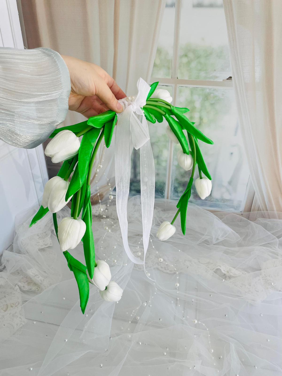💐Her detayıyla bir sanat eseri… Bu özel tasarım gelin buketi, klasik formların ötesine geçerek modern zarafeti yeniden tanımlıyor. El işçiliğiyle hazırlanmış, zarif laleler ve inci dokunuşlarıyla zamansız bir şıklık sunar. Sıradan olmayan gelinler için tasarlandı. 💫 Yapay ama ıslak dokulu lalelerden oluşmaktadır . Elde duruşu görseldeki gibidir. Yaka çiçeği hediyedir. Teslim süremiz 15-20 iş günüdür; acil tarihler için sipariş notuna tarih eklemeniz yeterlidir.💖 Ürünlerimiz tamamen el yapımıdır; bu nedenle her buket ve süs benzersizdir. Çiçeklerin yerleşimi ve detayları ufak farklılıklar gösterebilir, bu da ürünlerimize özel bir karakter katar. 💐