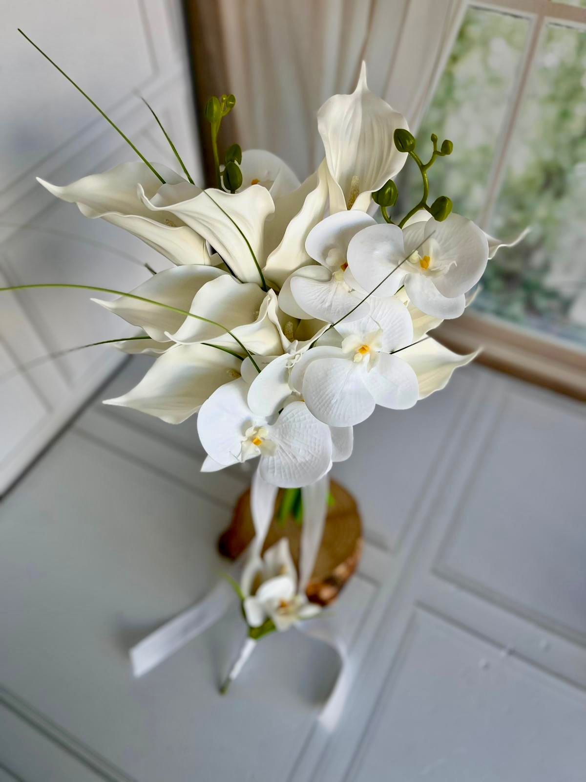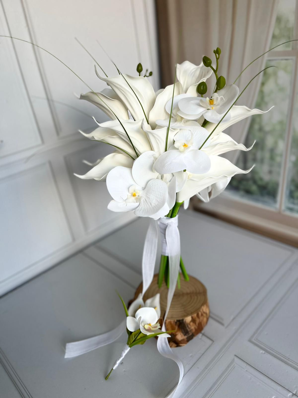 💫Beyazın huzuru, zarif çiçeklerin dengesiyle birleşti. Gala ve orkidelerden oluşan bu özel buket, sadeliğiyle büyüleyen gelinler için tasarlandı. Doğal, zarif ve kusursuz bir uyum. ✨ Yapay ama ıslak dokulu birinci sınıf kalitedeki çiçeklerden oluşmaktadır, ömürlüktür. Orta boydur ne büyük ne de küçük. Yaka çiçeği hediyedir.✨ Teslim süresi 15-20 iş günüdür; acil tarihler için not kısmına belirtmeniz yeterlidir. 💌Ürünlerimiz tamamen el yapımıdır; bu nedenle her buket ve süs benzersizdir. Çiçeklerin yerleşimi ve detayları ufak farklılıklar gösterebilir, bu da ürünlerimize özel bir karakter katar. 💐
