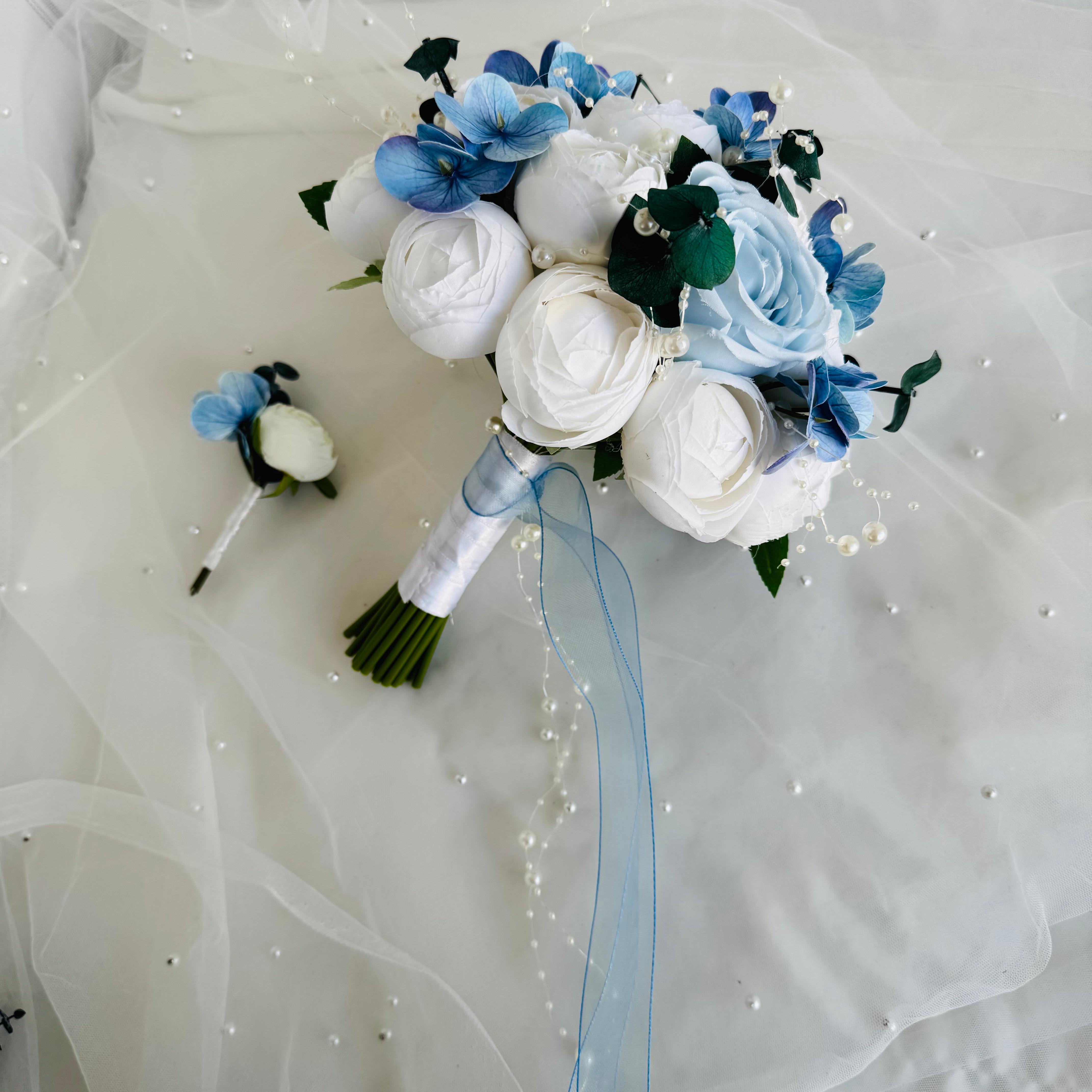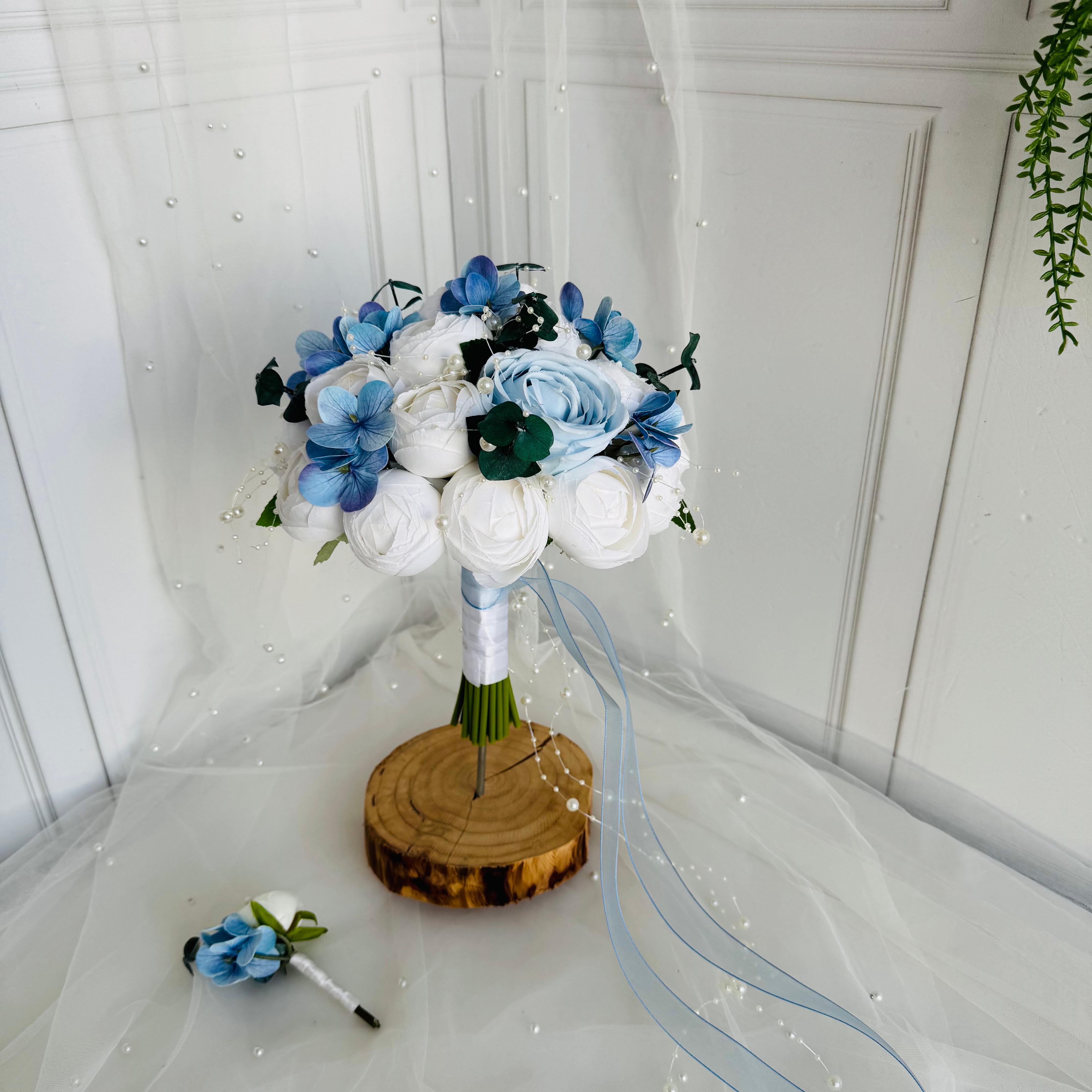 💫Birinci sınıf kalitedeki kumaş ve şoklanmış çiçeklerle hazırlanmış bu özel buket, mavi ve beyaz tonlarının uyumuyla ömürlük bir şıklık sunar. Özgün formu ile her detayı zarafet dolu bir tasarım.✨ Orta boydur ne büyük ne de küçük. Yaka çiçeği hediyedir. Teslim süresi 15-20 iş günüdür; acil tarihler için not kısmına belirtmeniz yeterlidir. 💌Ürünlerimiz tamamen el yapımıdır; bu nedenle her buket ve süs benzersizdir. Çiçeklerin yerleşimi ve detayları ufak farklılıklar gösterebilir, bu da ürünlerimize özel bir karakter katar. 💐