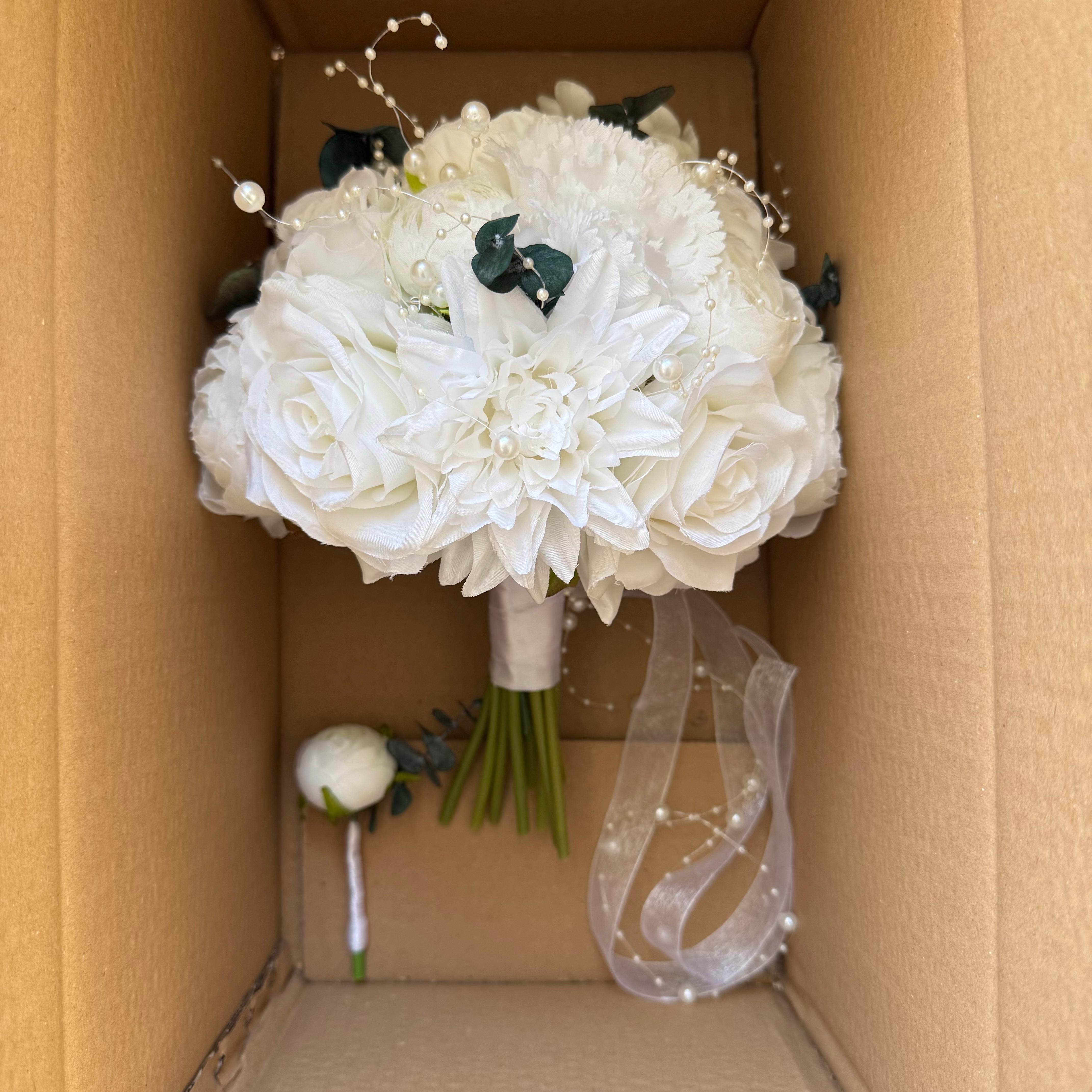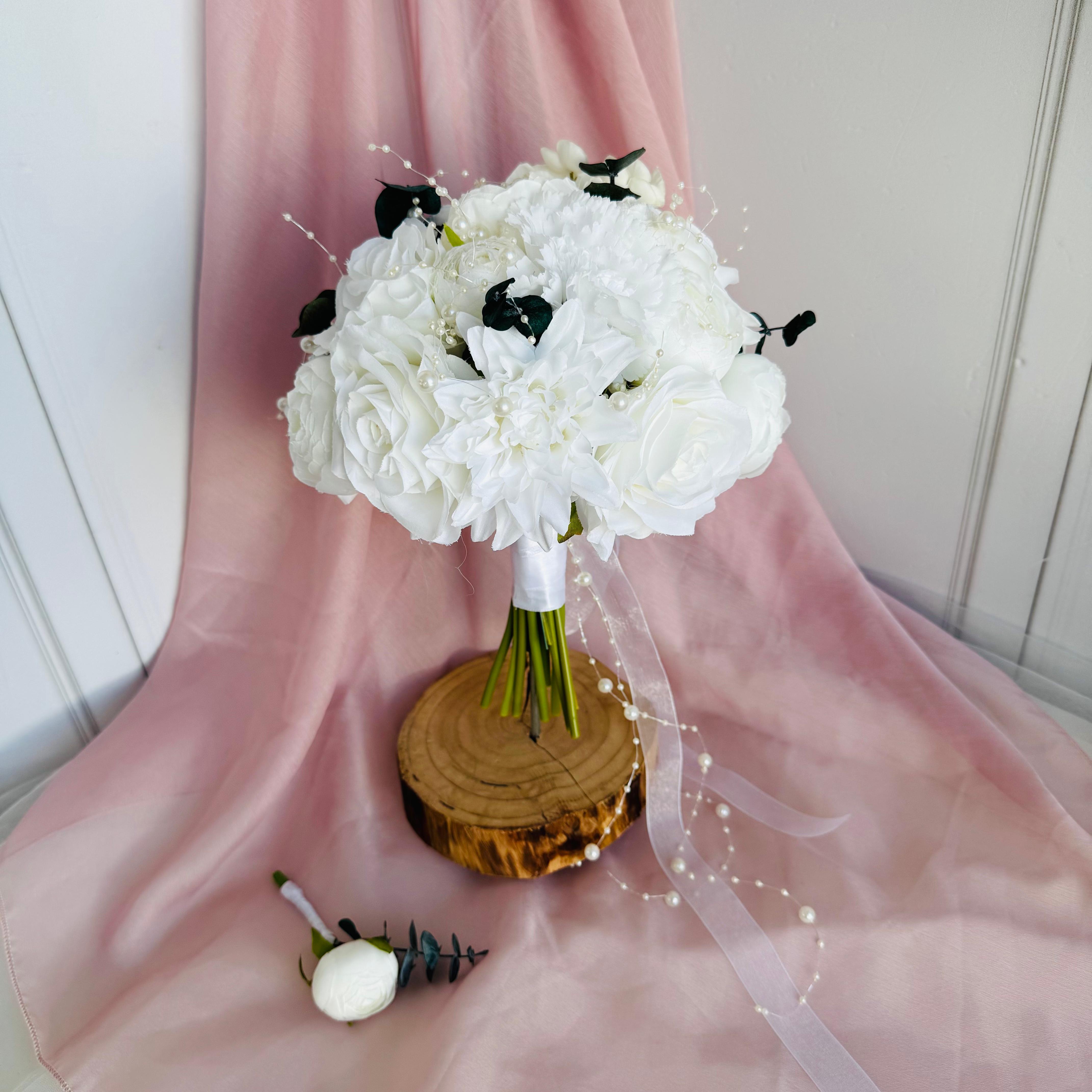 💫Birinci sınıf kalitedeki kumaş ve şoklanmış çiçeklerle hazırlanmış bu özel buket beyaz çiçeklerin uyumuyla ömürlük bir şıklık sunar. Özgün formu ile her detayı zarafet dolu bir tasarım.✨ Orta boydur ne büyük ne de küçük. Yaka çiçeği hediyedir. Teslim süresi 15-20 iş günüdür; acil tarihler için not kısmına belirtmeniz yeterlidir. 💌Ürünlerimiz tamamen el yapımıdır; bu nedenle her buket ve süs benzersizdir. Çiçeklerin yerleşimi ve detayları ufak farklılıklar gösterebilir, bu da ürünlerimize özel bir karakter katar. 💐