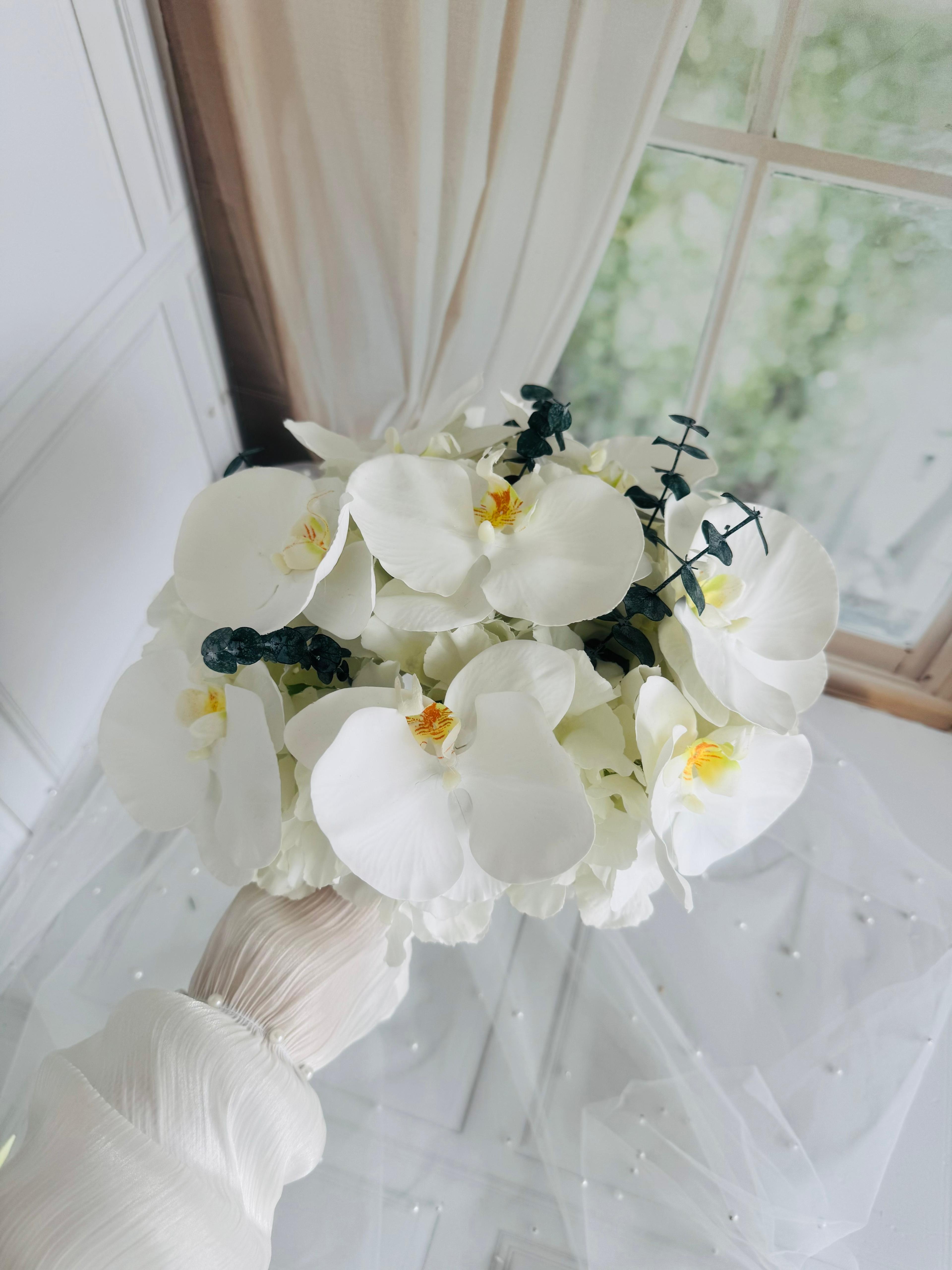 ?Sadelikten gelen ihtişamı taşıyan bu tasarım, her gelinin hayalini yansıtır. Islak dokulu orkide ve kumaş ortancadan oluşmaktadır. Orta boydur ne büyük ne de küçük. Yaka çiçeği hediyedir .? Teslim süresi 15-20 iş günüdür; acil tarihler için not kısmına belirtmeniz yeterlidir. Ürünlerimiz tamamen el yapımıdır; bu nedenle her buket ve süs benzersizdir. Çiçeklerin yerleşimi ve detayları ufak farklılıklar gösterebilir, bu da ürünlerimize özel bir karakter katar. ?