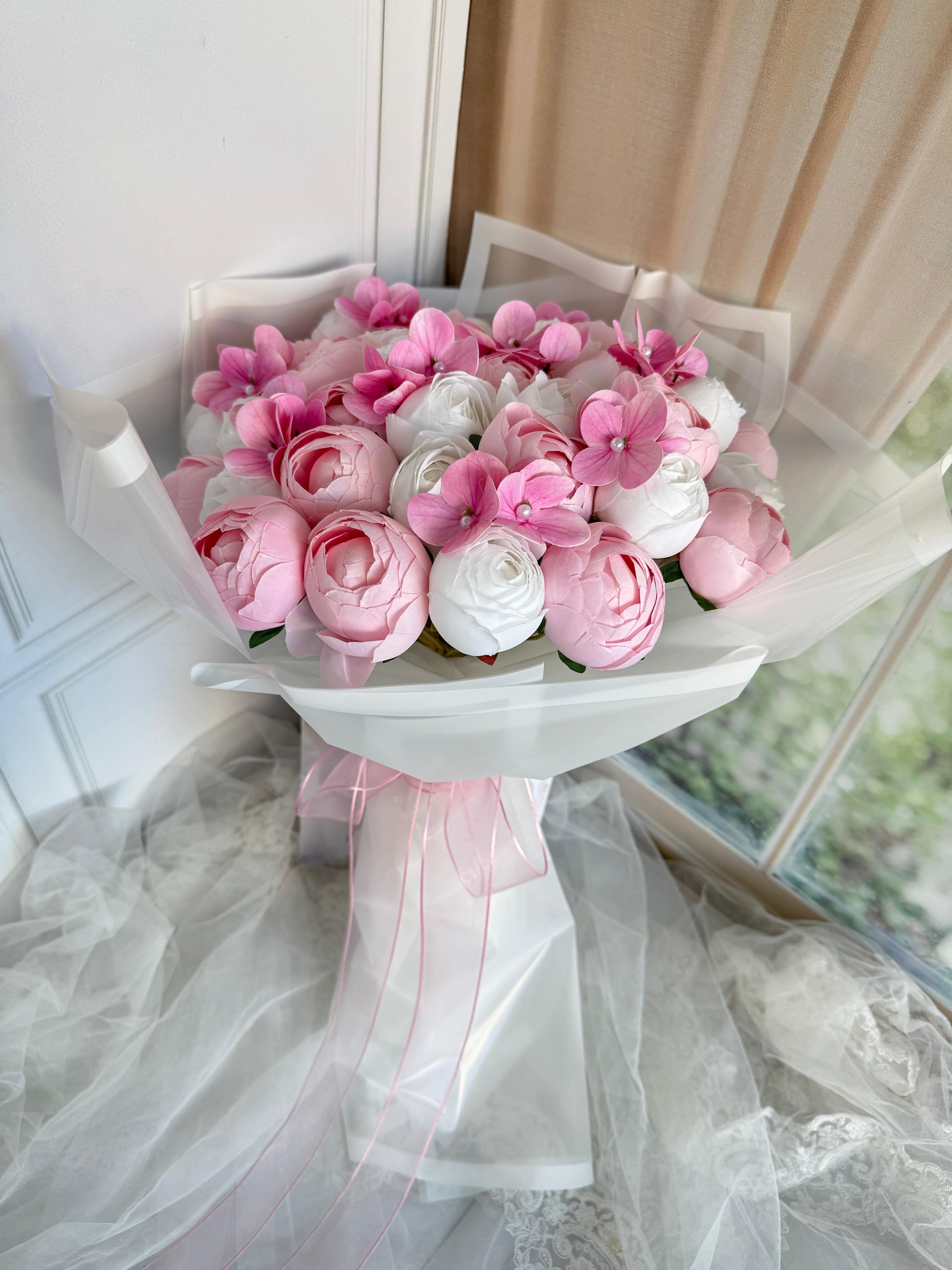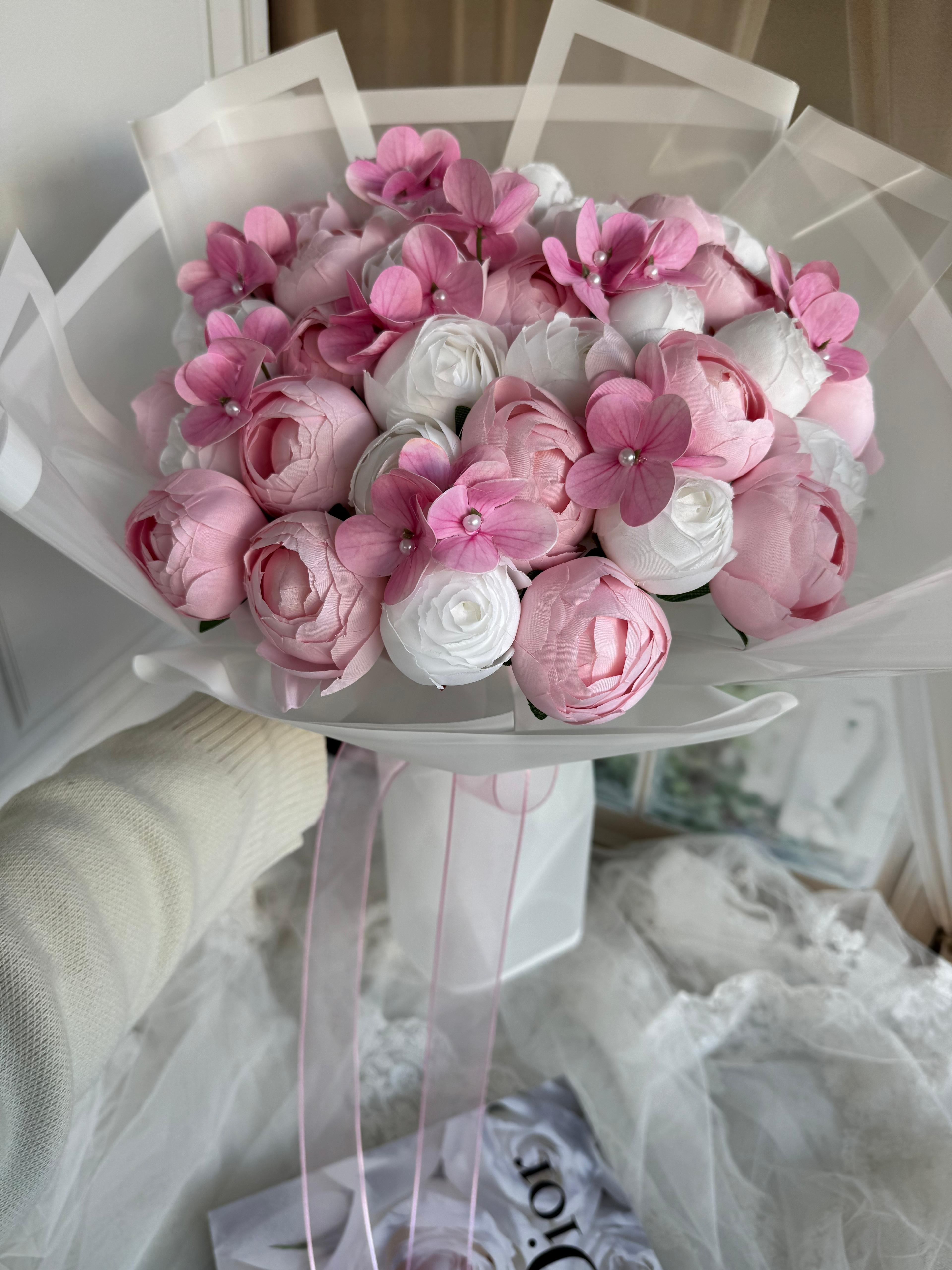 ?Bu zarif buket , romantik pembesi ve yumuşak dokusuyla kalpleri fetheder. Sevginizi en şık şekilde ifade eder.? Ömürlüktür. Büyük boydur. Teslim süresi 15-20 iş günüdür; acil tarihler için not kısmına belirtmeniz yeterlidir. Ürünlerimiz tamamen el yapımıdır; bu nedenle her buket ve süs benzersizdir. Çiçeklerin yerleşimi ve detayları ufak farklılıklar gösterebilir, bu da ürünlerimize özel bir karakter katar. ?