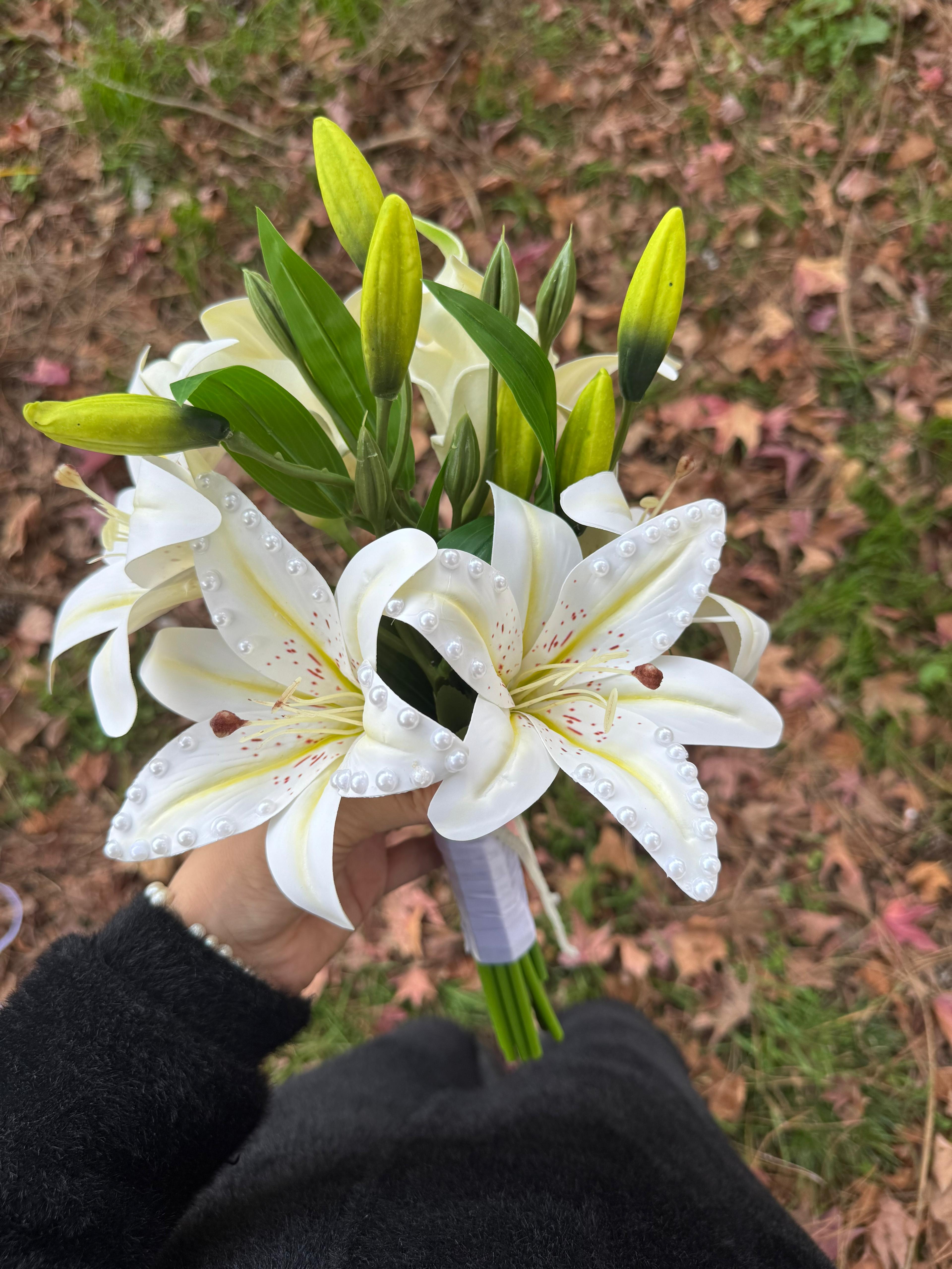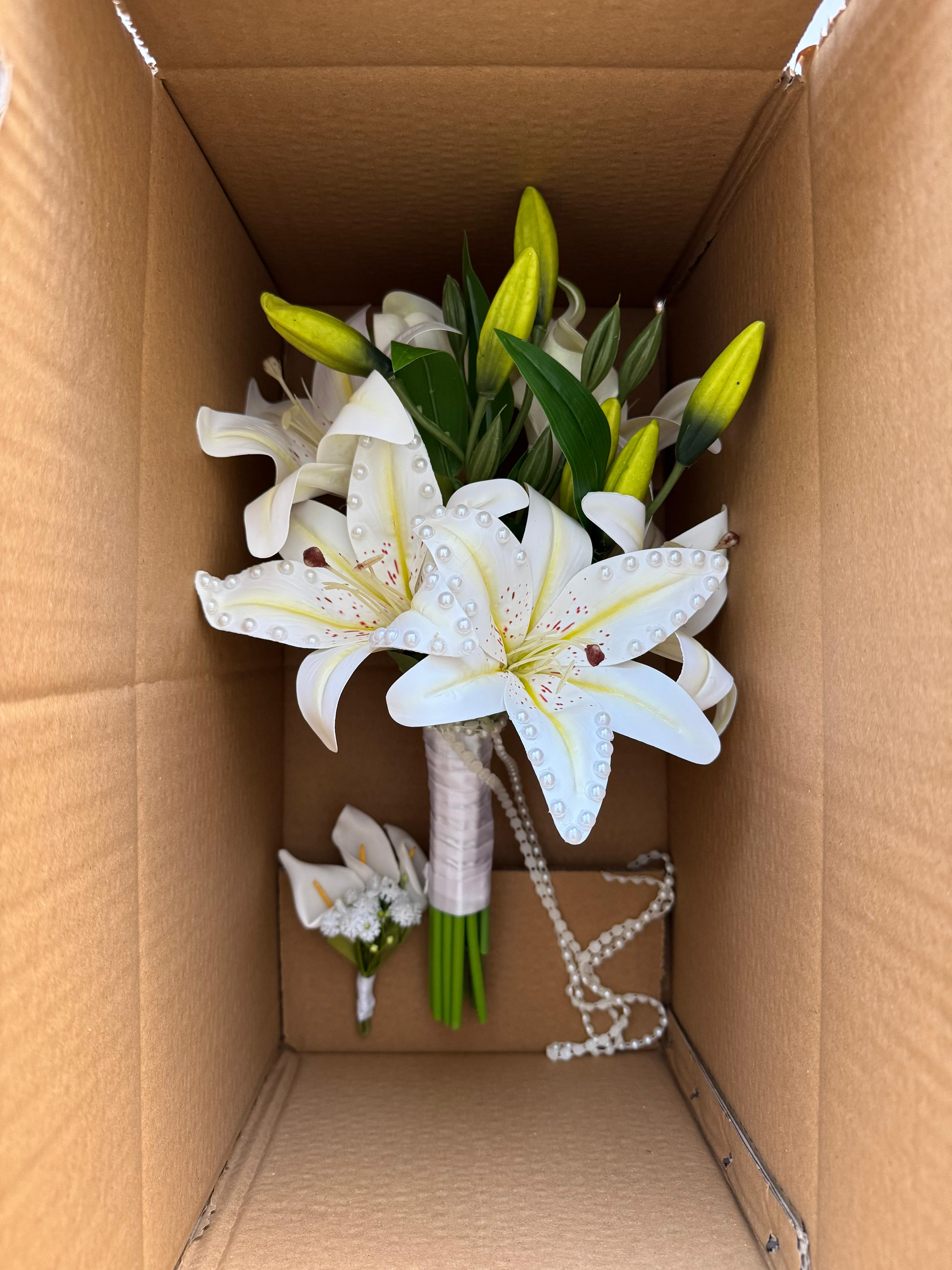 Zarif çizgileri ve kalıcı dokusuyla lilyumlardan hazırlanan bu özel buket, düğün gününüzü unutulmaz kılmak için tasarlandı. Solmayan yapısıyla uzun süre ilk günkü tazeliğini korur ve her özel an için etkileyici bir tercih sunar.? Orta boydur ne büyük ne de küçük. Yaka çiçeği hediyedir. Teslim süresi 15-20 iş günüdür; acil tarihler için not kısmına belirtmeniz yeterlidir. ?Ürünlerimiz tamamen el yapımıdır; bu nedenle her buket ve süs benzersizdir. Çiçeklerin yerleşimi ve detayları ufak farklılıklar gösterebilir, bu da ürünlerimize özel bir karakter katar. ?