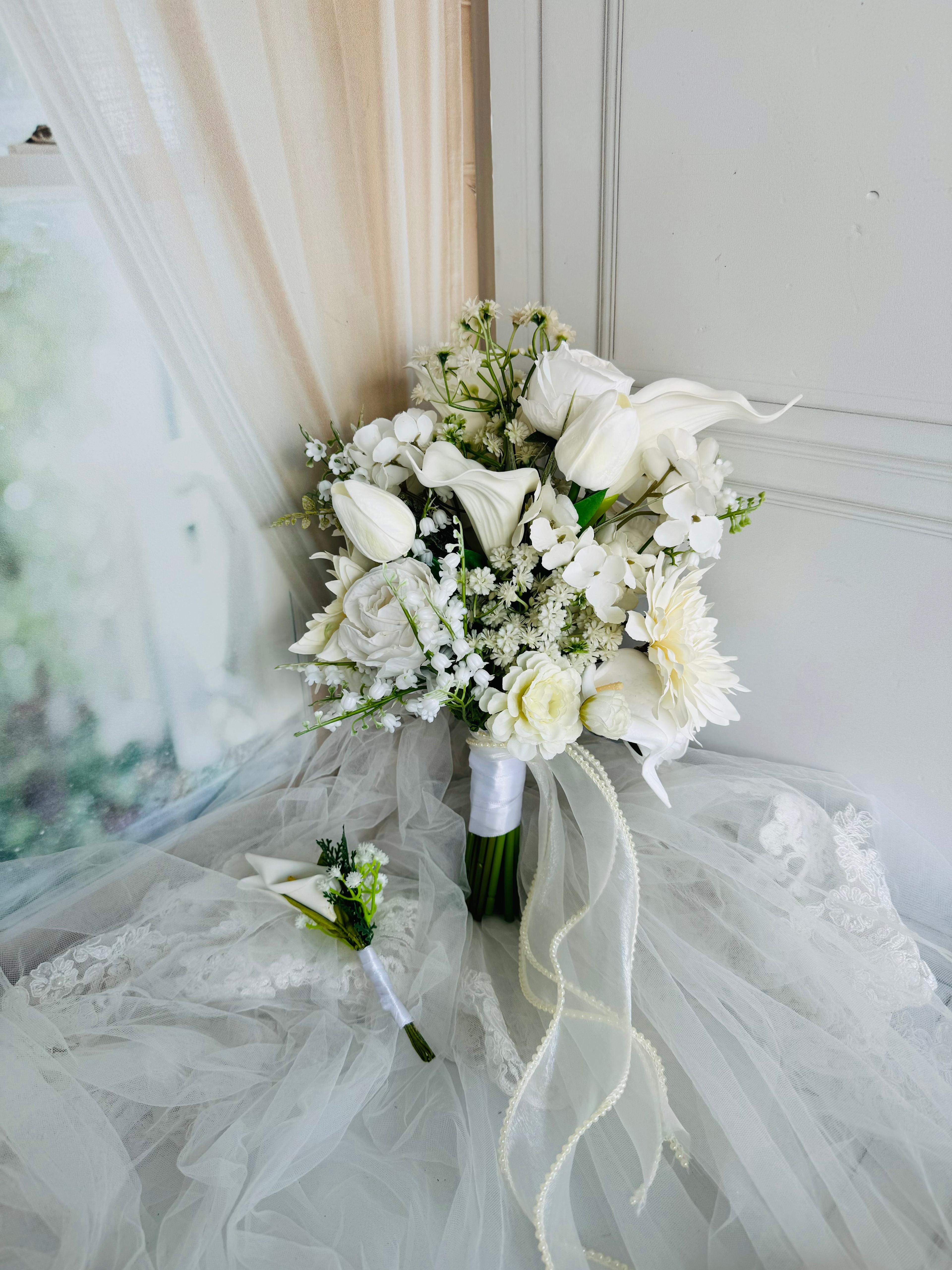 ?Yeşil yapraklar ve beyaz gala çiçekleriyle hazırlanan bu zarif gelin buketi, sade şıklığı ve doğal güzelliğiyle özel gününüze anlam katıyor. ?Orta boydur ne büyük ne de küçük. Yaka çiçeği hediyedir. Teslim süresi 15-20 iş günüdür; acil tarihler için not kısmına belirtmeniz yeterlidir. ?Ürünlerimiz tamamen el yapımıdır; bu nedenle her buket ve süs benzersizdir. Çiçeklerin yerleşimi ve detayları ufak farklılıklar gösterebilir, bu da ürünlerimize özel bir karakter katar. ?