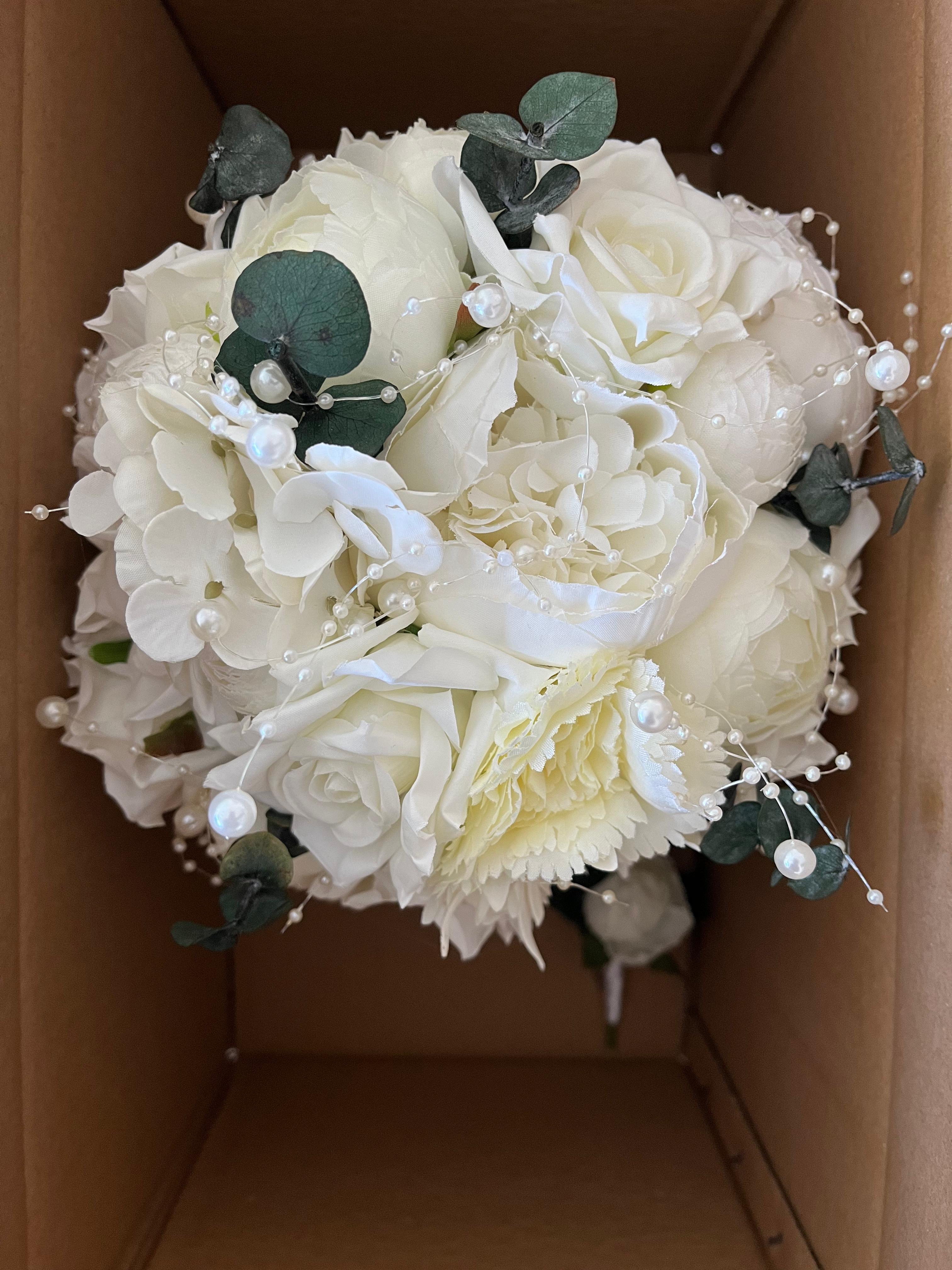 Beyaz çiçeklerin sade güzelliğine inci detaylarının zarif ışıltısı eşlik ediyor. Modern ve temiz bir şıklık arayan gelinler için özenle hazırlandı.? Orta boydur ne büyük ne de küçük. Yaka çiçeği hediyedir. Teslim süresi 15-20 iş günüdür; acil tarihler için not kısmına belirtmeniz yeterlidir. ?Ürünlerimiz tamamen el yapımıdır; bu nedenle her buket ve süs benzersizdir. Çiçeklerin yerleşimi ve detayları ufak farklılıklar gösterebilir, bu da ürünlerimize özel bir karakter katar. ?