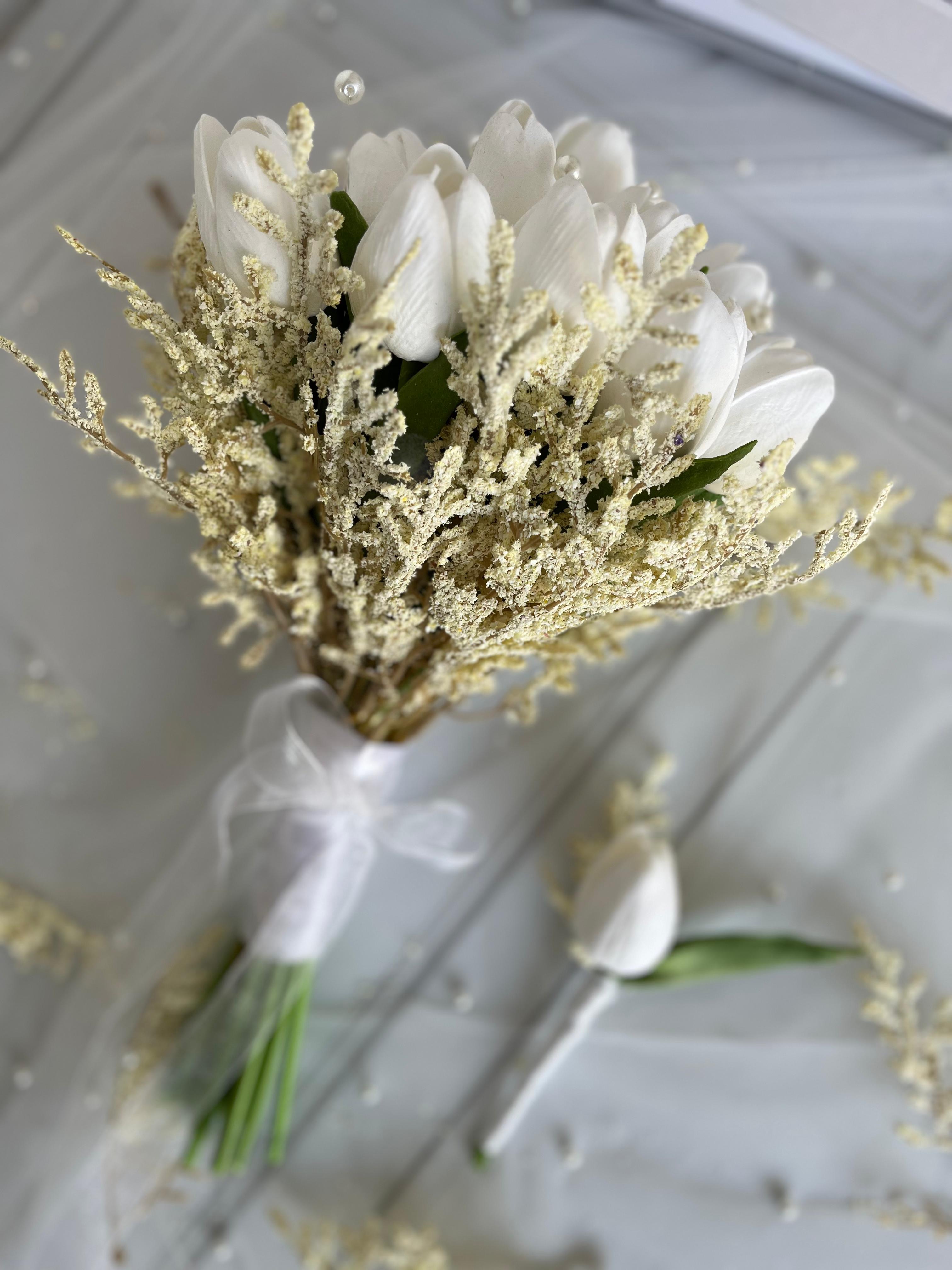 Beyaz lalelerin sade zarafeti, inci dokunuşlar ile birleşerek modern ve sofistike bir görünüm sunar. Temiz, minimal bir gelin buket arayanlar için ideal seçimdir.? Orta boydur ne büyük ne de küçük. Yaka çiçeği hediyedir. Teslim süresi 15-20 iş günüdür; acil tarihler için not kısmına belirtmeniz yeterlidir. ?Ürünlerimiz tamamen el yapımıdır; bu nedenle her buket ve süs benzersizdir. Çiçeklerin yerleşimi ve detayları ufak farklılıklar gösterebilir, bu da ürünlerimize özel bir karakter katar. ?