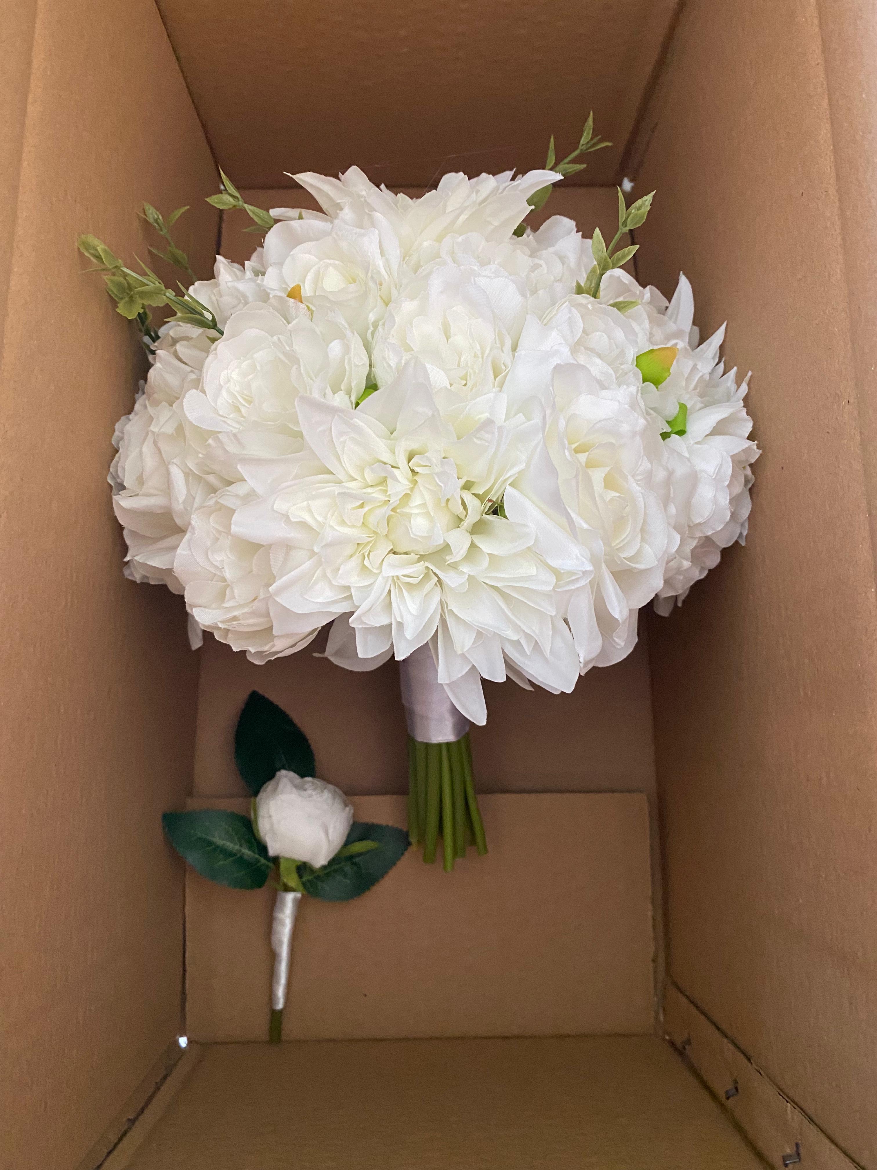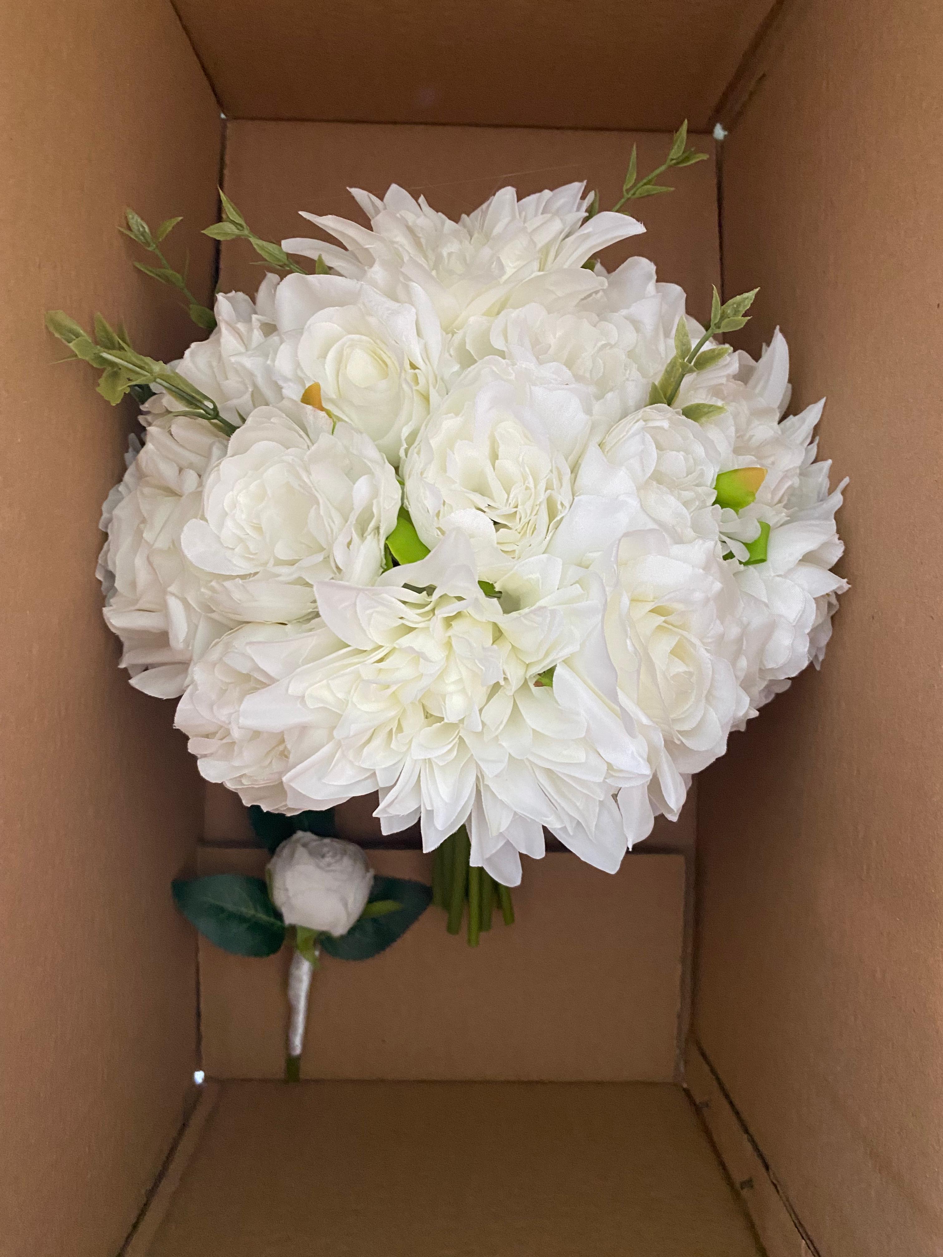 Beyaz çiçeklerin sade güzelliği ile hazırlanan bu buket; Modern ve temiz bir şıklık arayan gelinler için özenle hazırlandı.? Orta boydur ne büyük ne de küçük. Yaka çiçeği hediyedir. Teslim süresi 15-20 iş günüdür; acil tarihler için not kısmına belirtmeniz yeterlidir. ?Ürünlerimiz tamamen el yapımıdır; bu nedenle her buket ve süs benzersizdir. Çiçeklerin yerleşimi ve detayları ufak farklılıklar gösterebilir, bu da ürünlerimize özel bir karakter katar. ?