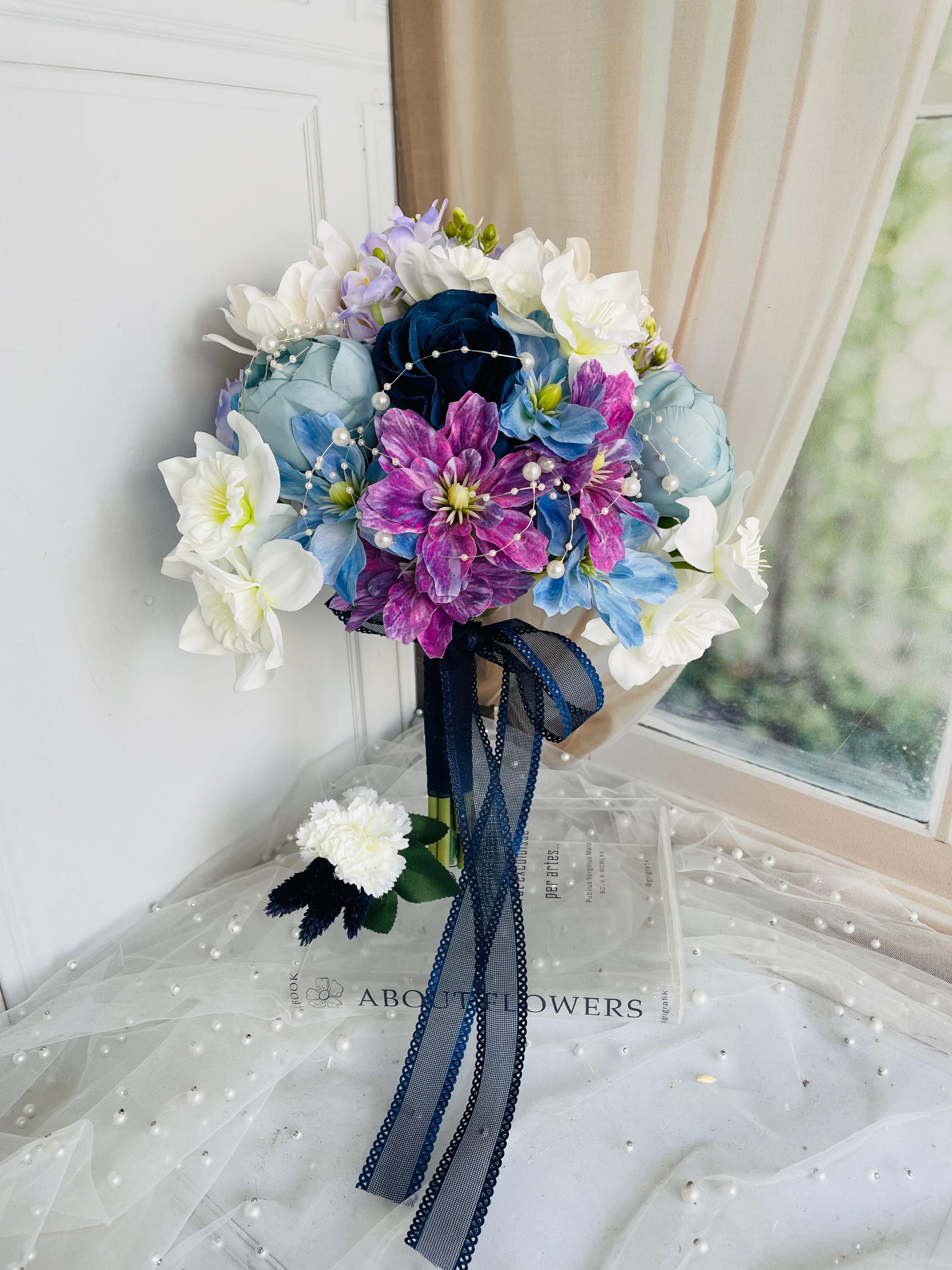 Mavinin huzuru, morun asaleti ve beyazın zarafetini bir arada sunan bu özel buket, her anınıza büyüleyici bir şıklık katmak için tasarlandı.? Düğün veya nişan için uygundur. Orta boydur ne büyük ne de küçük. Yaka çiçeği hediyedir. Teslim süresi 15-20 iş günüdür; acil tarihler için not kısmına belirtmeniz yeterlidir. ?Ürünlerimiz tamamen el yapımıdır; bu nedenle her buket ve süs benzersizdir. Çiçeklerin yerleşimi ve detayları ufak farklılıklar gösterebilir, bu da ürünlerimize özel bir karakter katar. ?