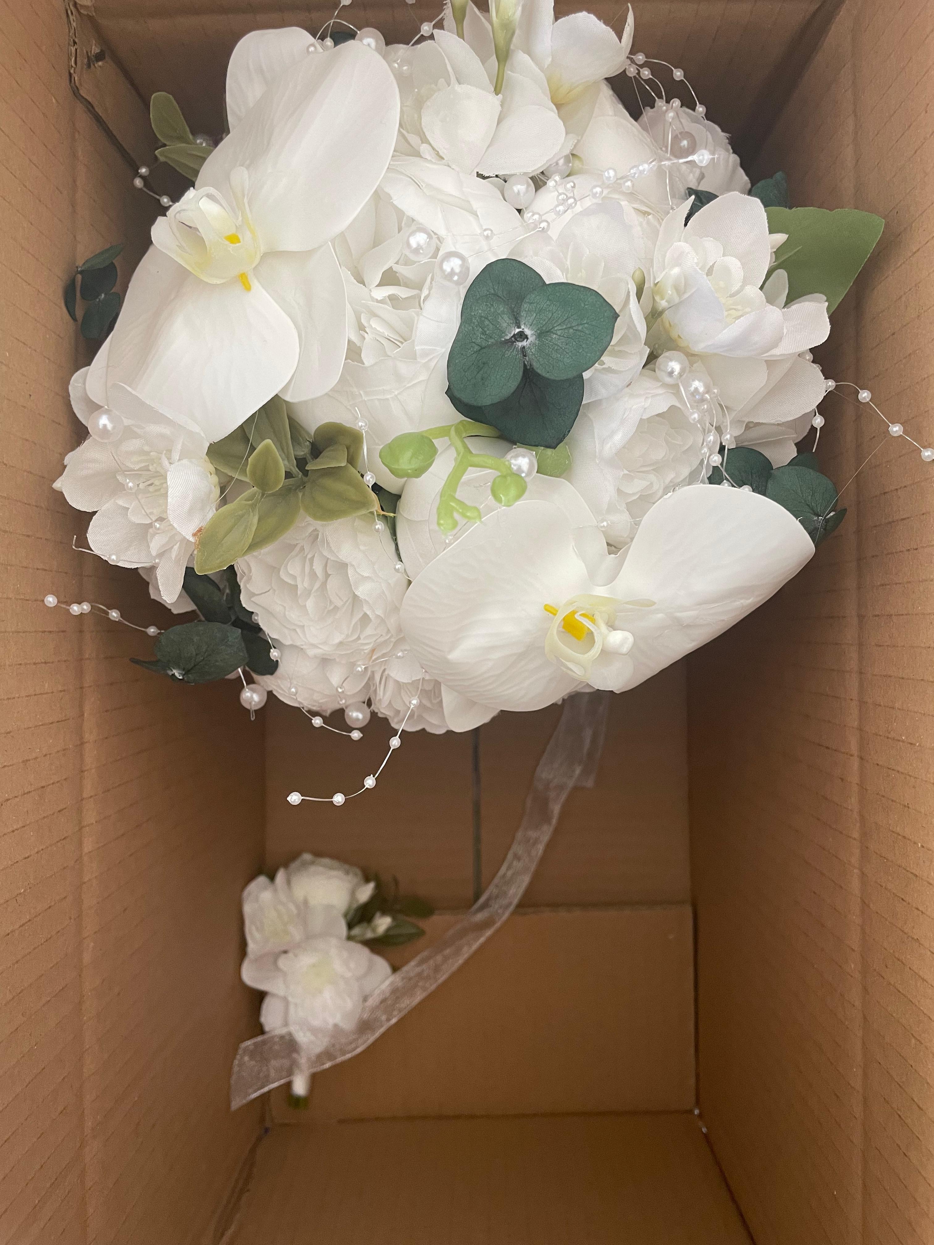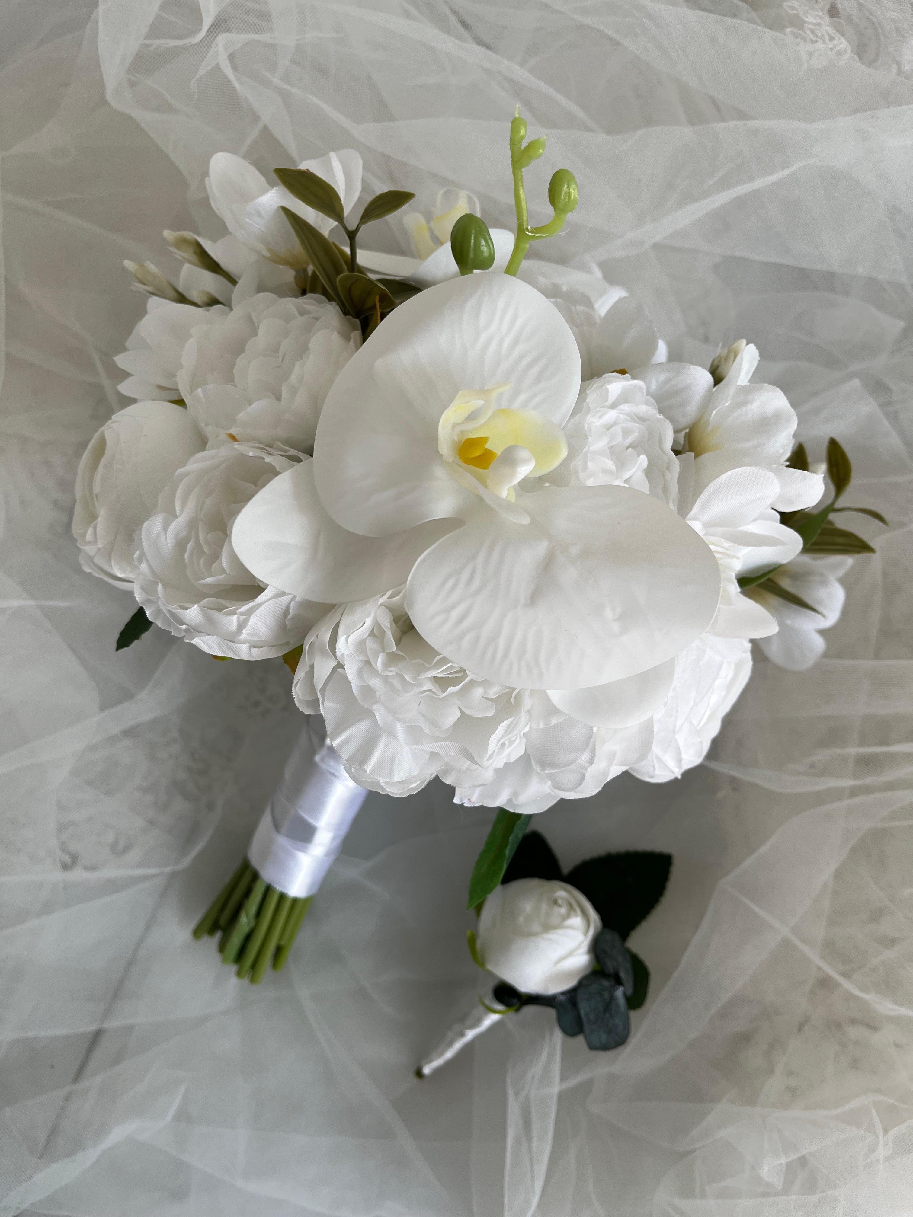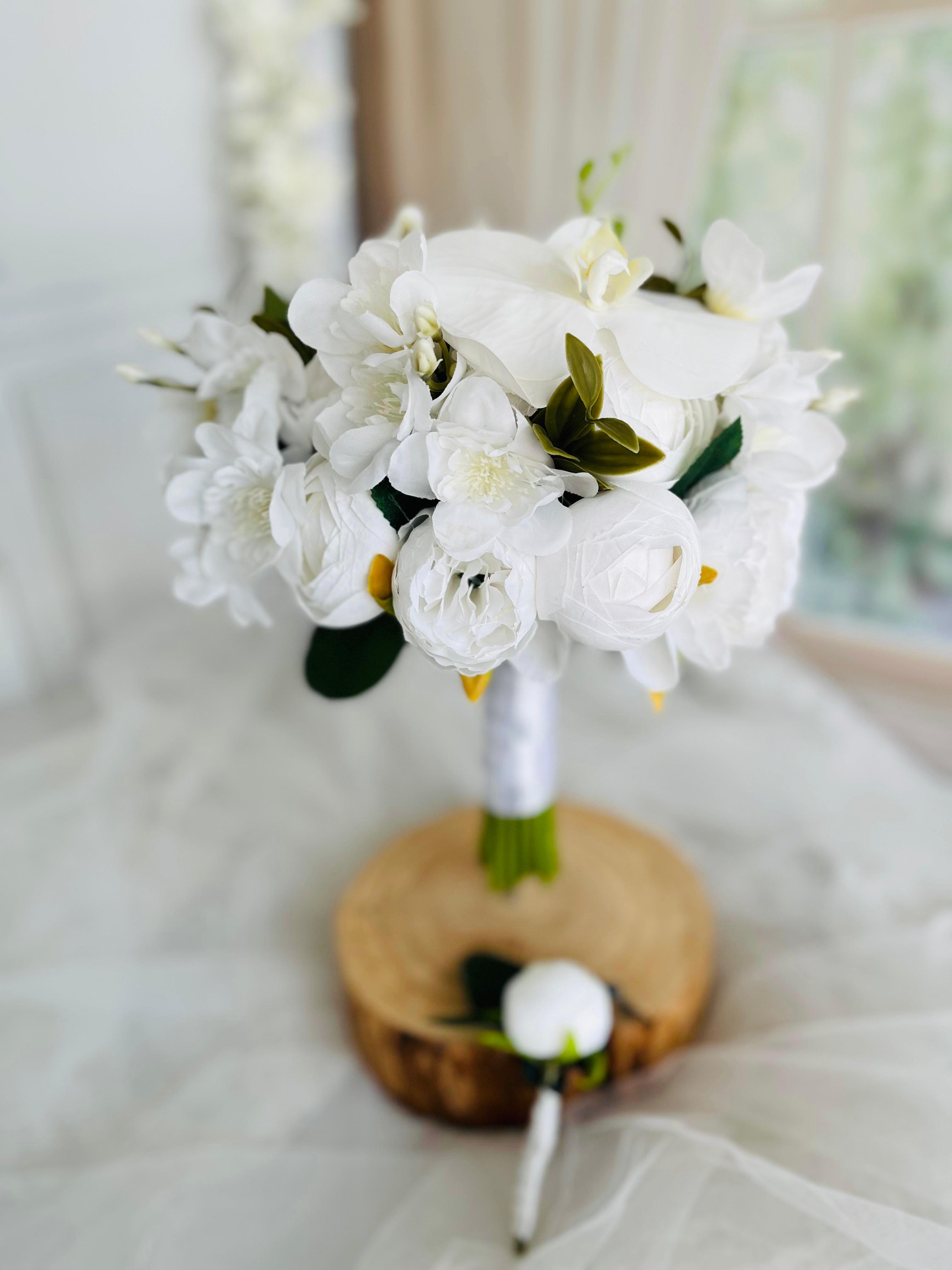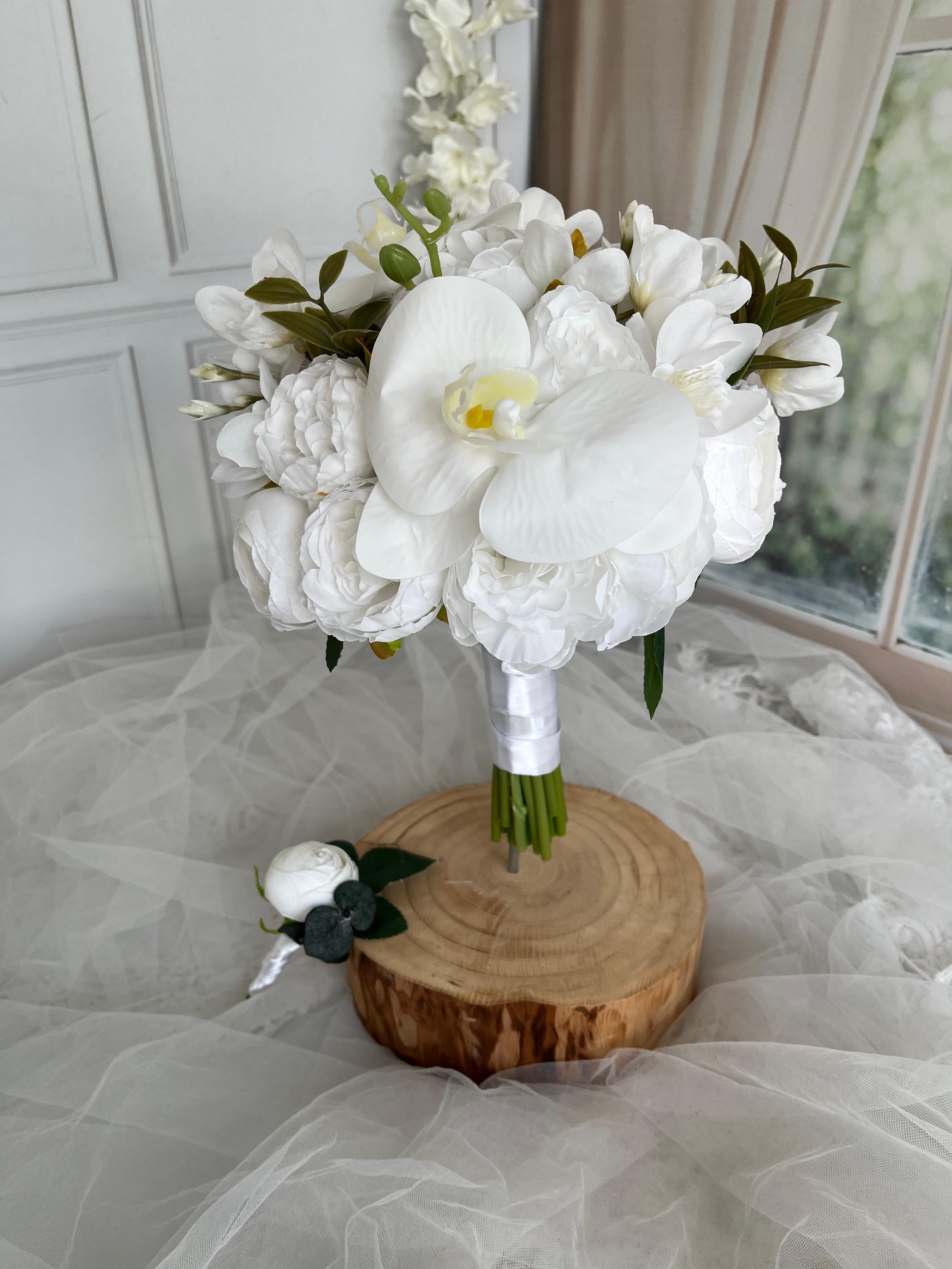 ✨ Beyaz orkidenin asil durusu ve yumuşak çiçek dokuları bu bukete modern bir zarafet kazandırıyor. Temiz, sade ve etkileyici görünümü ile düğün veya nişan için kusursuz bir seçimdir. Birinci sınıf kalitedeki kumaş çiçeklerden oluşmaktadır, ömürlüktür. Orta boydur ne büyük ne de küçük. Yaka çiçeği hediyedir. Teslim süresi 15-20 iş günüdür; acil tarihler için not kısmına belirtmeniz yeterlidir. ?Ürünlerimiz tamamen el yapımıdır; bu nedenle her buket ve süs benzersizdir. Çiçeklerin yerleşimi ve detayları ufak farklılıklar gösterebilir, bu da ürünlerimize özel bir karakter katar. ?