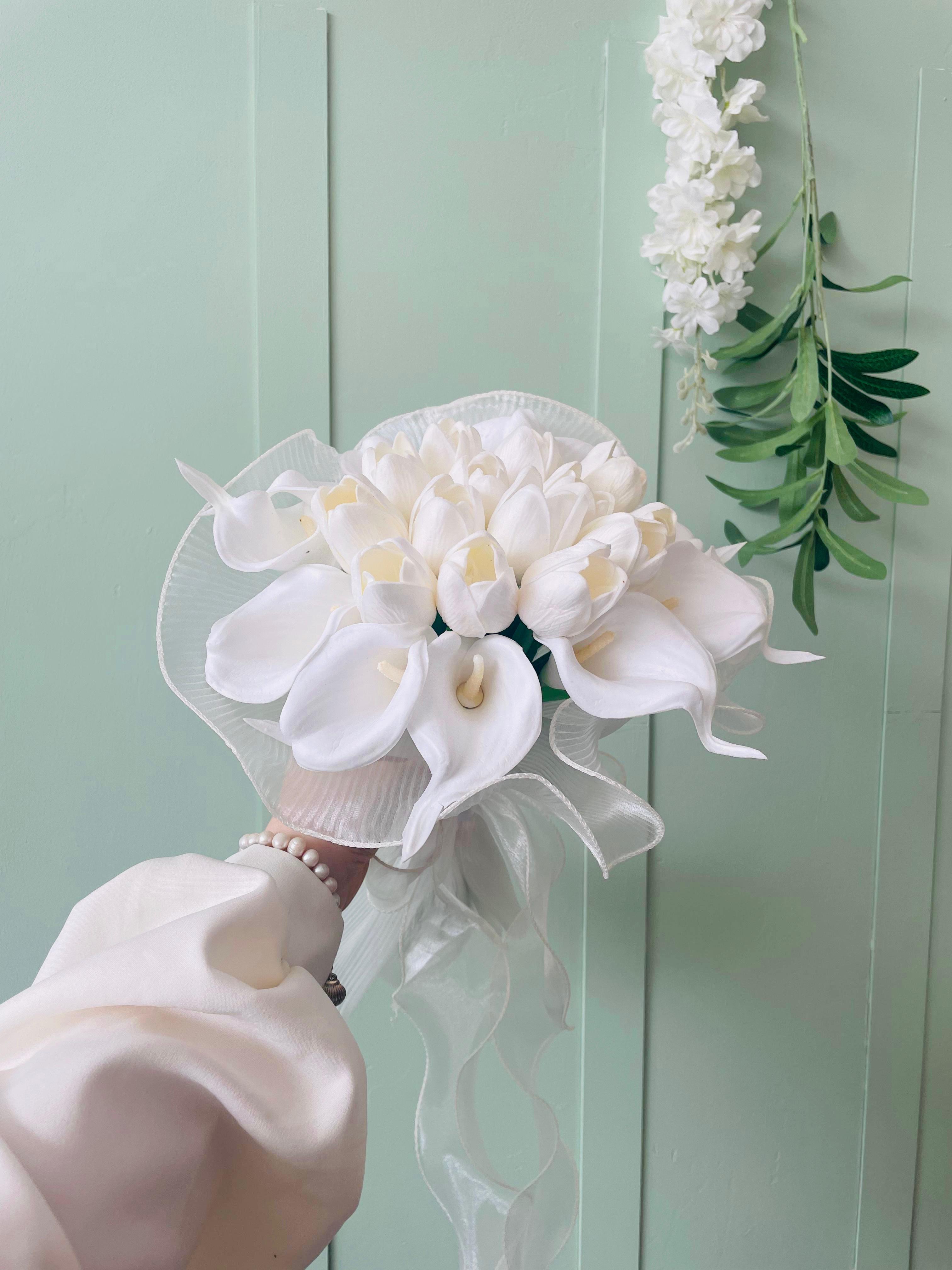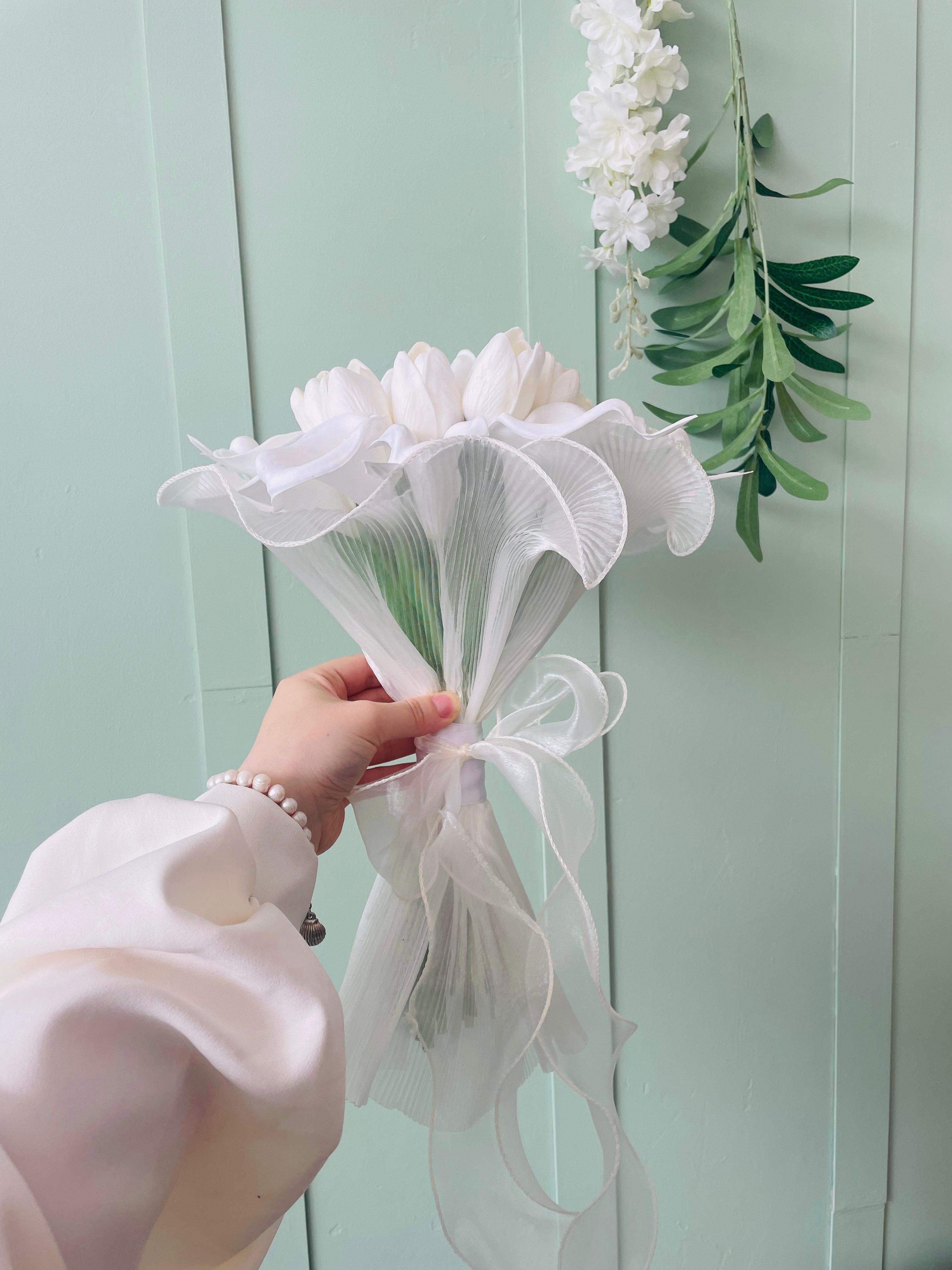 Şıklığı minimal dokunuşlarla taşıyan gelinler için tasarlandı. Tül kaplaması ve yumuşak tonlarıyla düğününüzde göz alıcı bir duruş sunar.? Orta boydur ne büyük ne de küçük. Yaka çiçeği hediyedir. Teslim süresi 15-20 iş günüdür; acil tarihler için not kısmına belirtmeniz yeterlidir.? Ürünlerimiz tamamen el yapımıdır; bu nedenle her buket ve süs benzersizdir. Çiçeklerin yerleşimi ve detayları ufak farklılıklar gösterebilir, bu da ürünlerimize özel bir karakter katar. ?