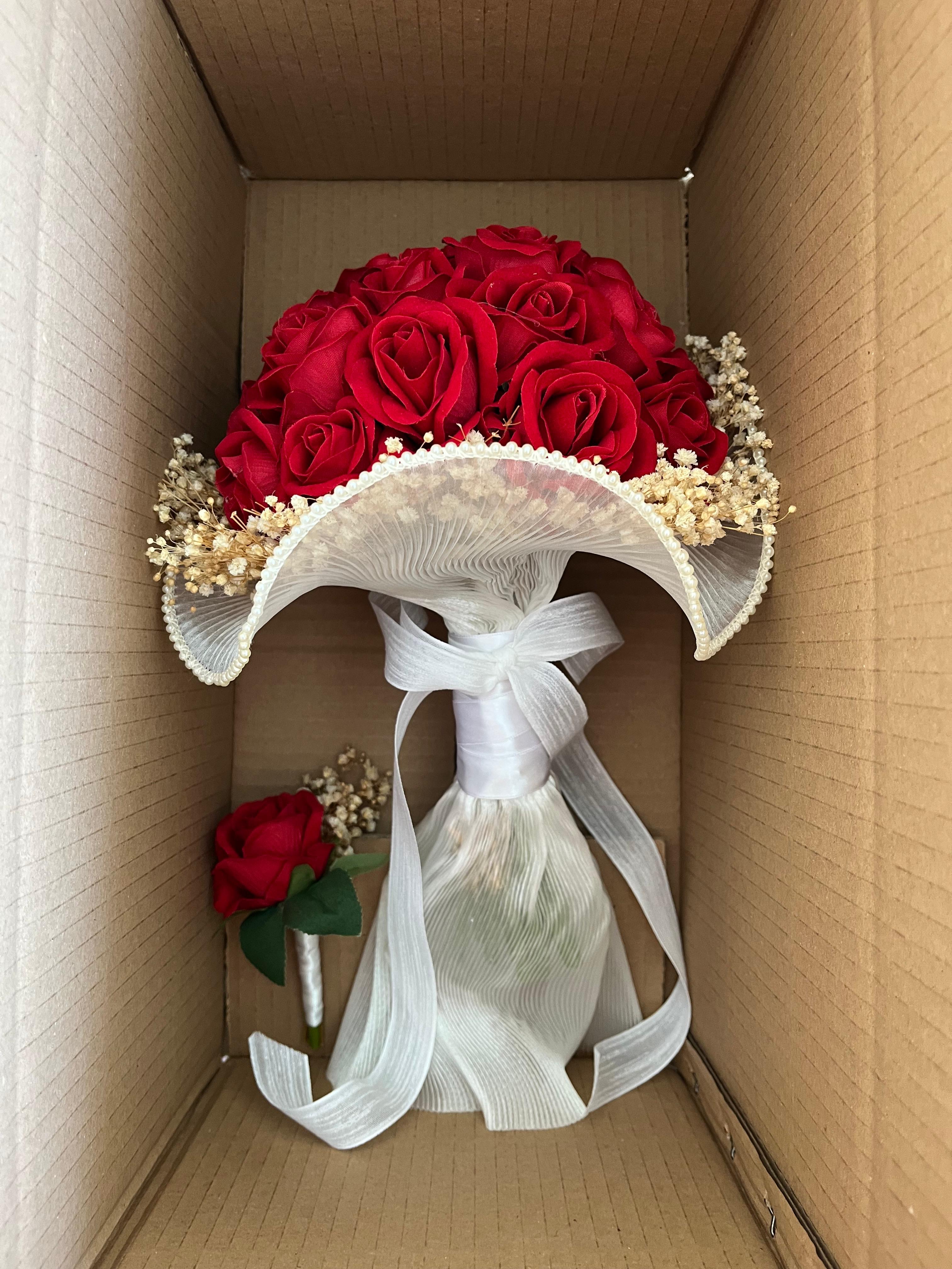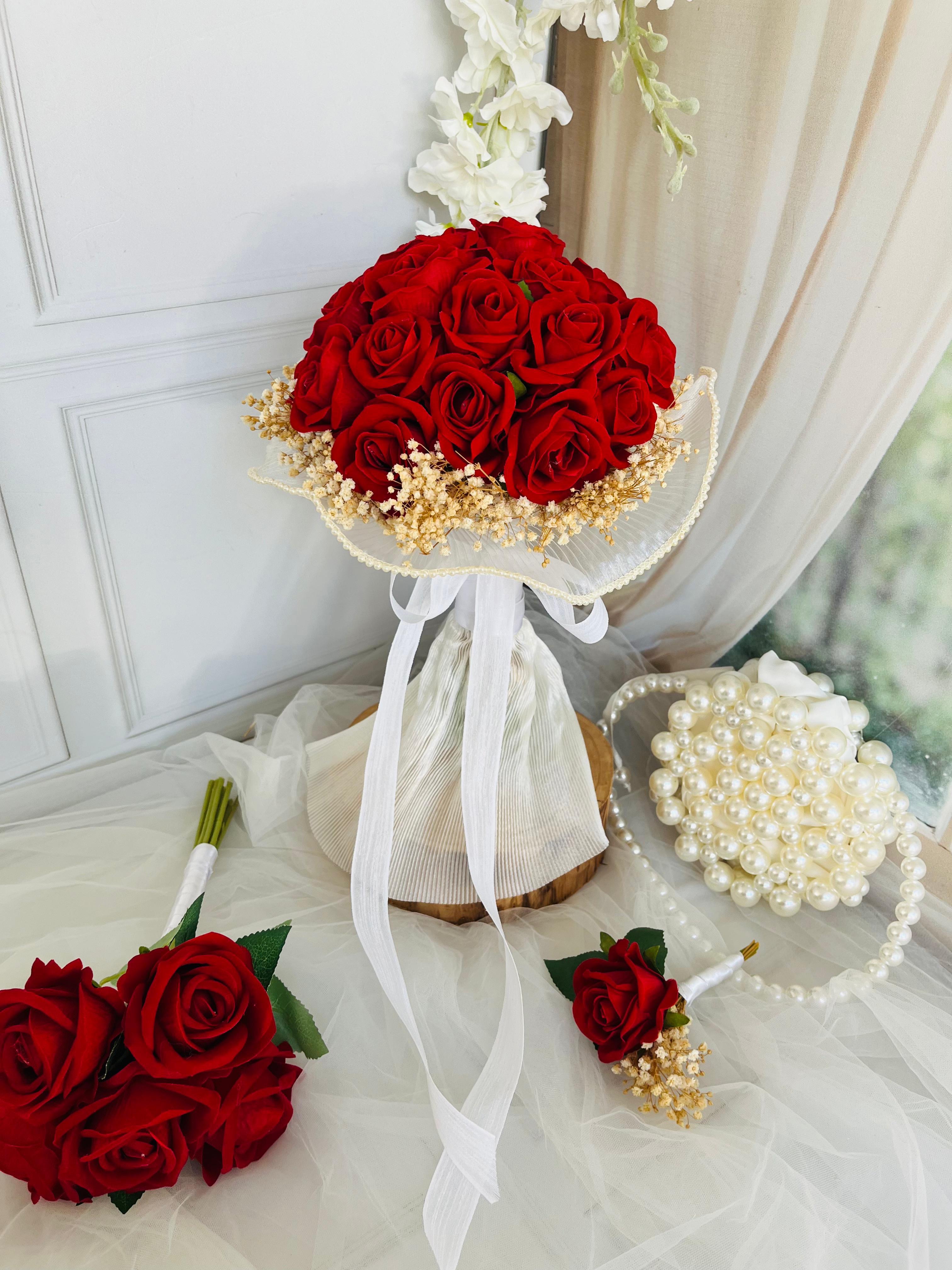 Kırmızı çiçeklerin tutkulu uyumu cipsoların zarif duruşuyla buluşuyor. Güçlü, şık ve etkileyici duruşuyla her anınıza unutulmaz bir asalet katmak için özenle tasarlandı.? Düğün veya nişan için uygundur. Yaka çiçeği hediyedir. Teslim süresi 15-20 iş günüdür; acil tarihler için not kısmına belirtmeniz yeterlidir. ?Ürünlerimiz tamamen el yapımıdır; bu nedenle her buket ve süs benzersizdir. Çiçeklerin yerleşimi ve detayları ufak farklılıklar gösterebilir, bu da ürünlerimize özel bir karakter katar. ?