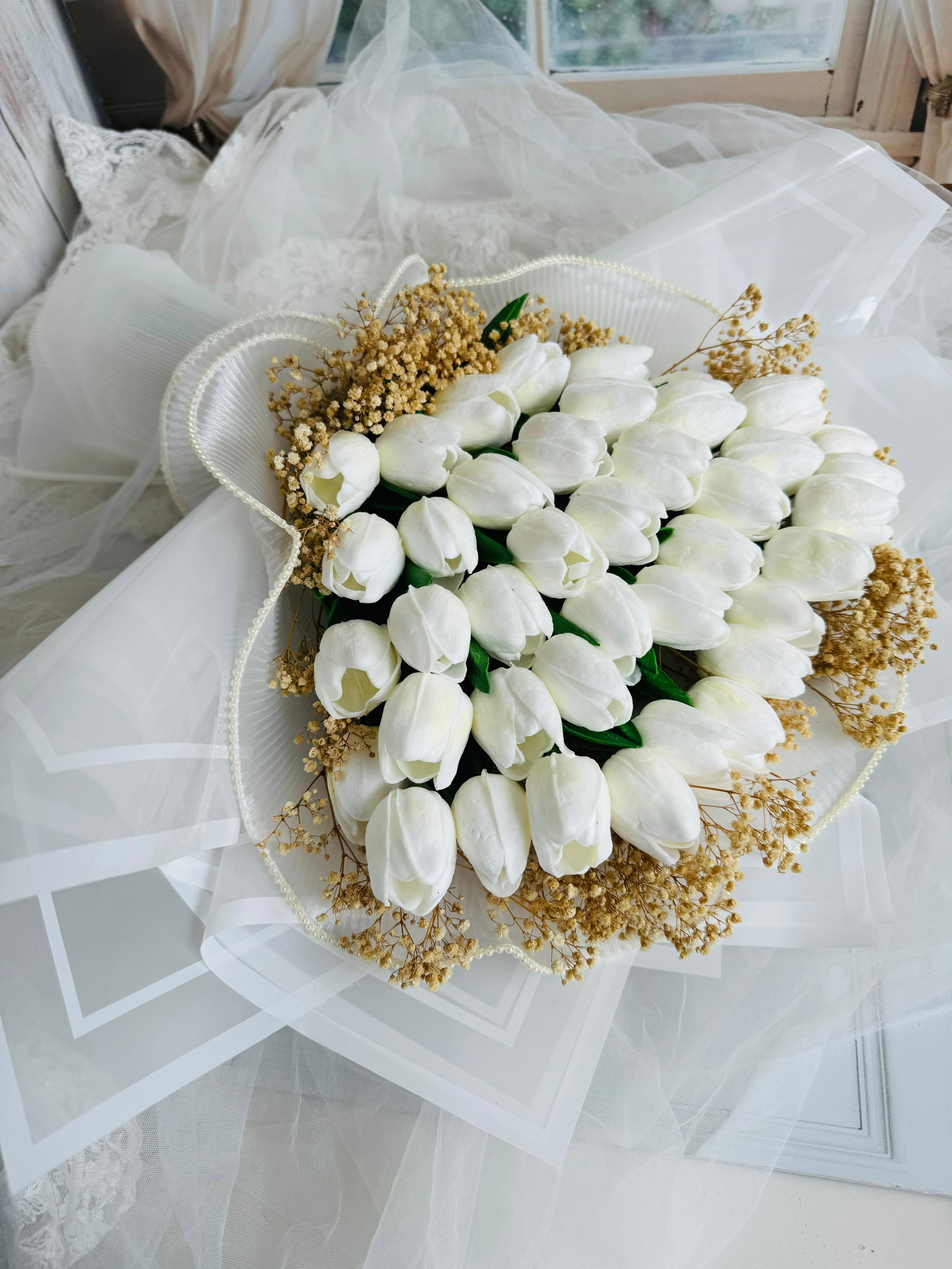 ?Beyaz lalelerin asaleti, cipsoların zarif dokunuşuyla birleşti. Sevginizi en saf haliyle anlatan özel bir isteme ve nişan buketi. 41 adet yapay ıslak laleden oluşuyor. Teslim süresi 15-20 iş günüdür; acil tarihler için not kısmına belirtmeniz yeterlidir. Ürünlerimiz tamamen el yapımıdır; bu nedenle her buket ve süs benzersizdir. Çiçeklerin yerleşimi ve detayları ufak farklılıklar gösterebilir, bu da ürünlerimize özel bir karakter katar. ?