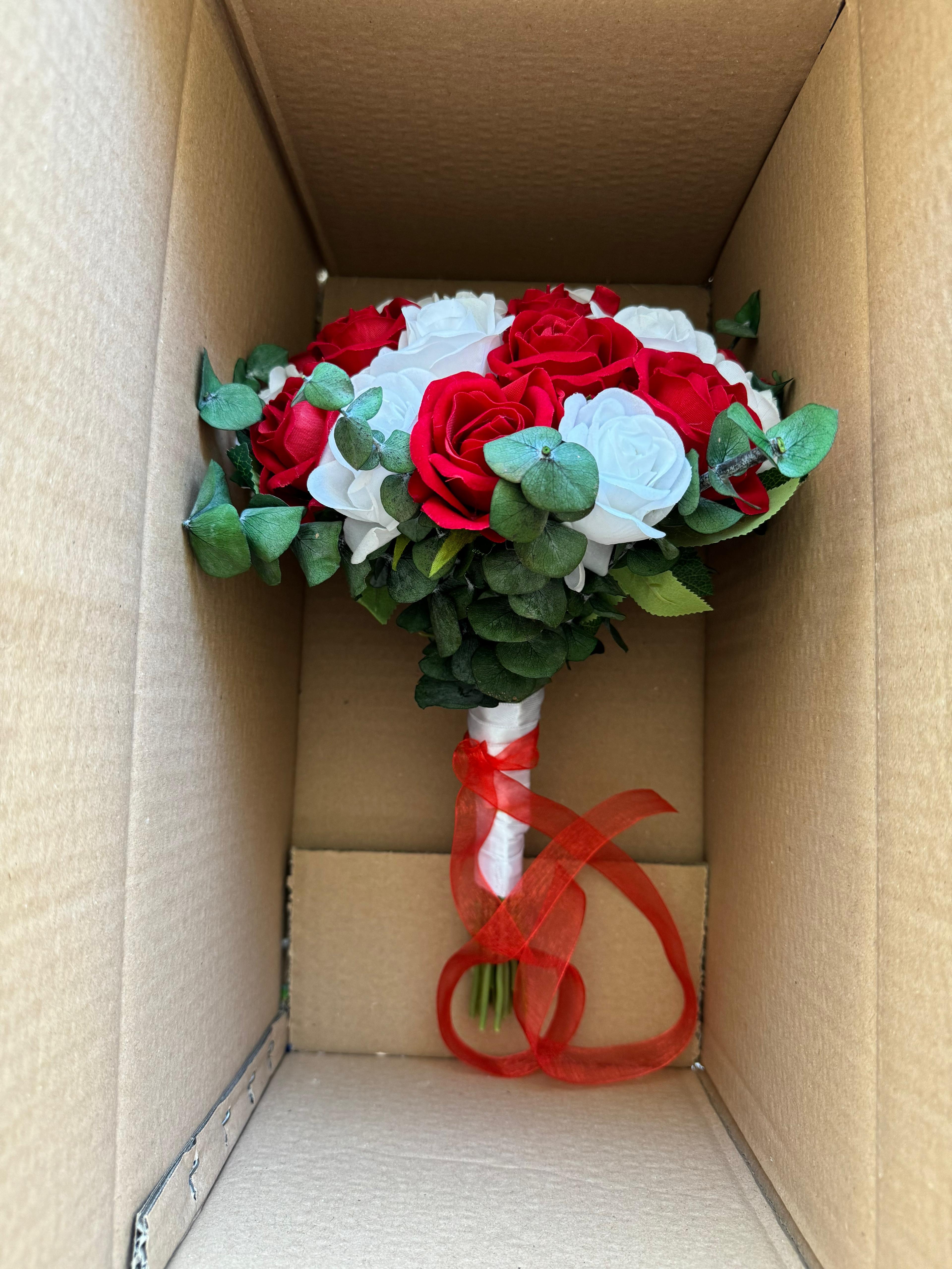 Kırmızı kadife güllerin derin tonları ve beyaz güllerin yumuşak dokusuyla tasarlanan bu buket, özel gününüze zarafet ve romantizmin en özel halini taşır.? Düğün veya nişan için uygundur. Orta boydur ne büyük ne de küçük. Yaka çiçeği hediyedir. Teslim süresi 15-20 iş günüdür; acil tarihler için not kısmına belirtmeniz yeterlidir. ?Ürünlerimiz tamamen el yapımıdır; bu nedenle her buket ve süs benzersizdir. Çiçeklerin yerleşimi ve detayları ufak farklılıklar gösterebilir, bu da ürünlerimize özel bir karakter katar. ?