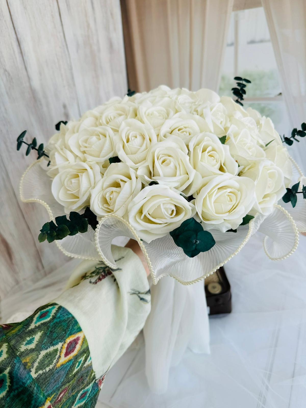 ?Beyazın huzuru, zarafetin modern yorumu. Her anı özel kılmak için tasarlandı. ? Büyük boydur. 41 adet yapay büyük başlı kadife gülden oluşuyor . Teslim süresi 15-20 iş günüdür; acil tarihler için not kısmına belirtmeniz yeterlidir. ?Ürünlerimiz tamamen el yapımıdır; bu nedenle her buket ve süs benzersizdir. Çiçeklerin yerleşimi ve detayları ufak farklılıklar gösterebilir, bu da ürünlerimize özel bir karakter katar. ?