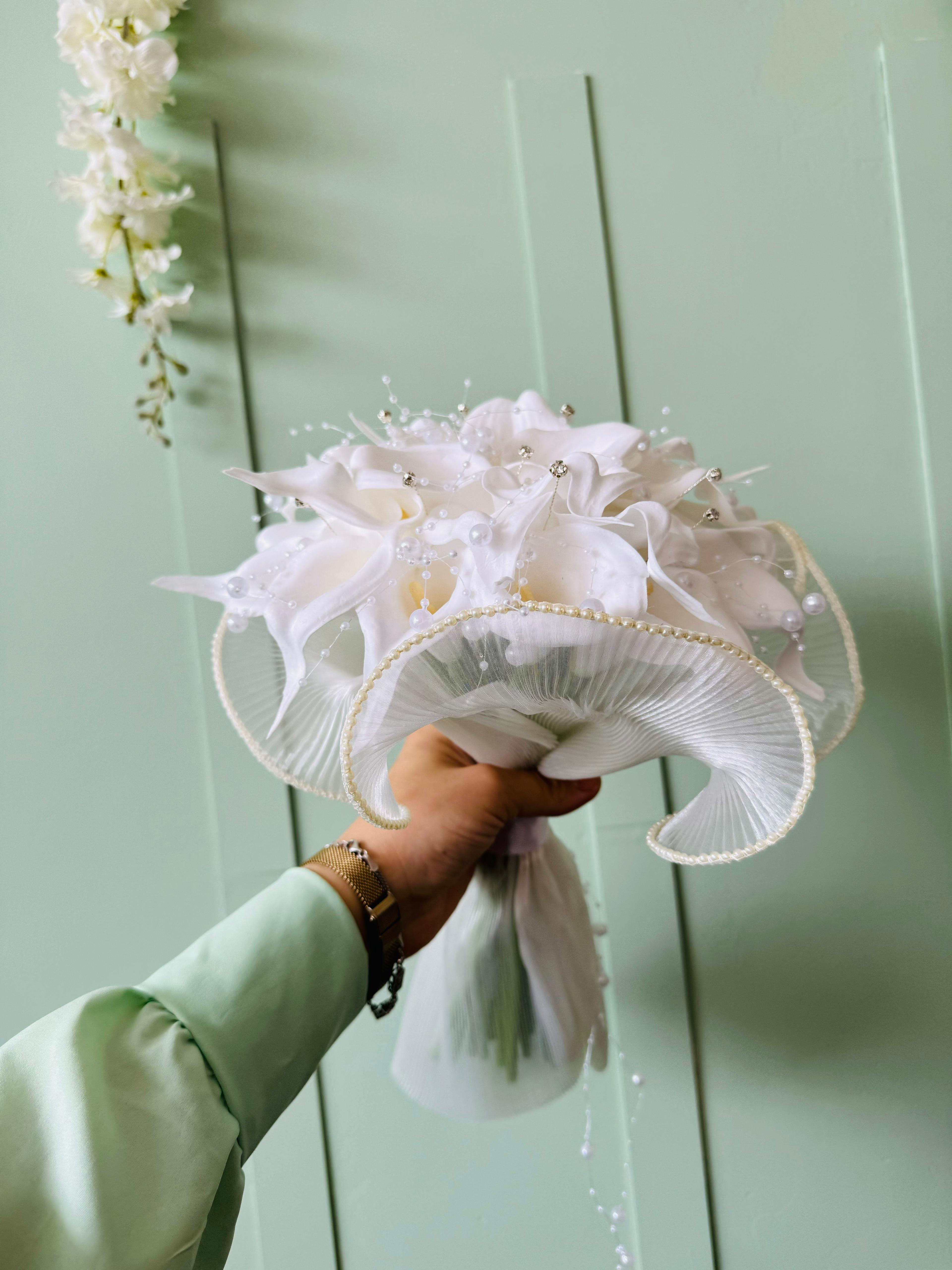 ✨Zarif beyaz galaların tül kaplama ile buluştuğu bu buket, saflığın ve şıklığın en zarif ifadesidir. Özel anlara sade ama etkileyici bir dokunuş katar.? 24 adet yapay ıslak dokulu galadan oluşuyor. Orta boydur ne büyük ne de küçük. Yaka çiçeği hediyedir. Teslim süresi 15-20 iş günüdür; acil tarihler için not kısmına belirtmeniz yeterlidir. ?Ürünlerimiz tamamen el yapımıdır; bu nedenle her buket ve süs benzersizdir. Çiçeklerin yerleşimi ve detayları ufak farklılıklar gösterebilir, bu da ürünlerimize özel bir karakter katar. ?