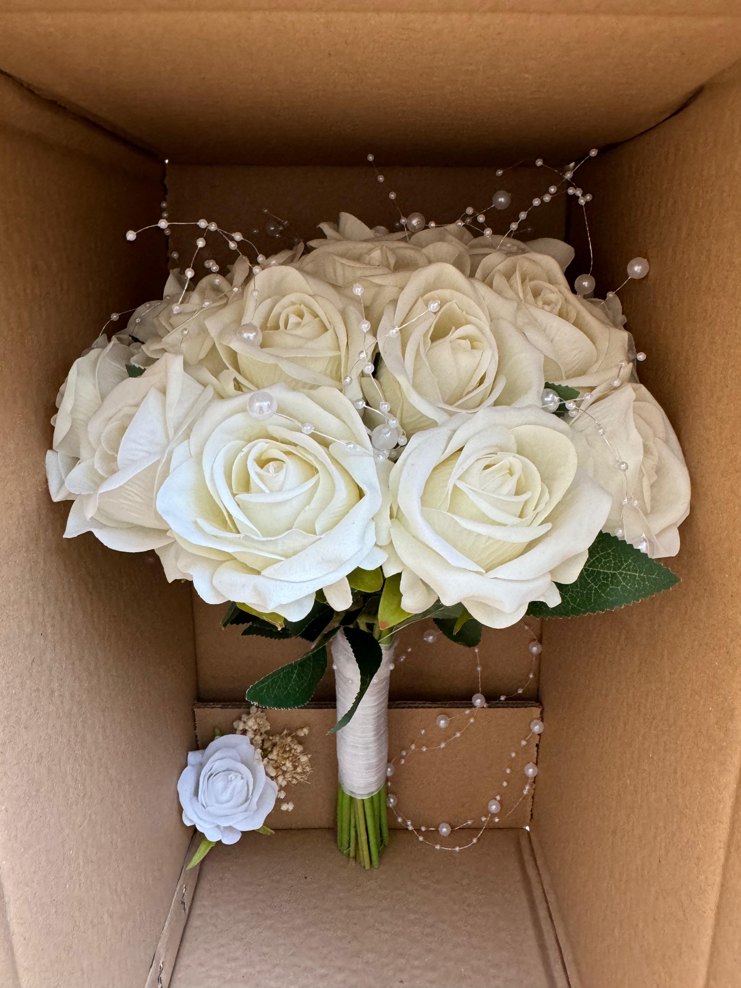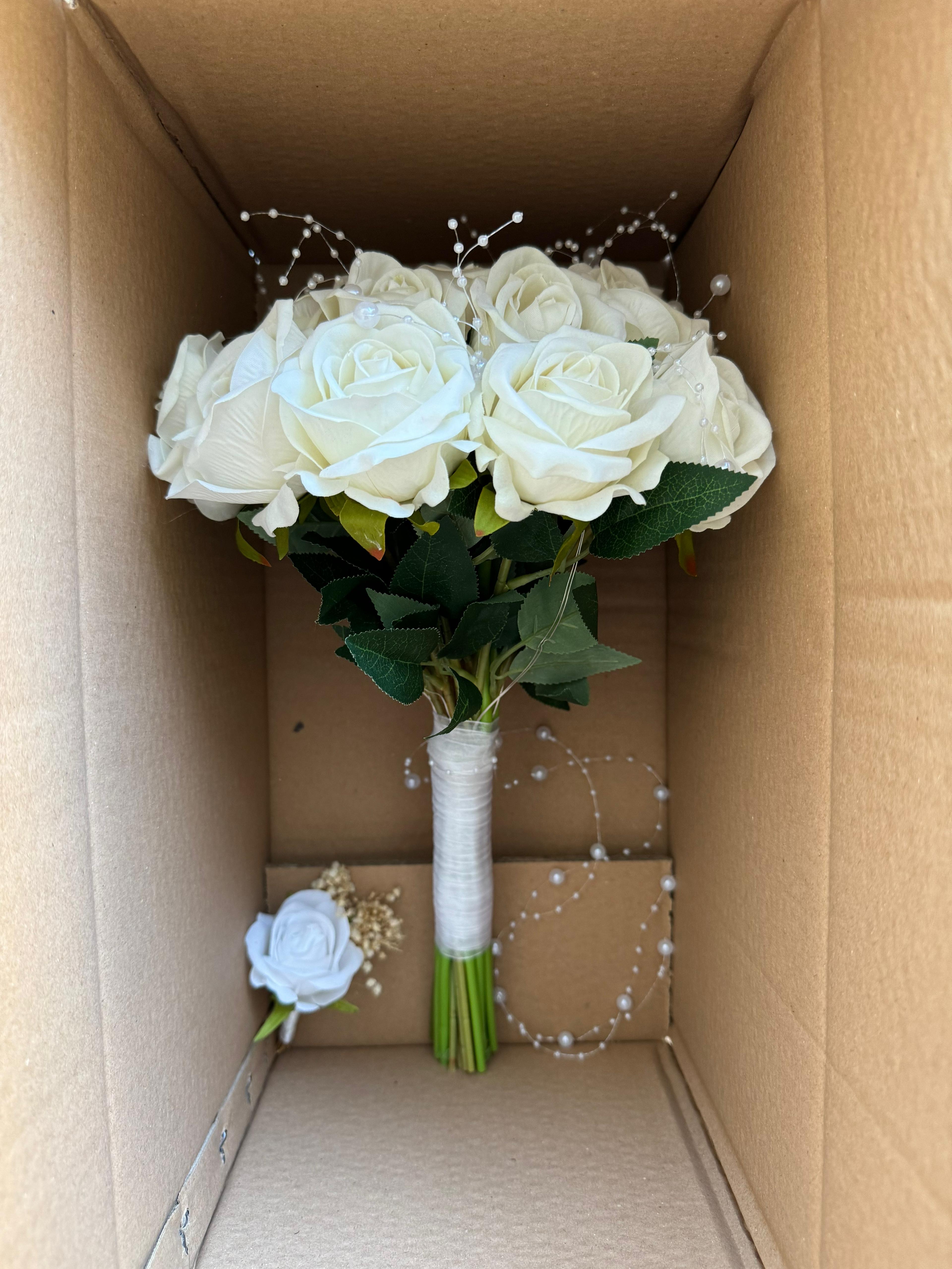?Beyaz güllerin zarif dansıyla hayat bulan bu özel tasarım gelin buketi, aşkın en saf halini yansıtır. Her gül, sevgiyle seçilmiş; her detay, zarafetle örülmüştür. Romantik ruhunu zarif dokunuşlarla ifade etmek isteyen gelinler için tasarlandı. Orta boydur ne büyük ne de küçük . Birinci sınıf kalitedeki kumaş güllerden oluşmaktadır . Yaka çiçeği hediyedir. Teslim süresi 15-20 iş günüdür; acil tarihler için not kısmına belirtmeniz yeterlidir. ? ?Ürünlerimiz tamamen el yapımıdır; bu nedenle her buket ve süs benzersizdir. Çiçeklerin yerleşimi ve detayları ufak farklılıklar gösterebilir, bu da ürünlerimize özel bir karakter katar. ?