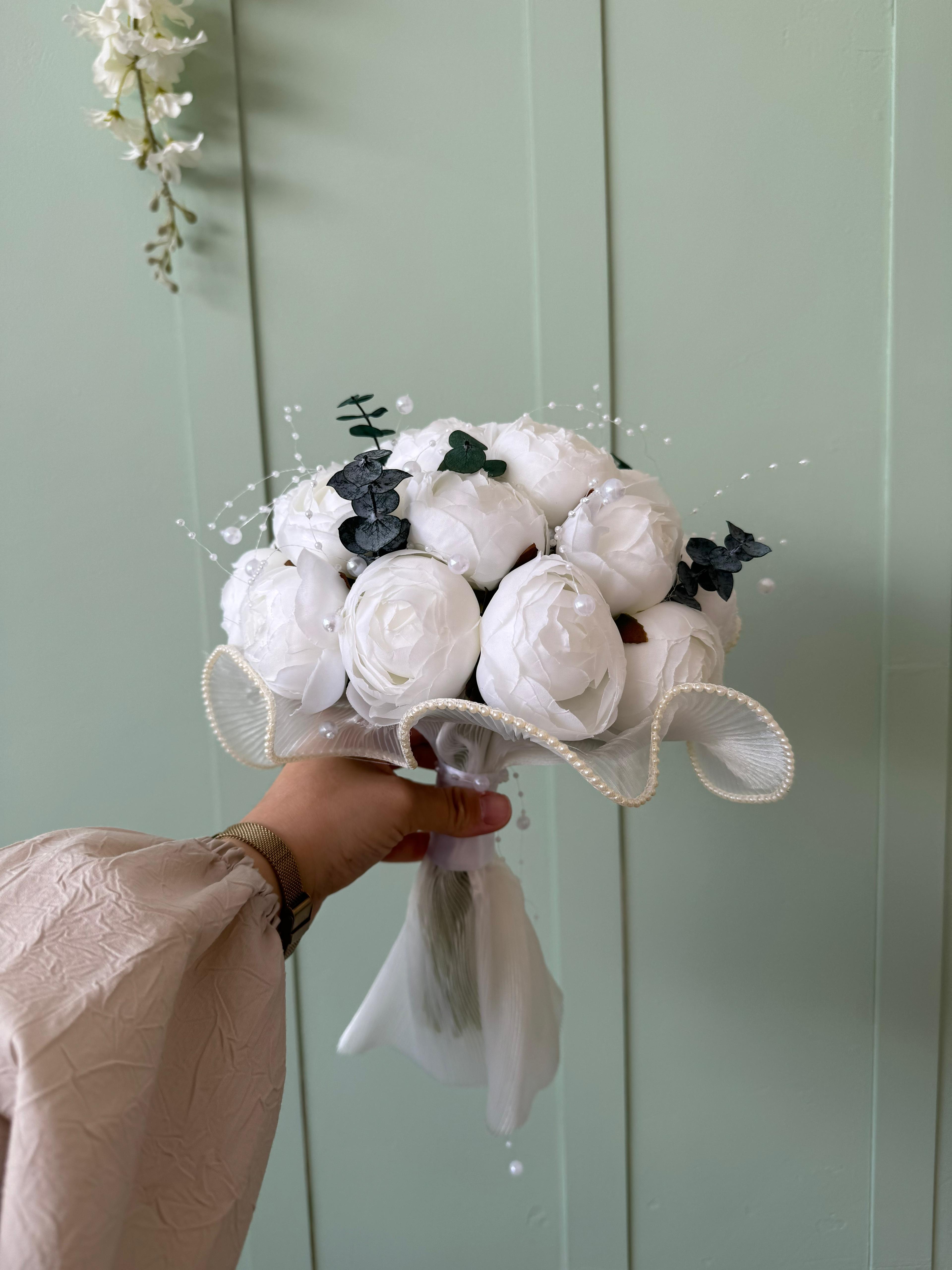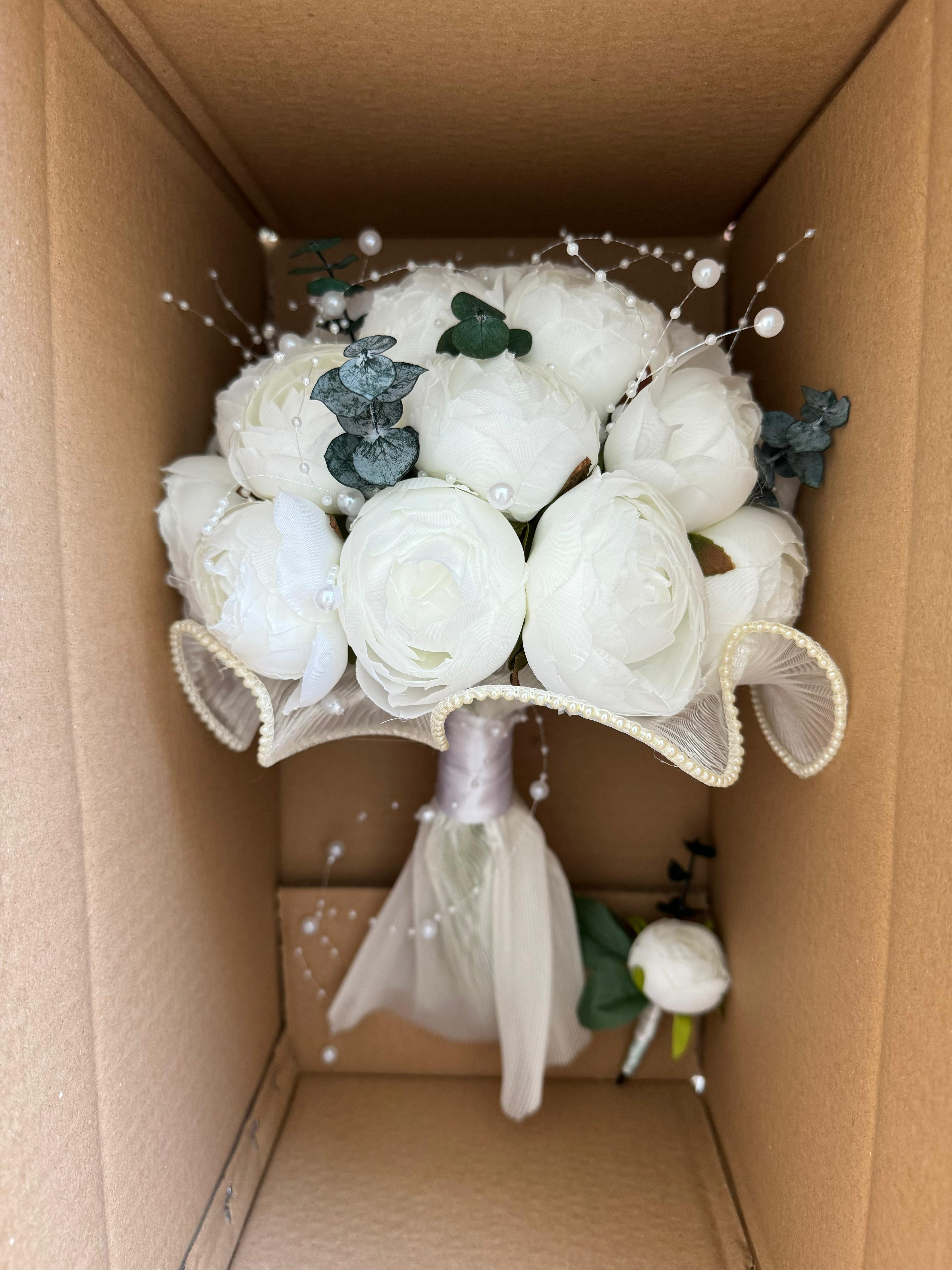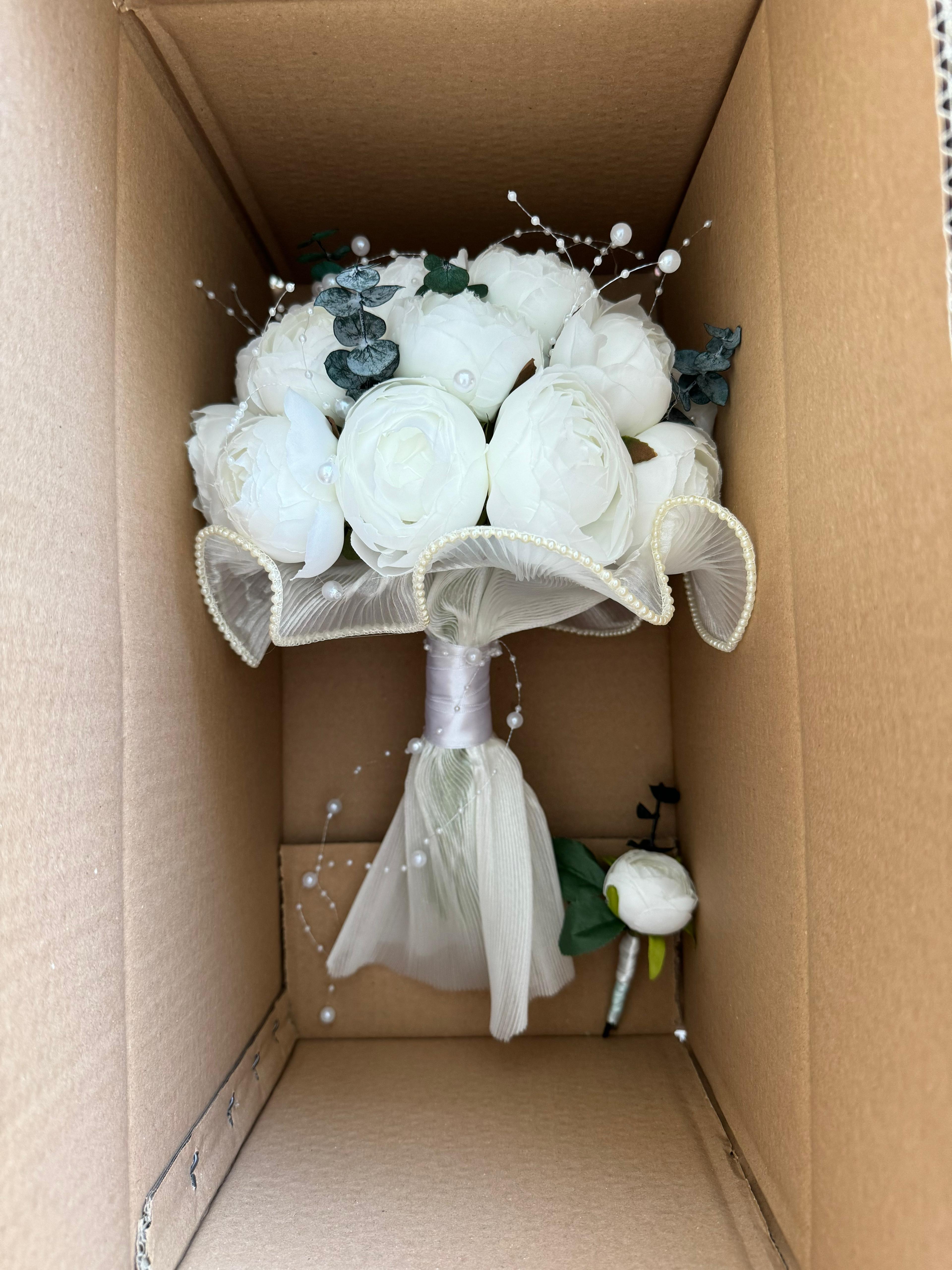 ?Gerçek çiçek görünümündeki birinci sınıf kumaş çiçeklerle hazırlanmıştır. Zarif ve sade tasarımıyla her gelinliğe uyum sağlar. Orta boydur ne büyük ne de küçük . Yaka çiçeği hediyedir. Teslim süresi 15-20 iş günüdür; acil tarihler için not kısmına belirtmeniz yeterlidir.? Ürünlerimiz tamamen el yapımıdır; bu nedenle her buket ve süs benzersizdir. Çiçeklerin yerleşimi ve detayları ufak farklılıklar gösterebilir, bu da ürünlerimize özel bir karakter katar. ?