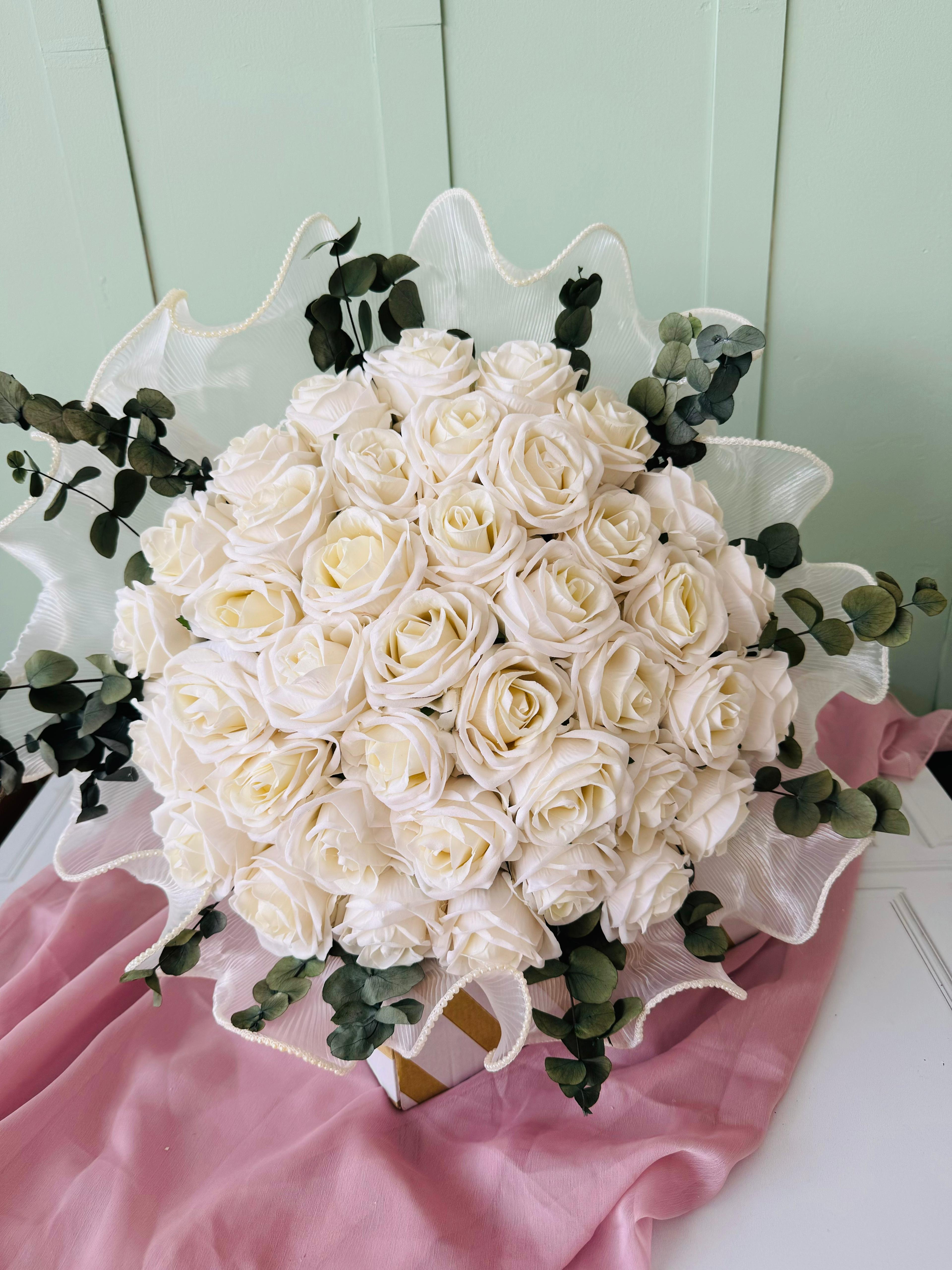?Beyazın huzuru, zarafetin modern yorumu. Her anı özel kılmak için tasarlandı. ? Büyük boydur. 41 adet yapay büyük başlı kadife gülden oluşuyor . Teslim süresi 15-20 iş günüdür; acil tarihler için not kısmına belirtmeniz yeterlidir. ?Ürünlerimiz tamamen el yapımıdır; bu nedenle her buket ve süs benzersizdir. Çiçeklerin yerleşimi ve detayları ufak farklılıklar gösterebilir, bu da ürünlerimize özel bir karakter katar. ?