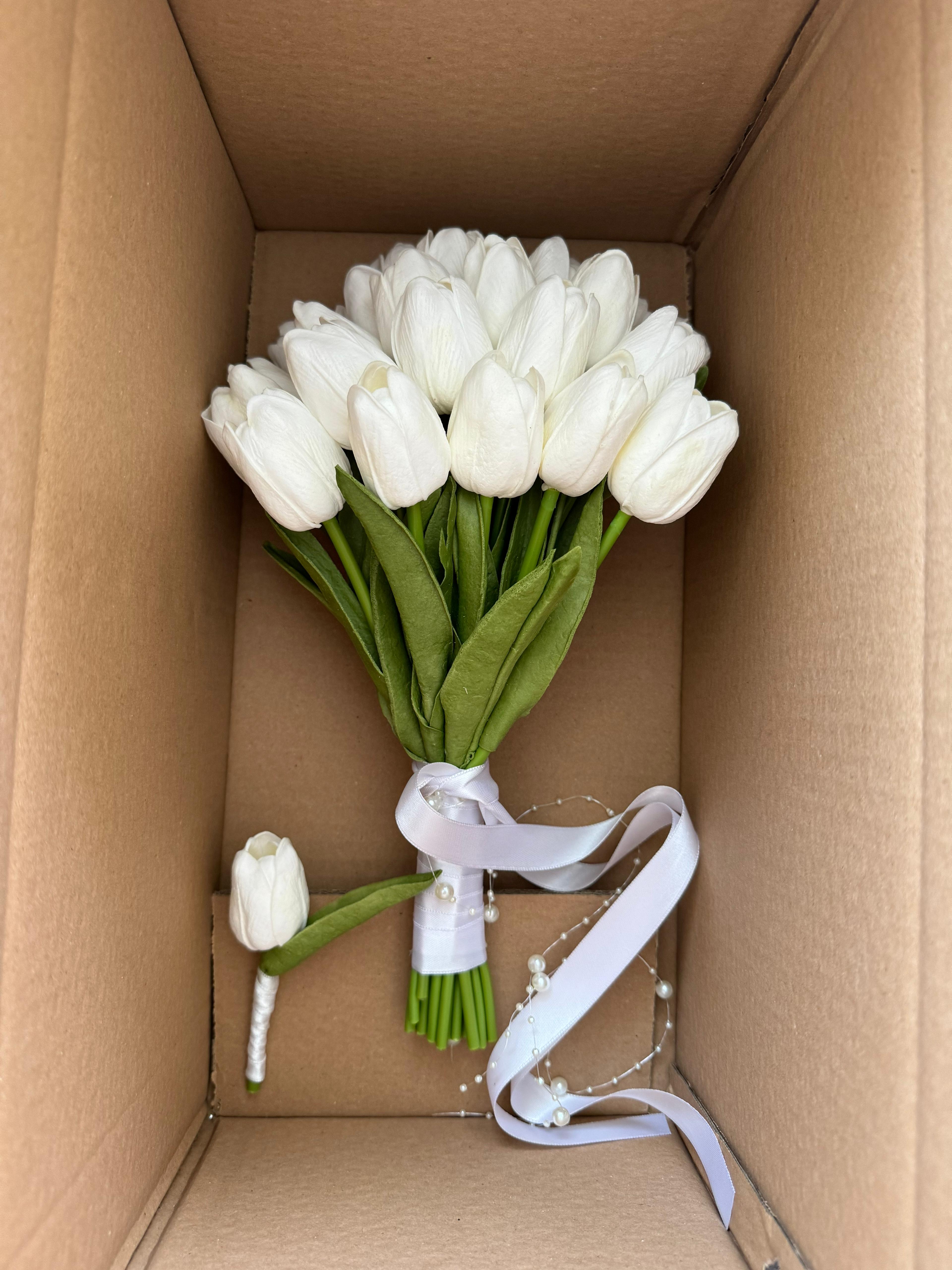 Beyaz lalelerin sade zarafeti sofistike bir görünüm sundu. Temiz, minimal bir gelin buketi arayanlar için ideal seçimdir.? 30 adet yapay ıslak dokulu laleden oluşuyor. Orta boydur ne büyük ne de küçük. Yaka çiçeği hediyedir. Teslim süresi 15-20 iş günüdür; acil tarihler için not kısmına belirtmeniz yeterlidir. ?Ürünlerimiz tamamen el yapımıdır; bu nedenle her buket ve süs benzersizdir. Çiçeklerin yerleşimi ve detayları ufak farklılıklar gösterebilir, bu da ürünlerimize özel bir karakter katar. ?
