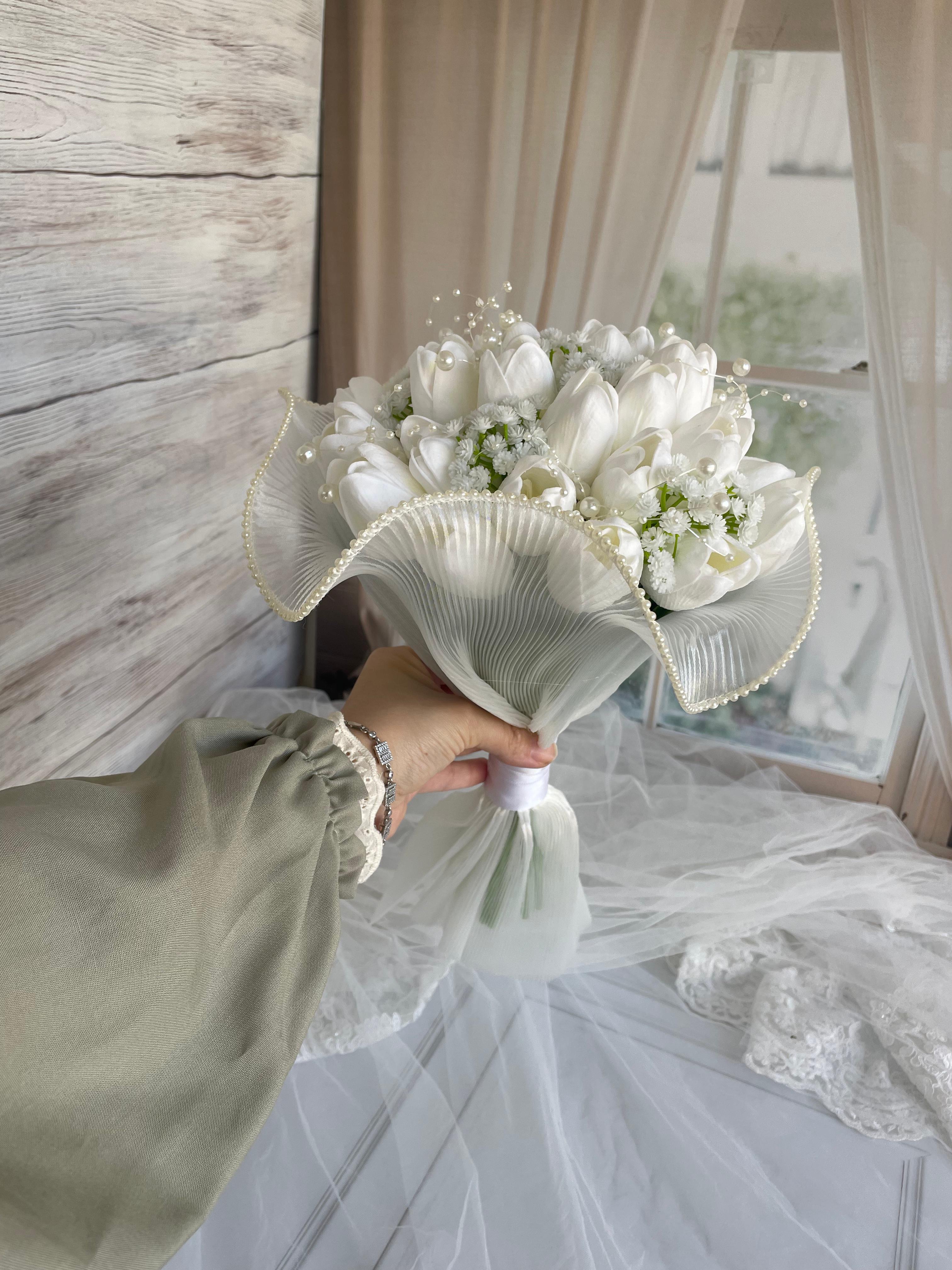 Beyaz lalelerin sade zarafeti, cipsolar ile birleşerek sofistike bir görünüm sundu. Temiz, minimal bir gelin buket arayanlar için ideal seçimdir.? Orta boydur ne büyük ne de küçük. Yaka çiçeği hediyedir. Teslim süresi 15-20 iş günüdür; acil tarihler için not kısmına belirtmeniz yeterlidir. ?Ürünlerimiz tamamen el yapımıdır; bu nedenle her buket ve süs benzersizdir. Çiçeklerin yerleşimi ve detayları ufak farklılıklar gösterebilir, bu da ürünlerimize özel bir karakter katar. ?