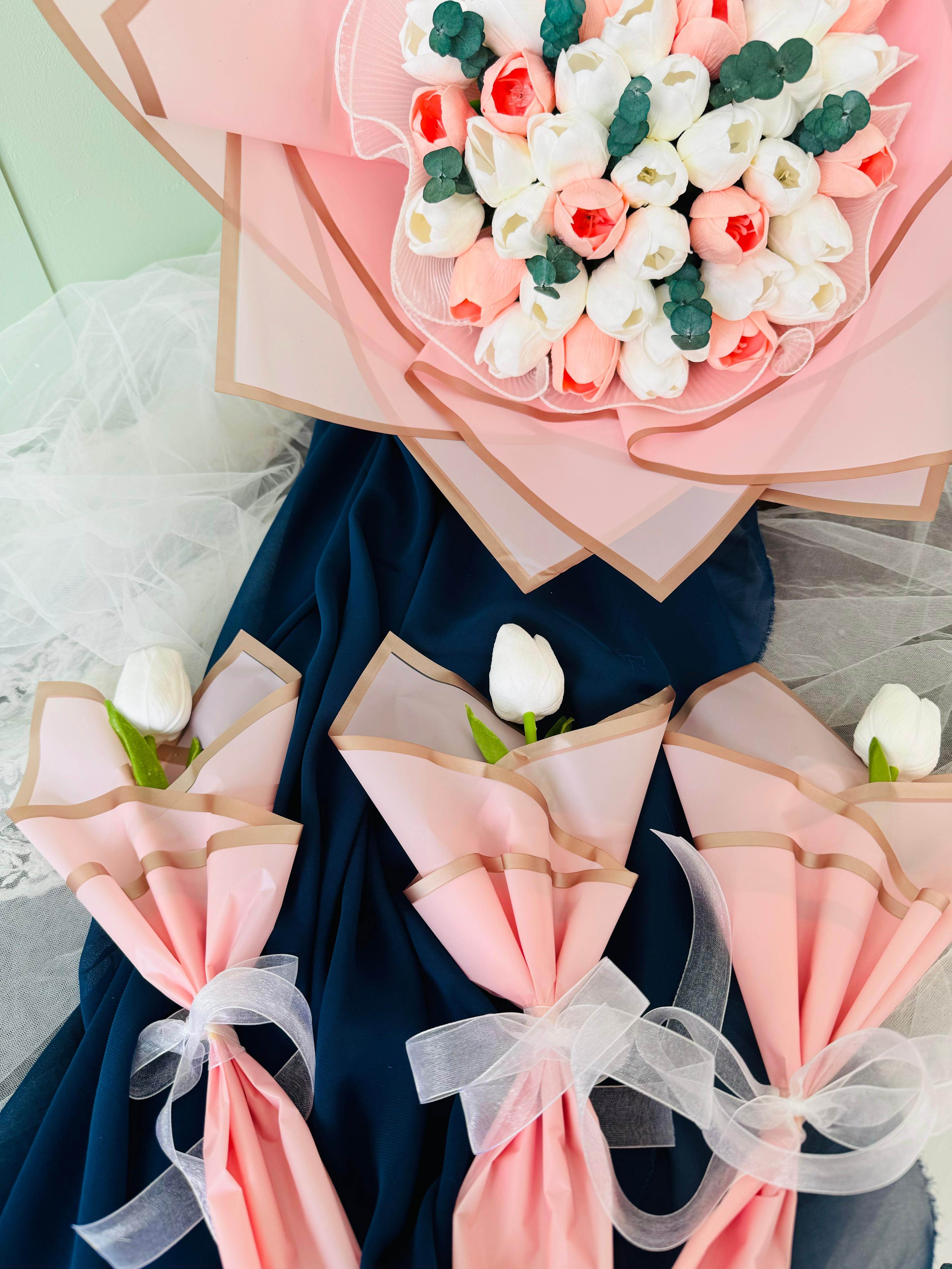 ?Beyaz lalelerin asaleti ile hazırlanan bu buket özel anlarınıza zarafet katar. Sevginizi en saf haliyle anlatan özel bir isteme ve nişan buketi. 50 adet yapay ıslak laleden oluşuyor. Teslim süresi 15-20 iş günüdür; acil tarihler için not kısmına belirtmeniz yeterlidir. Ürünlerimiz tamamen el yapımıdır; bu nedenle her buket ve süs benzersizdir. Çiçeklerin yerleşimi ve detayları ufak farklılıklar gösterebilir, bu da ürünlerimize özel bir karakter katar. ?
