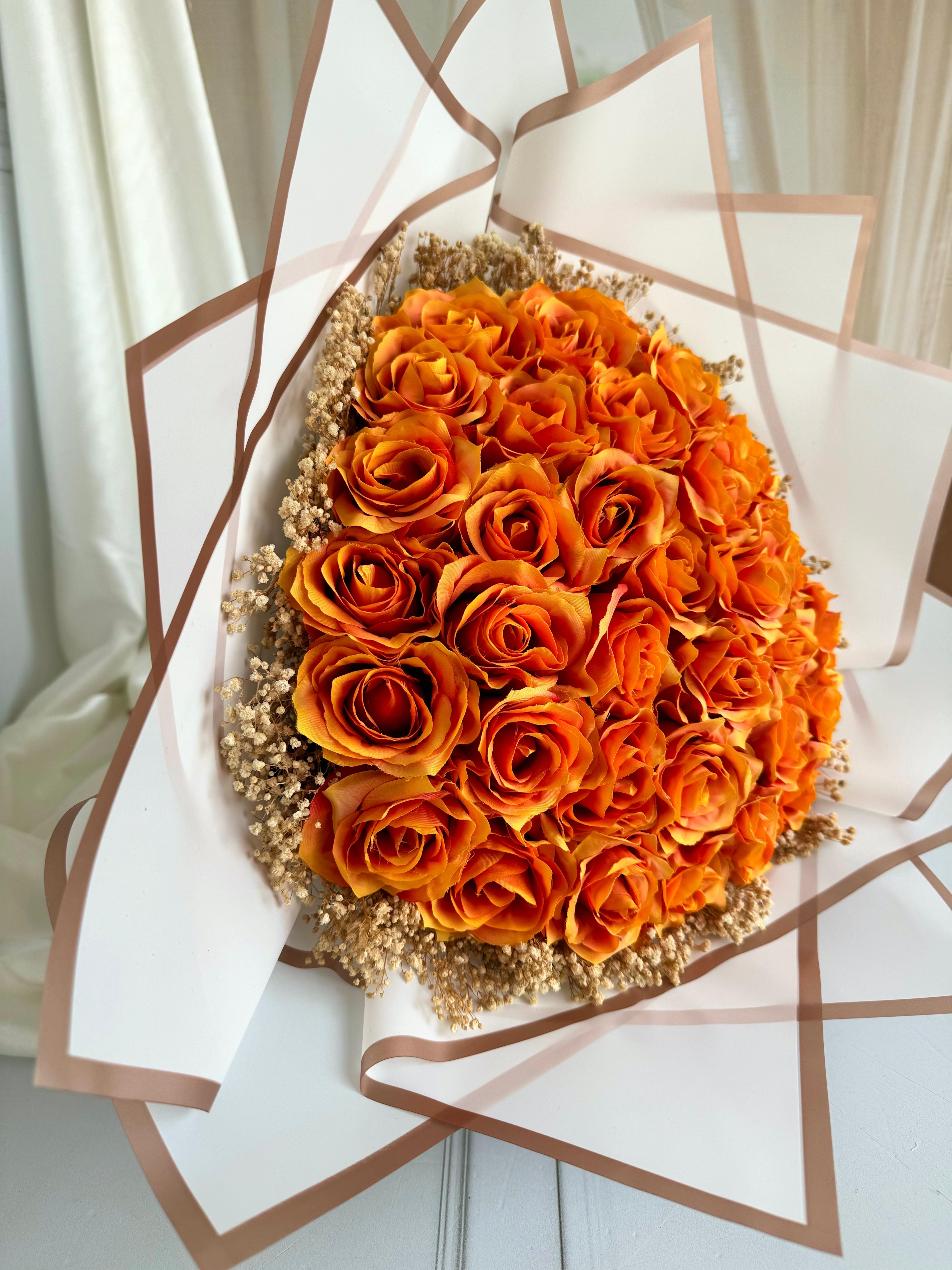 Turuncunun enerjisi ile hazırlanan bu buket ,özel gününüzde ortama farklı bir hava katar. Her detayıyla özel, her bakışıyla unutulmaz. Teslim süresi 15-20 iş günüdür; acil tarihler için not kısmına belirtmeniz yeterlidir. ? ?Ürünlerimiz tamamen el yapımıdır; bu nedenle her buket ve süs benzersizdir. Çiçeklerin yerleşimi ve detayları ufak farklılıklar gösterebilir, bu da ürünlerimize özel bir karakter katar. ?
