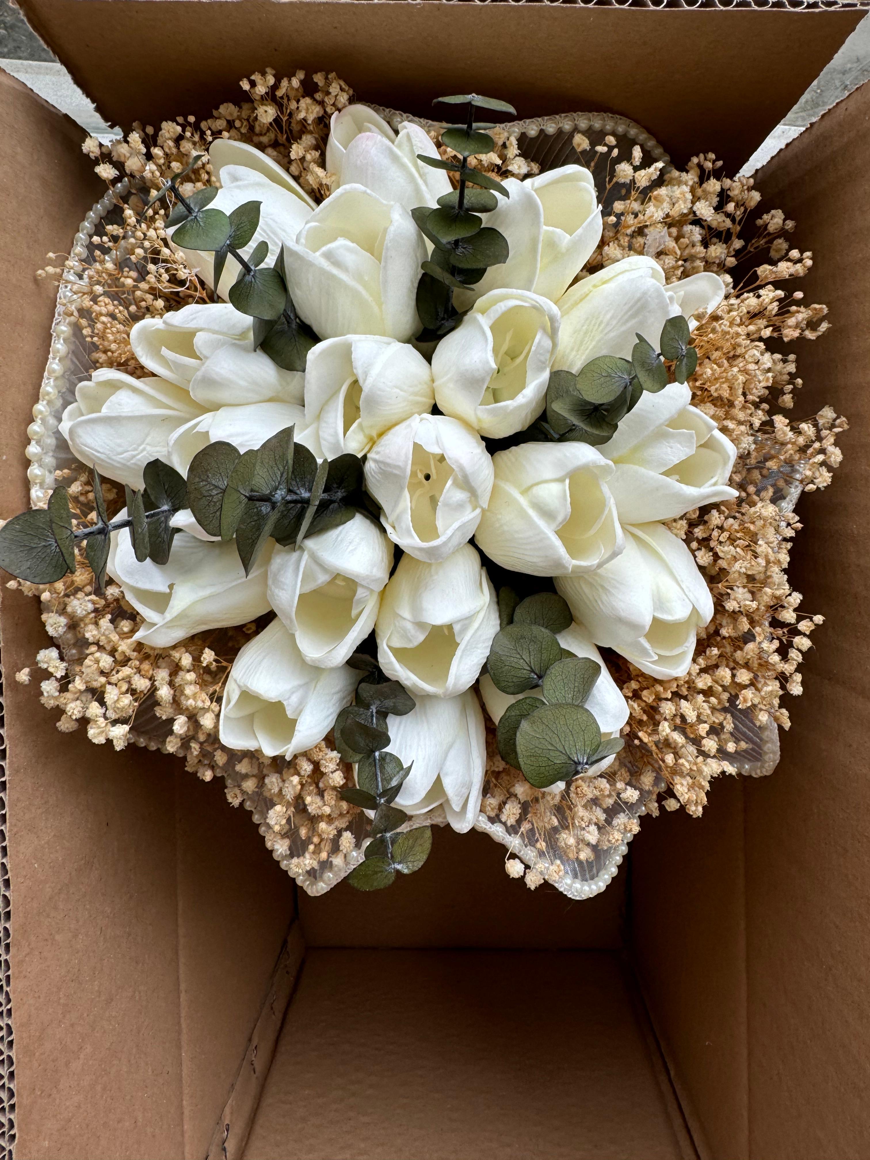 Beyaz lalelerin sade zarafeti, cipsolar ile birleşerek sofistike bir görünüm sundu. Temiz, minimal bir gelin buket arayanlar için ideal seçimdir.? Orta boydur ne büyük ne de küçük. Yaka çiçeği hediyedir. Teslim süresi 15-20 iş günüdür; acil tarihler için not kısmına belirtmeniz yeterlidir. ?Ürünlerimiz tamamen el yapımıdır; bu nedenle her buket ve süs benzersizdir. Çiçeklerin yerleşimi ve detayları ufak farklılıklar gösterebilir, bu da ürünlerimize özel bir karakter katar. ?