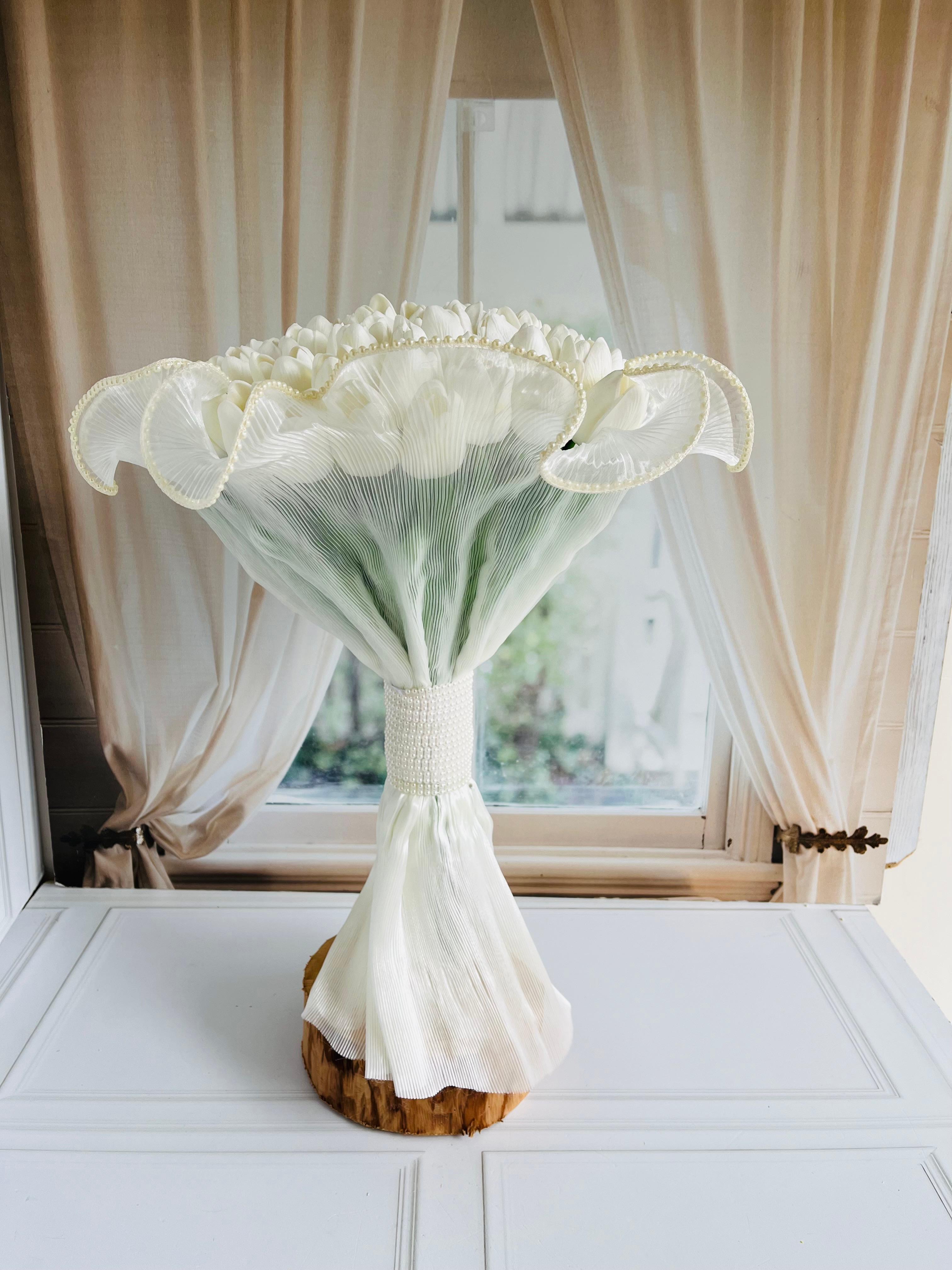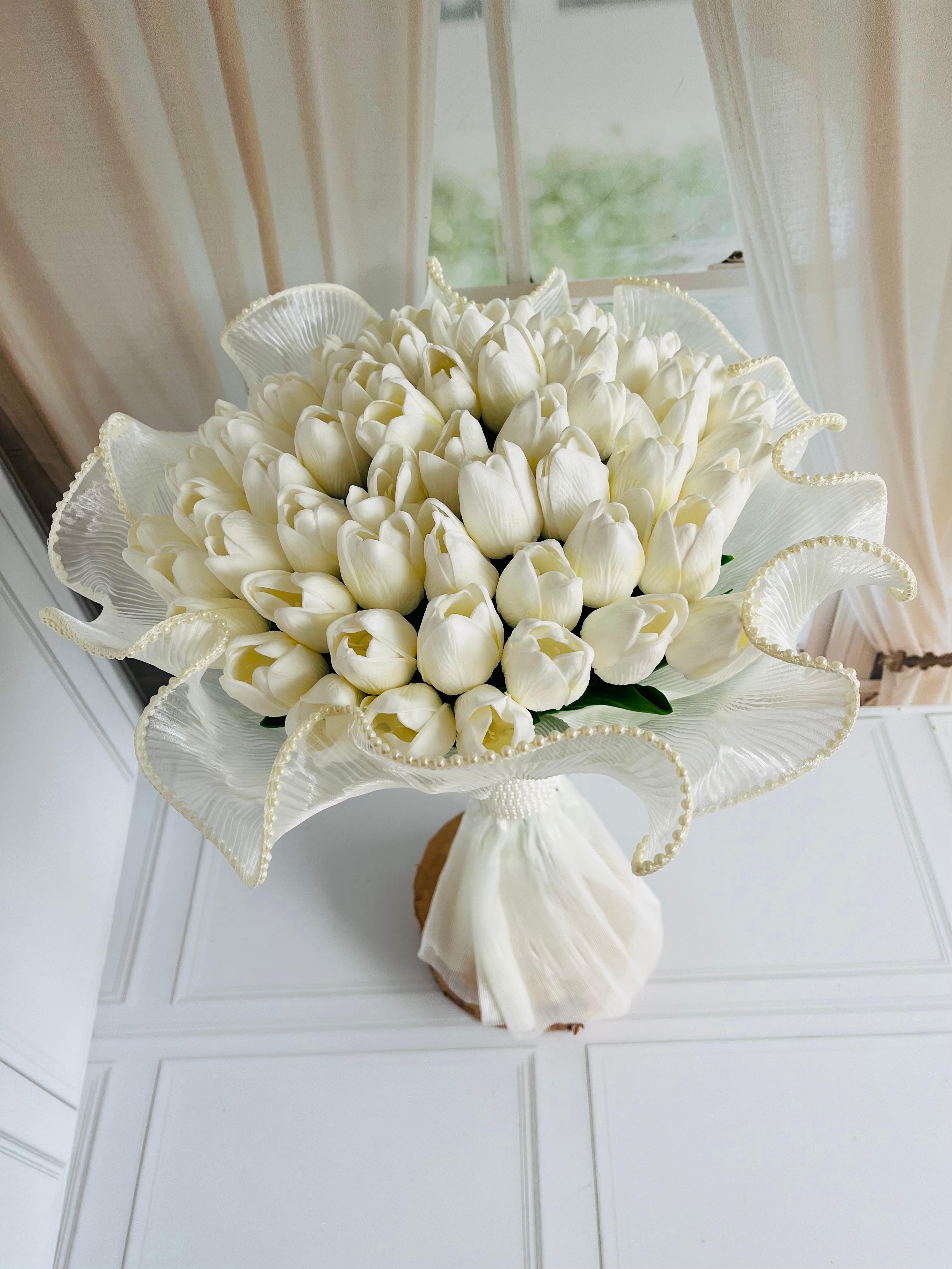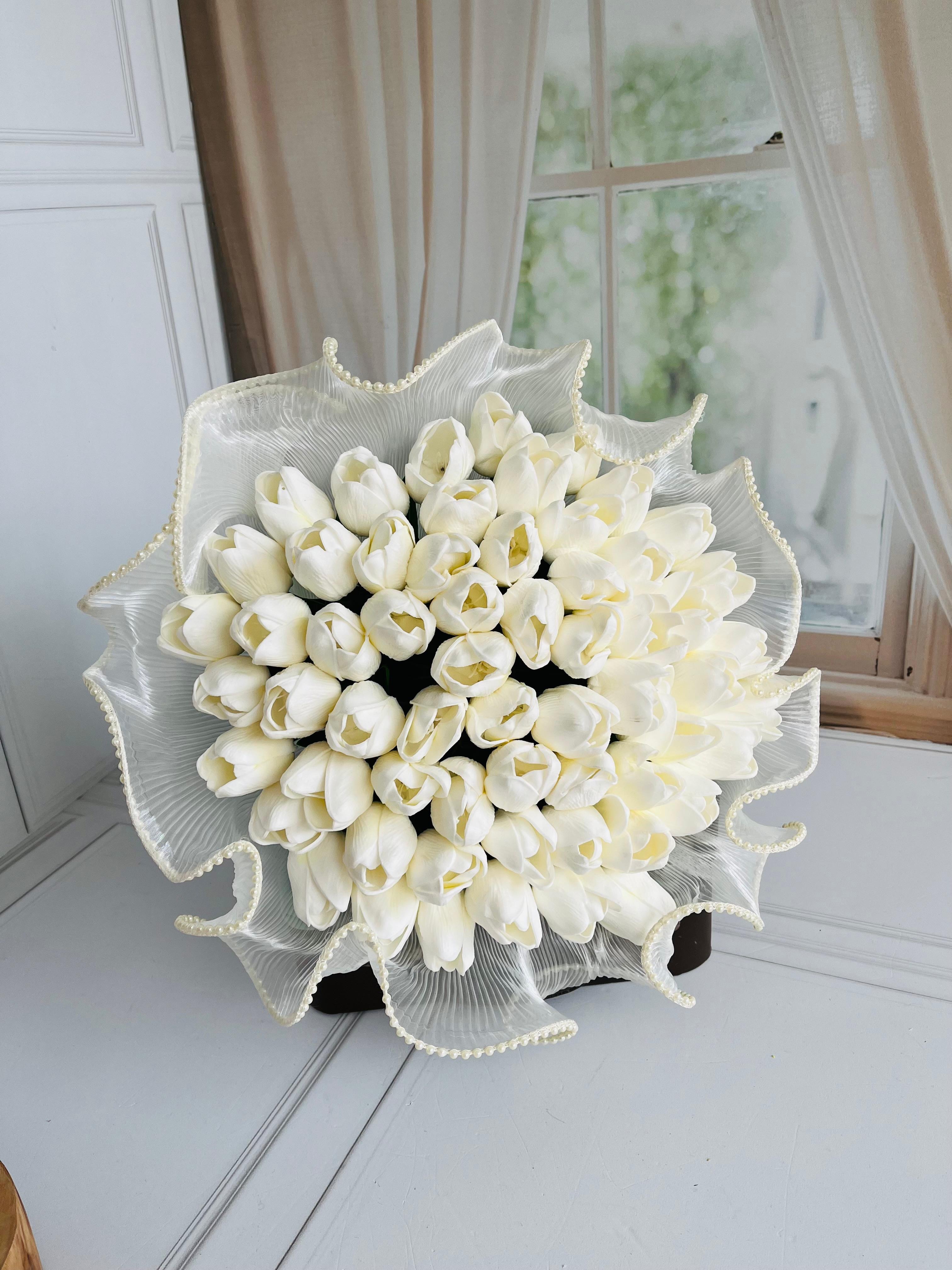 ?Beyaz lalelerin asaleti ile hazırlanan bu buket özel anlarınıza zarafet katar. Sevginizi en saf haliyle anlatan özel bir isteme ve nişan buketi. 60 adet yapay ıslak laleden oluşuyor. Teslim süresi 15-20 iş günüdür; acil tarihler için not kısmına belirtmeniz yeterlidir. Ürünlerimiz tamamen el yapımıdır; bu nedenle her buket ve süs benzersizdir. Çiçeklerin yerleşimi ve detayları ufak farklılıklar gösterebilir, bu da ürünlerimize özel bir karakter katar. ?