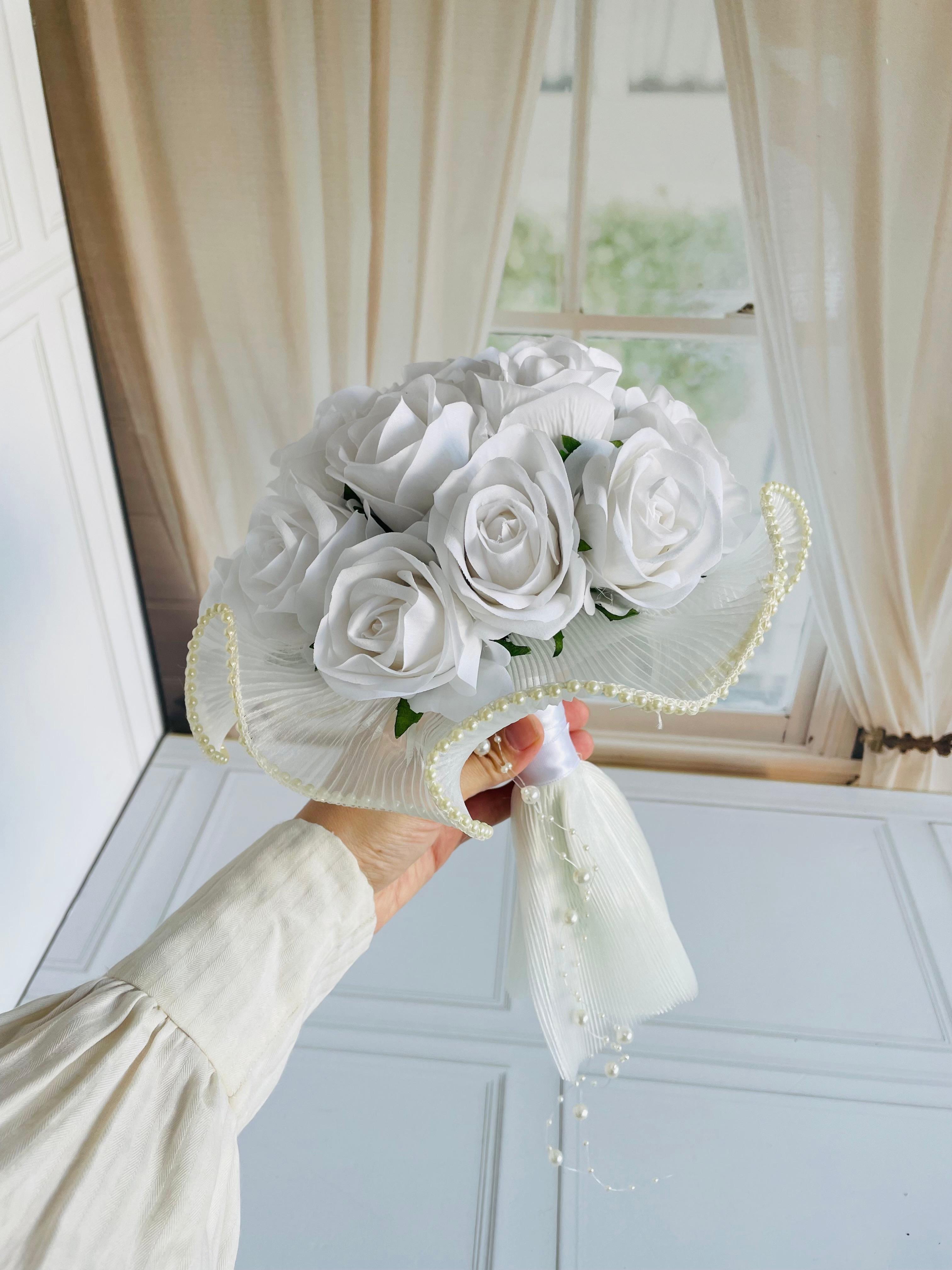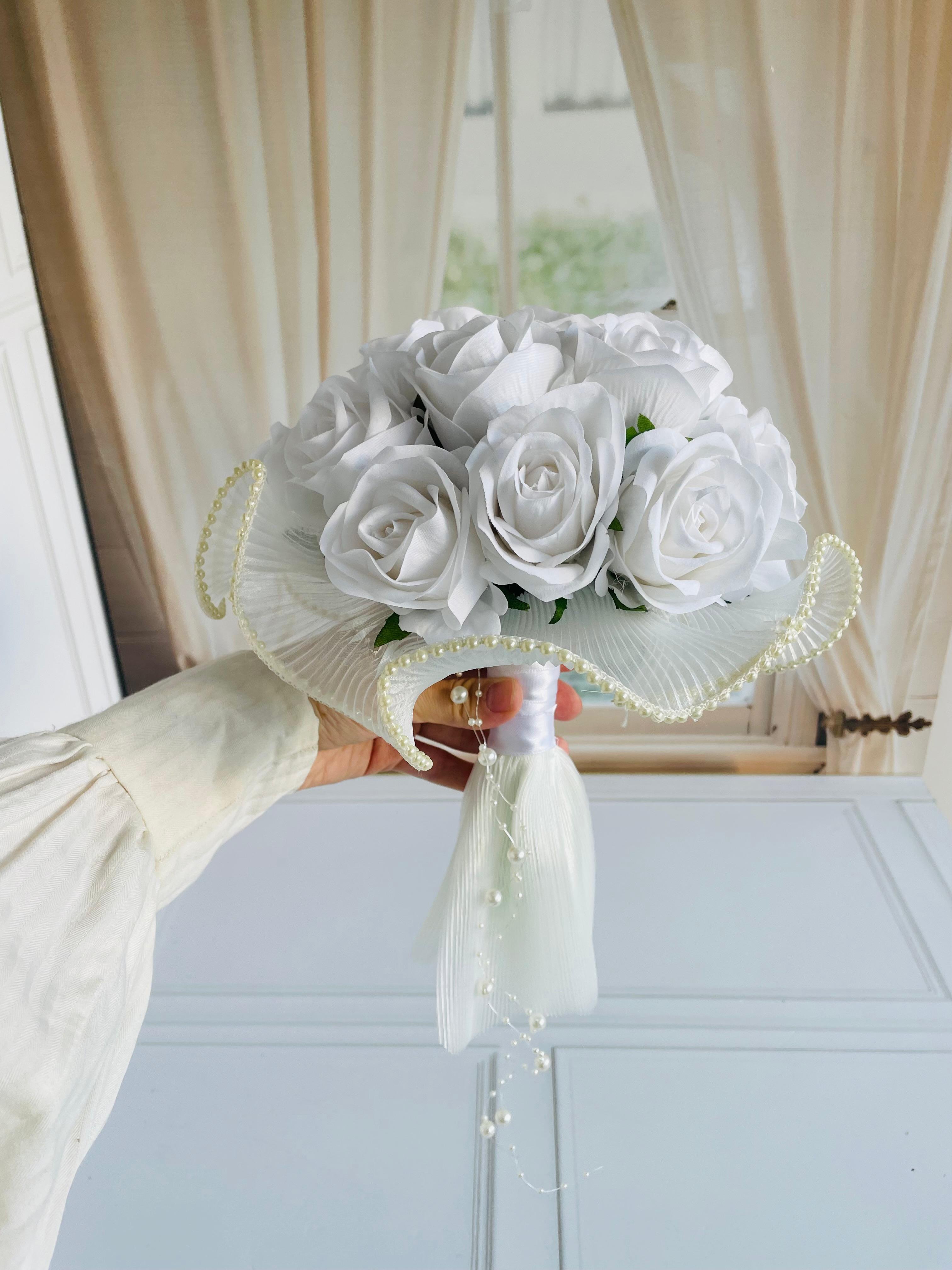 ?Minimal, zarif ve göz alıcı.. Beyaz güllerin masum dokunuşu, incili tülle birleşti. Sade ama etkileyici bir gelin stili arayanlar için tasarlandı.? Yaka çiçeği hediyedir. Orta boydur ne büyük ne de küçük. Teslim süresi 15-20 iş günüdür; acil tarihler için not kısmına belirtmeniz yeterlidir. ?Ürünlerimiz tamamen el yapımıdır; bu nedenle her buket ve süs benzersizdir. Çiçeklerin yerleşimi ve detayları ufak farklılıklar gösterebilir, bu da ürünlerimize özel bir karakter katar. ?
