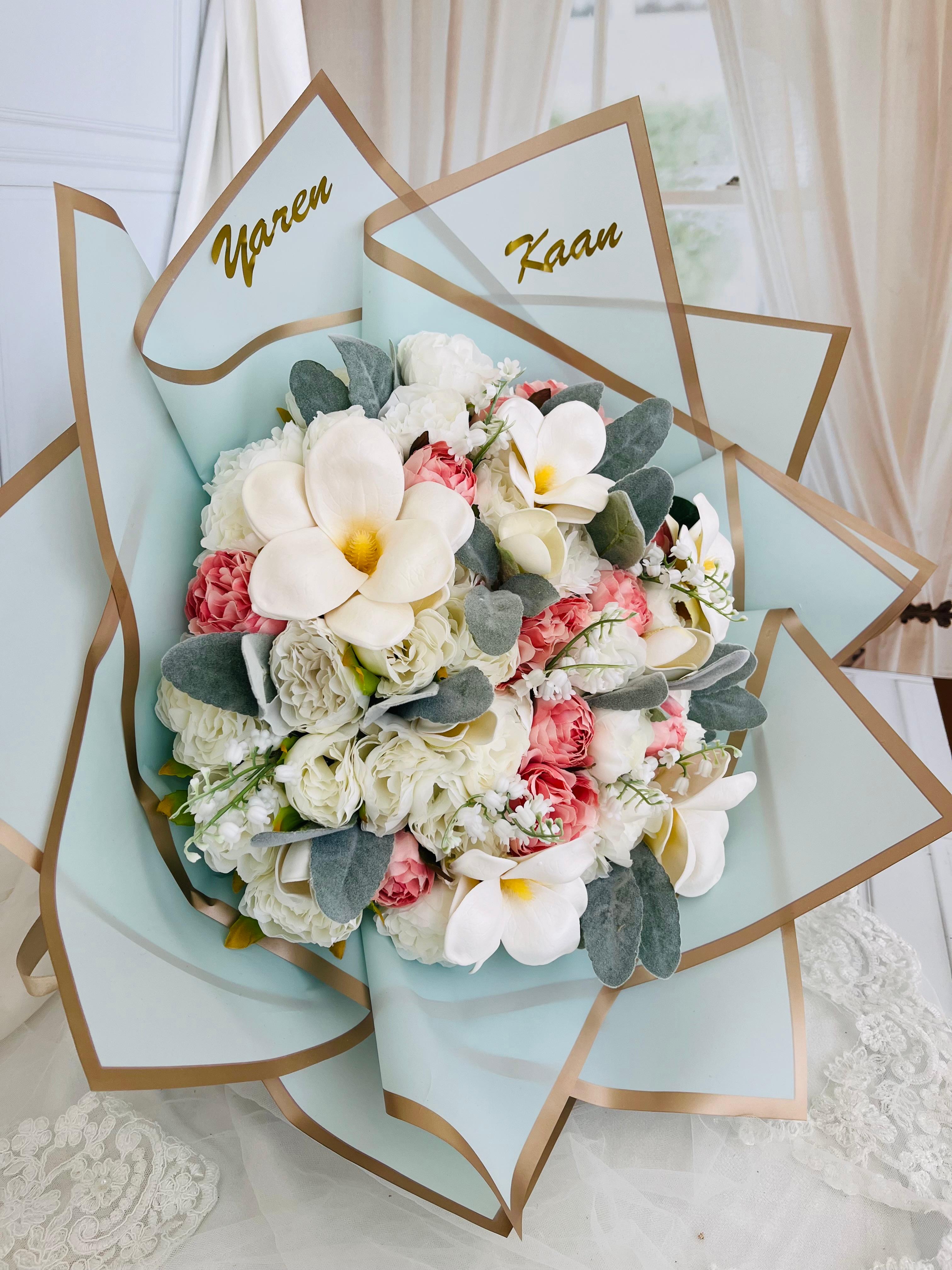 Gerçek çiçek görünümündeki birinci sınıf kumaş çiçeklerle hazırlanmıştır.?İsimleri not kısmında belirtebilirsiniz. Teslim süresi 15-20 iş günüdür; acil tarihler için not kısmına belirtmeniz yeterlidir. Ürünlerimiz tamamen el yapımıdır; bu nedenle her buket ve süs benzersizdir. Çiçeklerin yerleşimi ve detayları ufak farklılıklar gösterebilir, bu da ürünlerimize özel bir karakter katar. ?