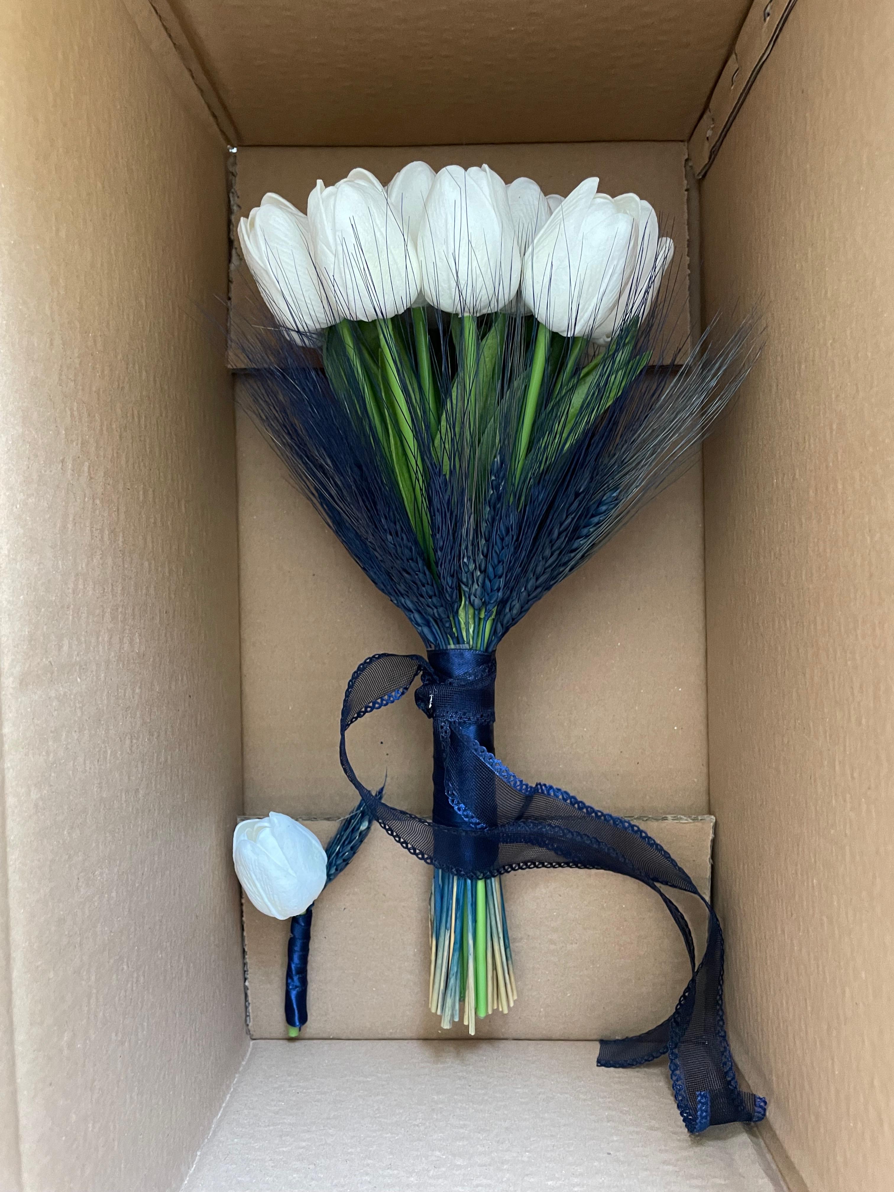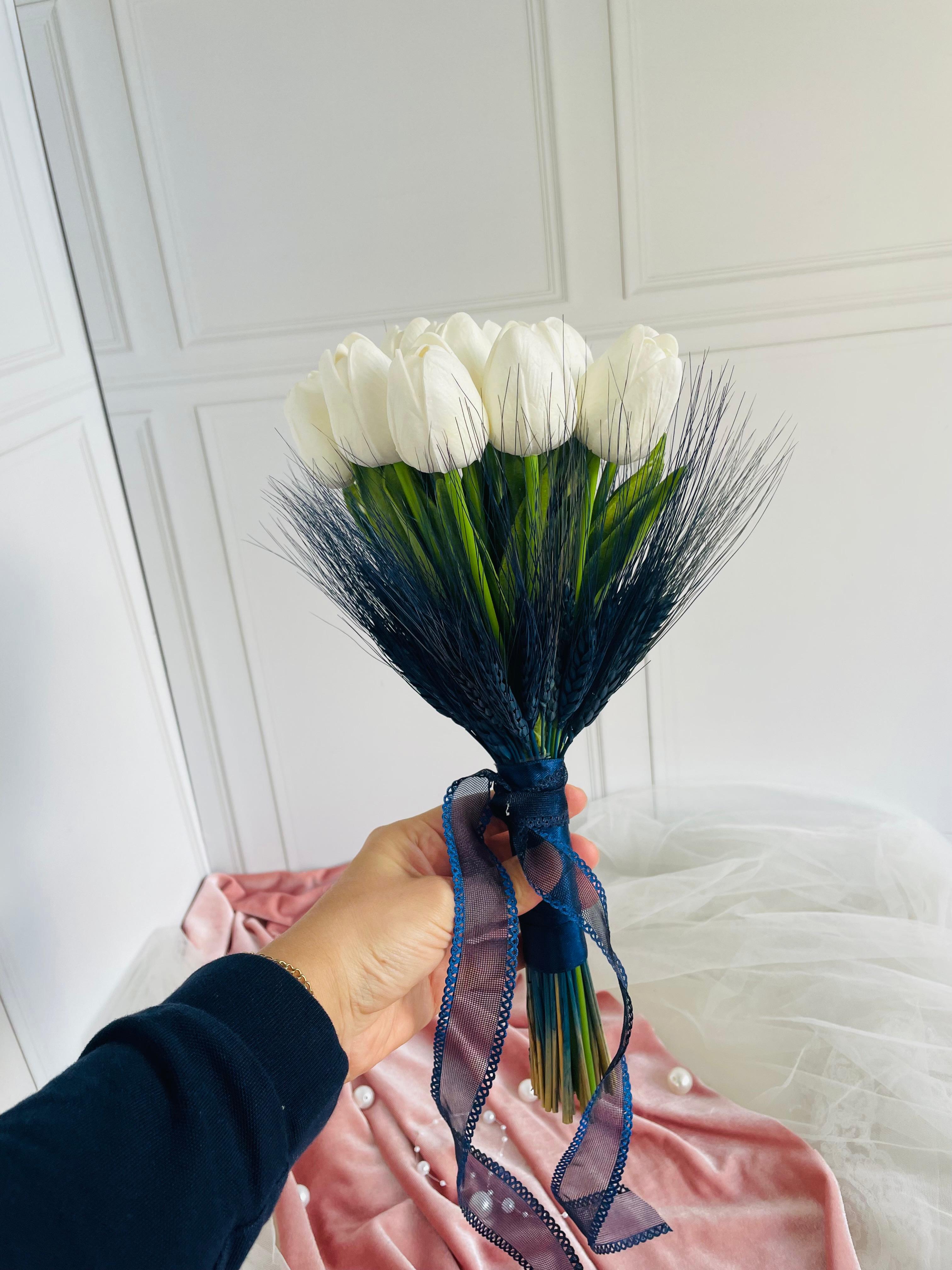 Beyaz lalelerin sadeliği zarif bir görünüm sundu. Temiz, minimal bir gelin buketi arayanlar için ideal seçimdir.? 15 adet yapay ıslak dokulu laleden oluşuyor. Orta boydur ne büyük ne de küçük. Yaka çiçeği hediyedir. Teslim süresi 15-20 iş günüdür; acil tarihler için not kısmına belirtmeniz yeterlidir. ?Ürünlerimiz tamamen el yapımıdır; bu nedenle her buket ve süs benzersizdir. Çiçeklerin yerleşimi ve detayları ufak farklılıklar gösterebilir, bu da ürünlerimize özel bir karakter katar. ?
