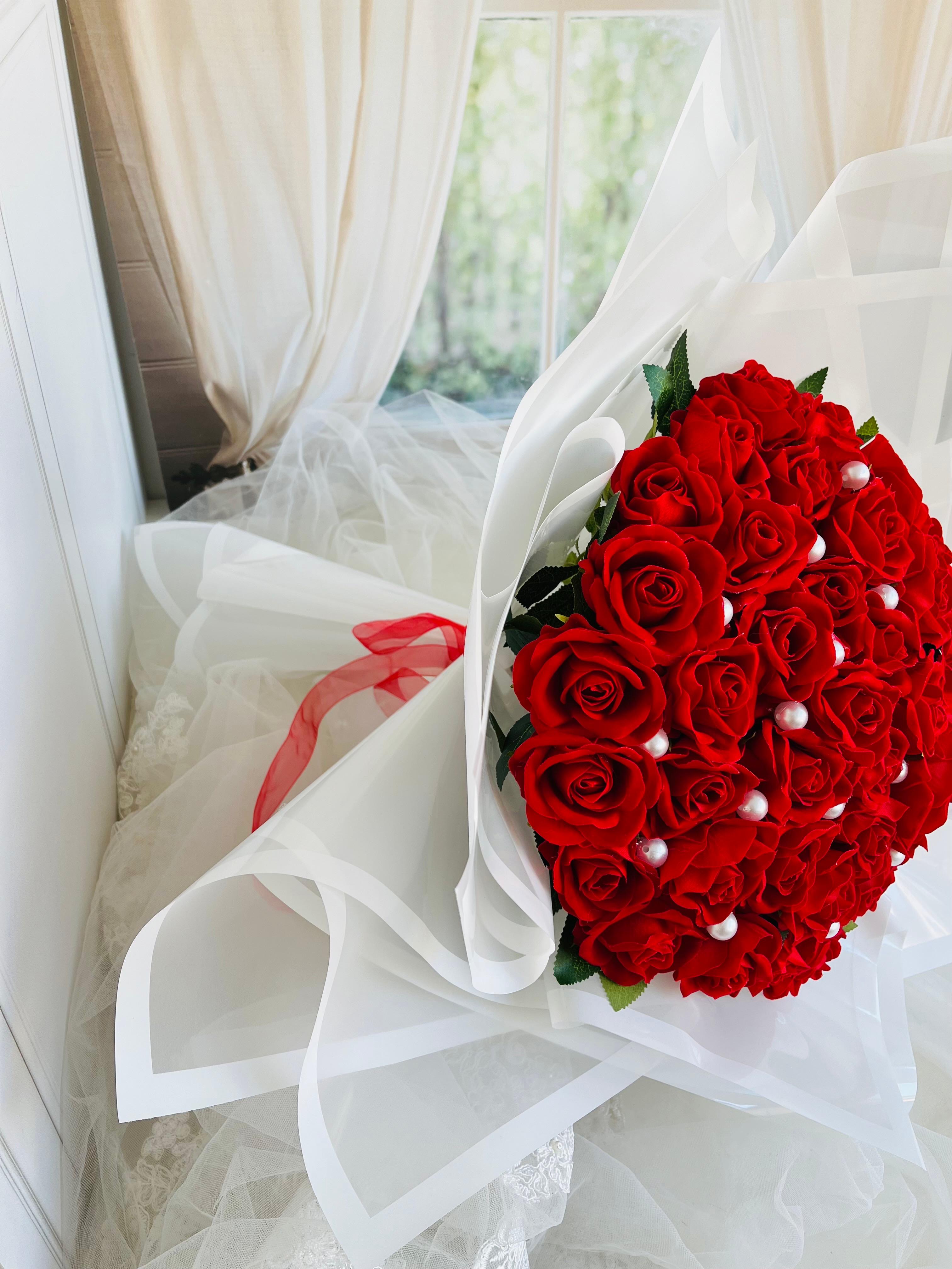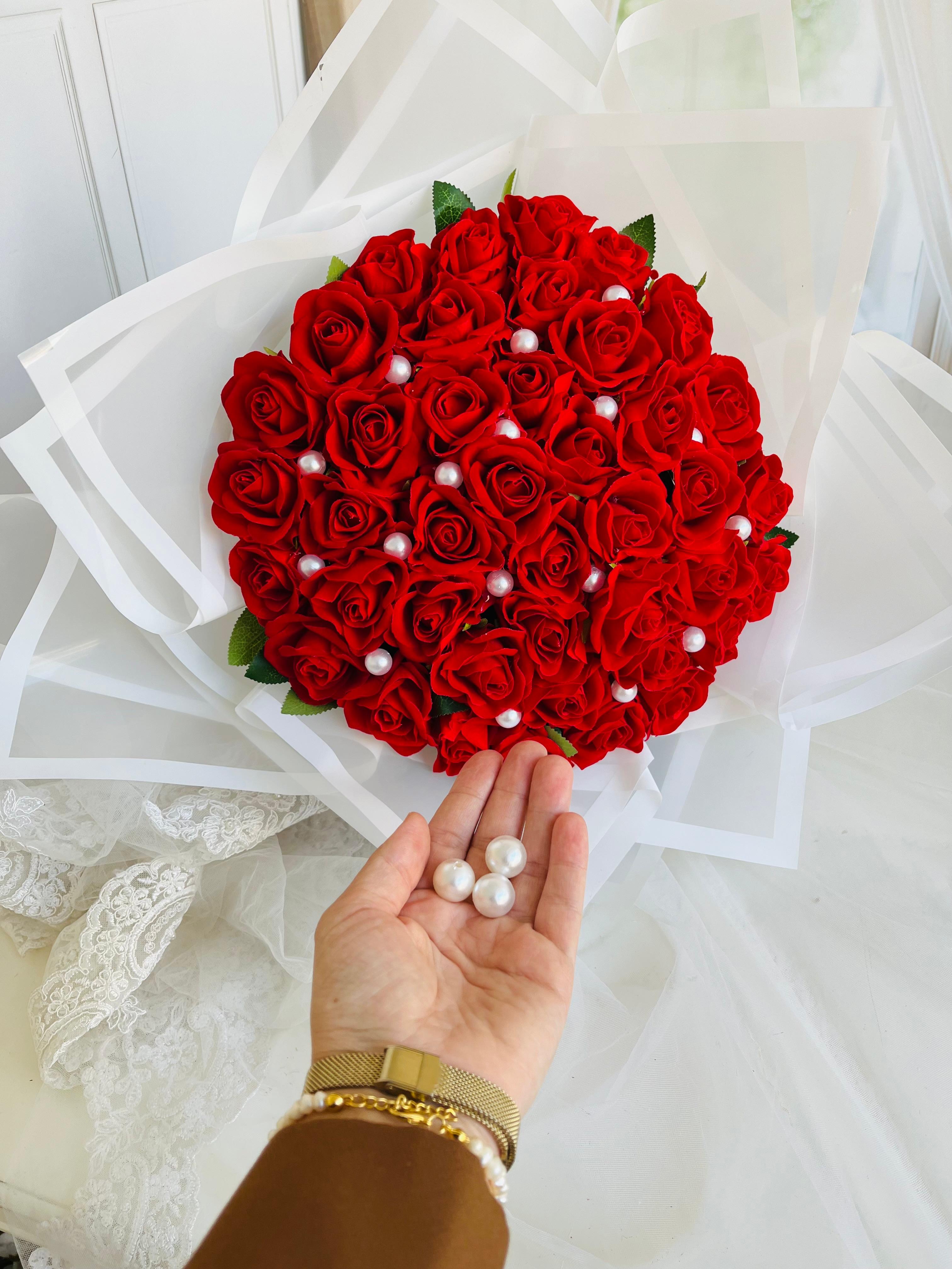 ?İsteme törenlerine zarafet katacak özel tasarım! Yoğun kırmızı güller, beyaz modern ambalajla birleşti. Sevginizin değerini göstermek için mükemmel bir tercih ?? 41 adet yapay kadife gülden oluşuyor . Uzun ömürlüdür ☘️ Teslim süresi 15-20 iş günüdür; acil tarihler için not kısmına belirtmeniz yeterlidir. ?Ürünlerimiz tamamen el yapımıdır; bu nedenle her buket ve süs benzersizdir. Çiçeklerin yerleşimi ve detayları ufak farklılıklar gösterebilir, bu da ürünlerimize özel bir karakter katar. ?