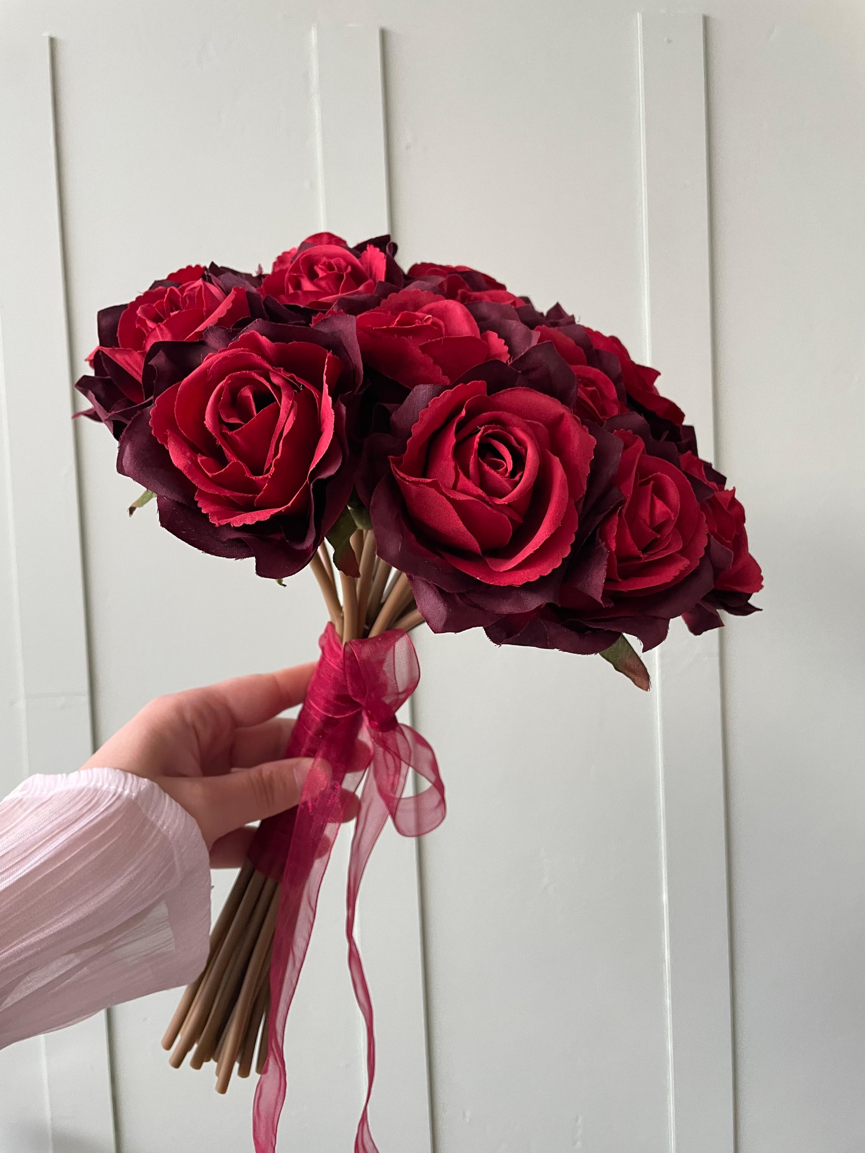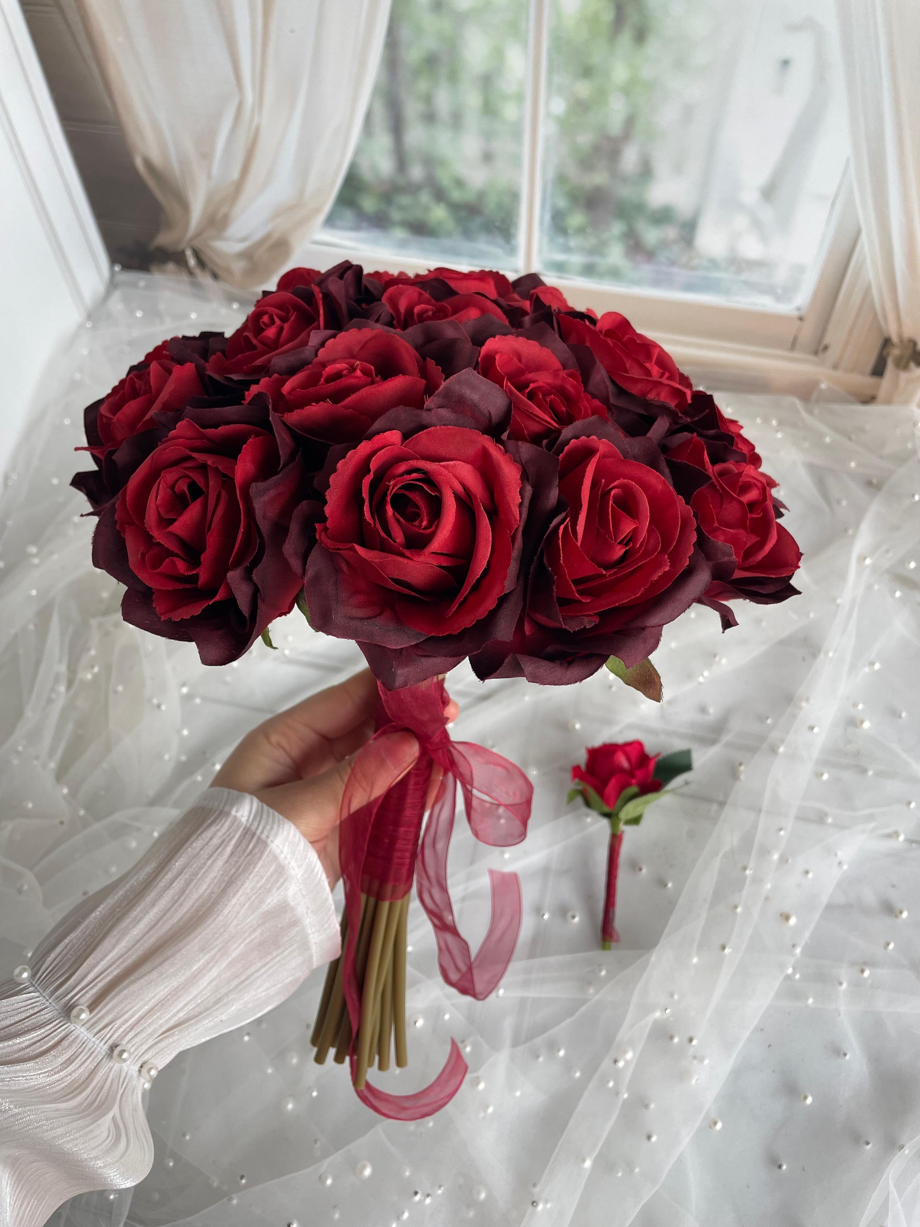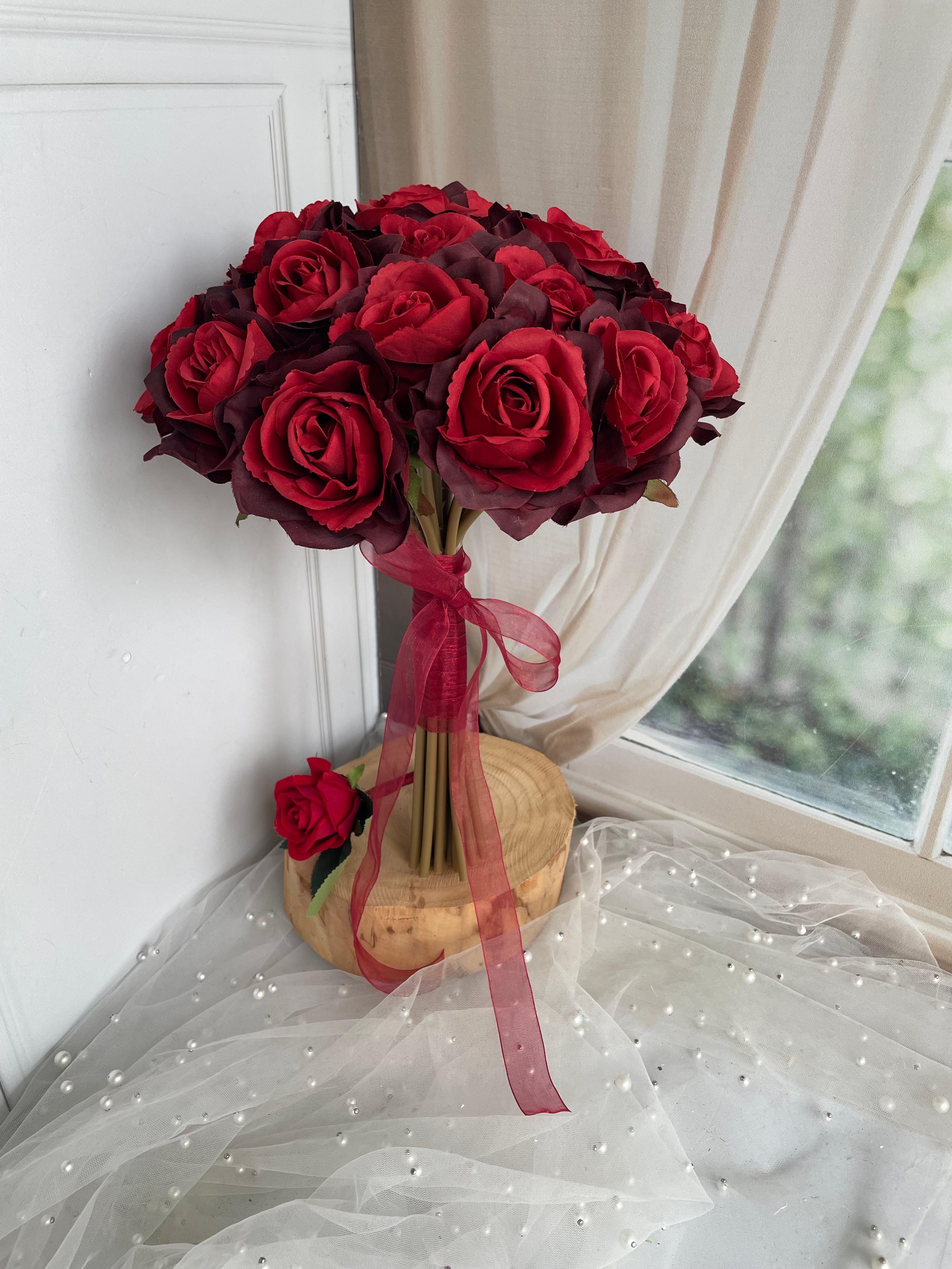 Kırmızı güllerin derin tonları ve yumuşak dokusuyla tasarlanan bu buket, özel gününüze zarafet ve romantizmin en özel halini taşır.? Düğün veya nişan için uygundur. Orta boydur ne büyük ne de küçük. Yaka çiçeği hediyedir. Teslim süresi 15-20 iş günüdür; acil tarihler için not kısmına belirtmeniz yeterlidir. ?Ürünlerimiz tamamen el yapımıdır; bu nedenle her buket ve süs benzersizdir. Çiçeklerin yerleşimi ve detayları ufak farklılıklar gösterebilir, bu da ürünlerimize özel bir karakter katar. ?
