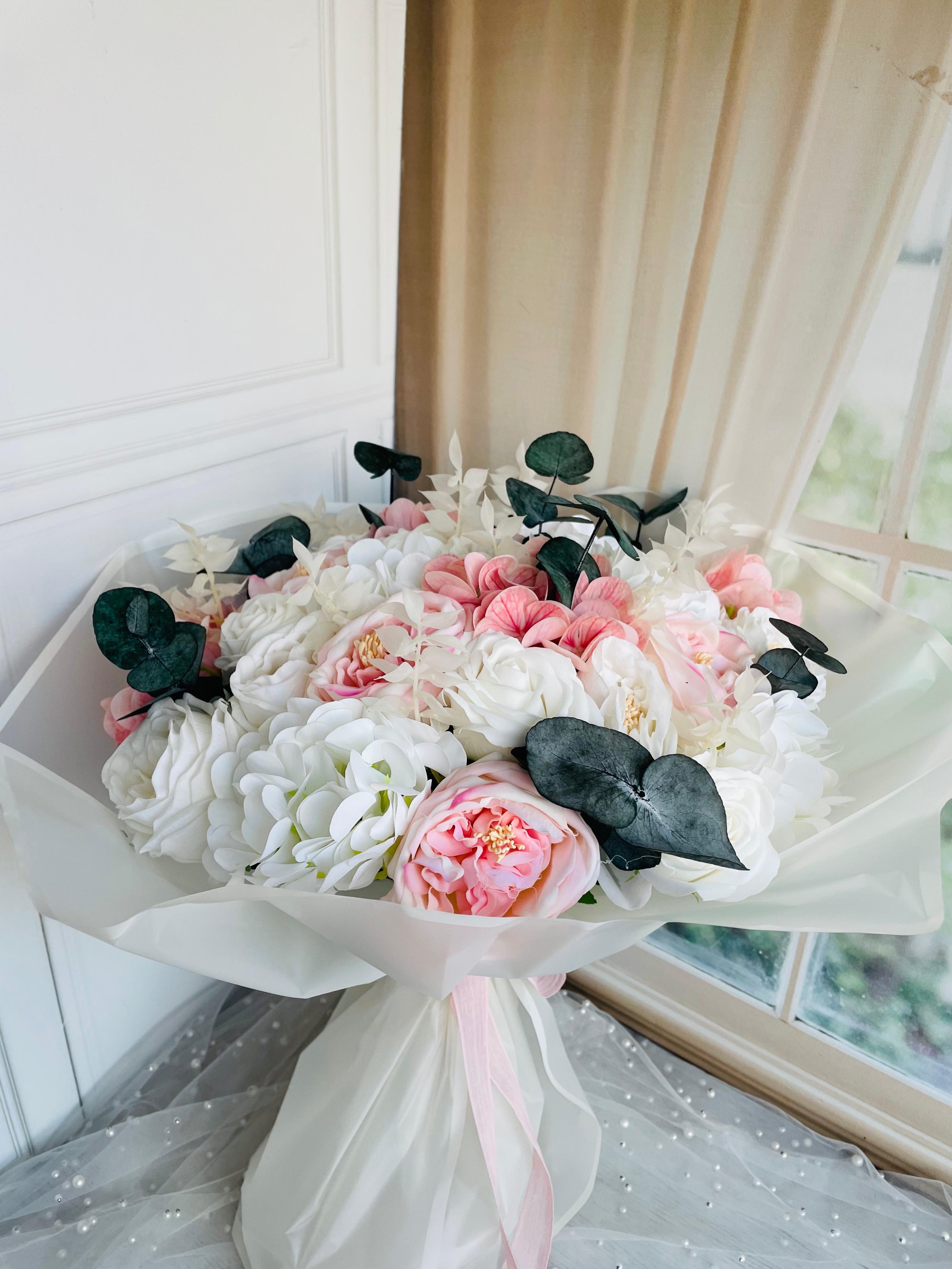 Tamamı ıslak dokulu çiçeklerin zarif uyumuyla hazırlanan bu isteme buketi, özel anlarınızı sade ve şık bir dokunuşla taçlandırır. ? Şakayık, gül ve ortancadan oluşuyor. Büyük boydur. Teslim süresi 15-20 iş günüdür; acil tarihler için not kısmına belirtmeniz yeterlidir. Ürünlerimiz tamamen el yapımıdır; bu nedenle her buket ve süs benzersizdir. Çiçeklerin yerleşimi ve detayları ufak farklılıklar gösterebilir, bu da ürünlerimize özel bir karakter katar. ?