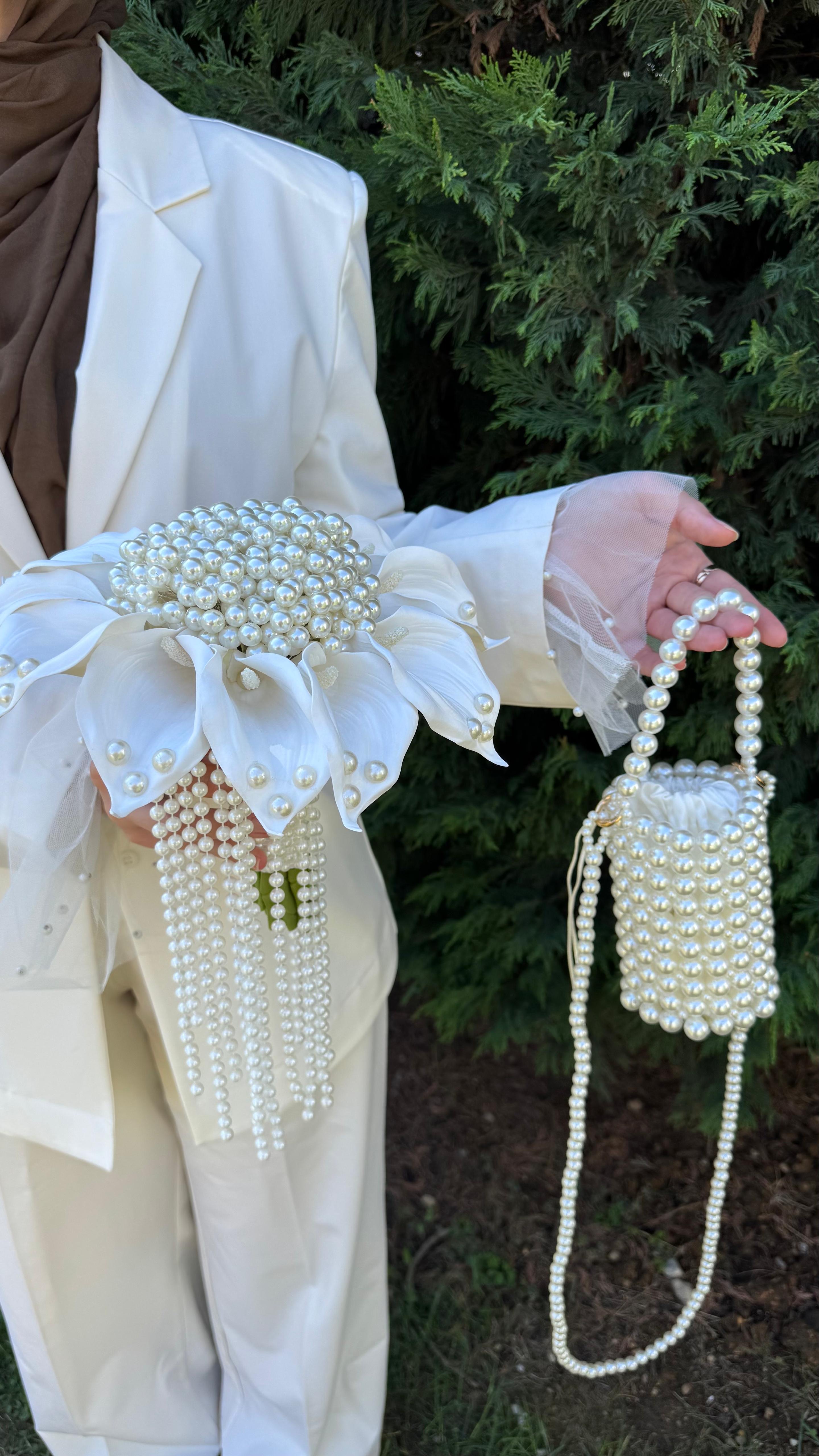 Tamamı inci detaylarla süslenmiş bu özel tasarım çanta, iç kısmındaki büzgülü kese yapısı sayesinde eşyalarınızı güvenle muhafaza eder. Zarif kesesi kolayca açılıp kapanabilirken, çantaya hem estetik hem de pratik bir kullanım sunar. Şık inci sap detayı ve romantik tasarımıyla; nişan, düğün, davet ve özel gün kombinlerini tamamlamak için ideal bir parçadır. Çap: 13 cm ?Teslim süresi 15-20 iş günüdür; acil tarihler için not kısmına belirtmeniz yeterlidir.