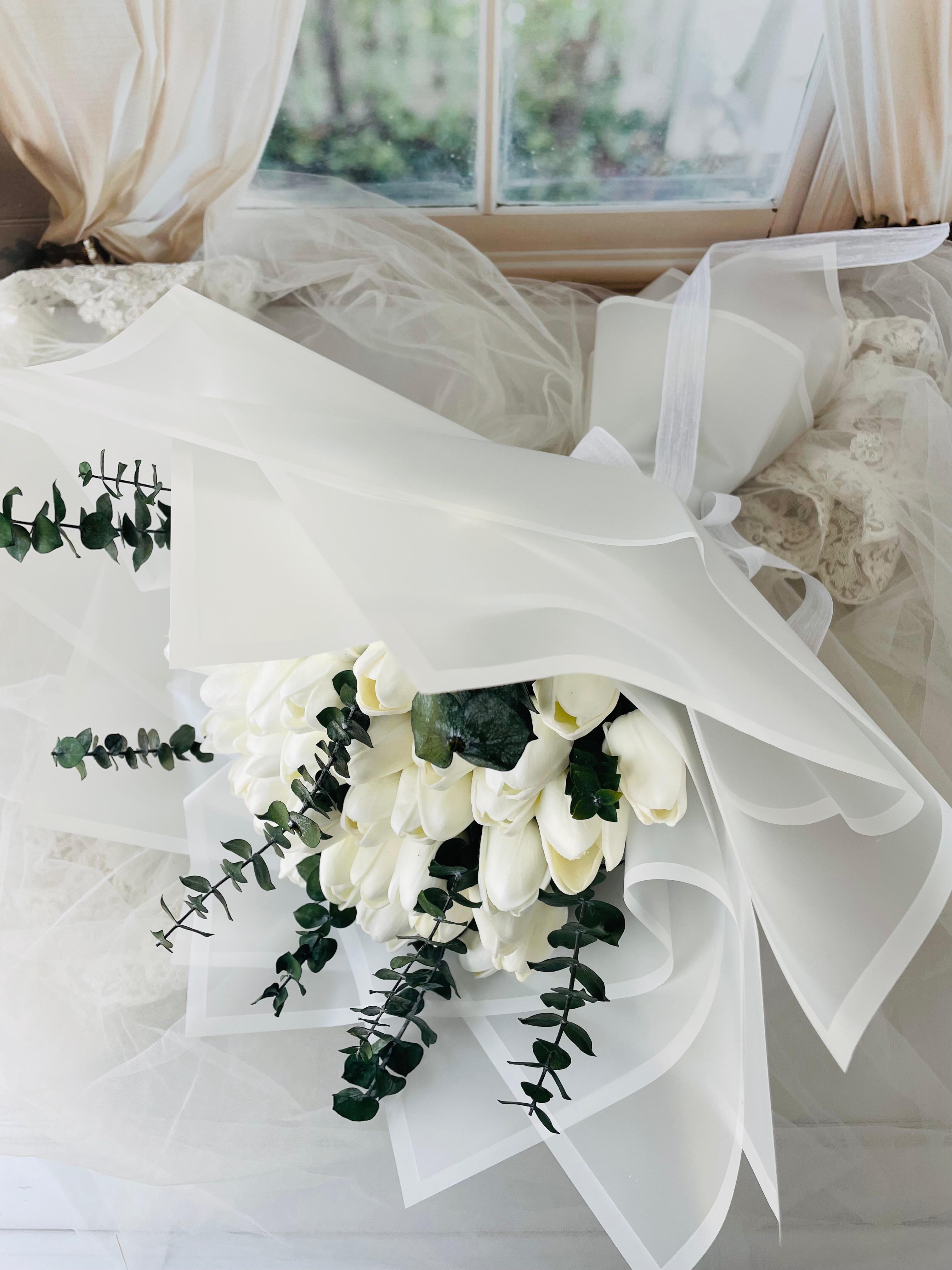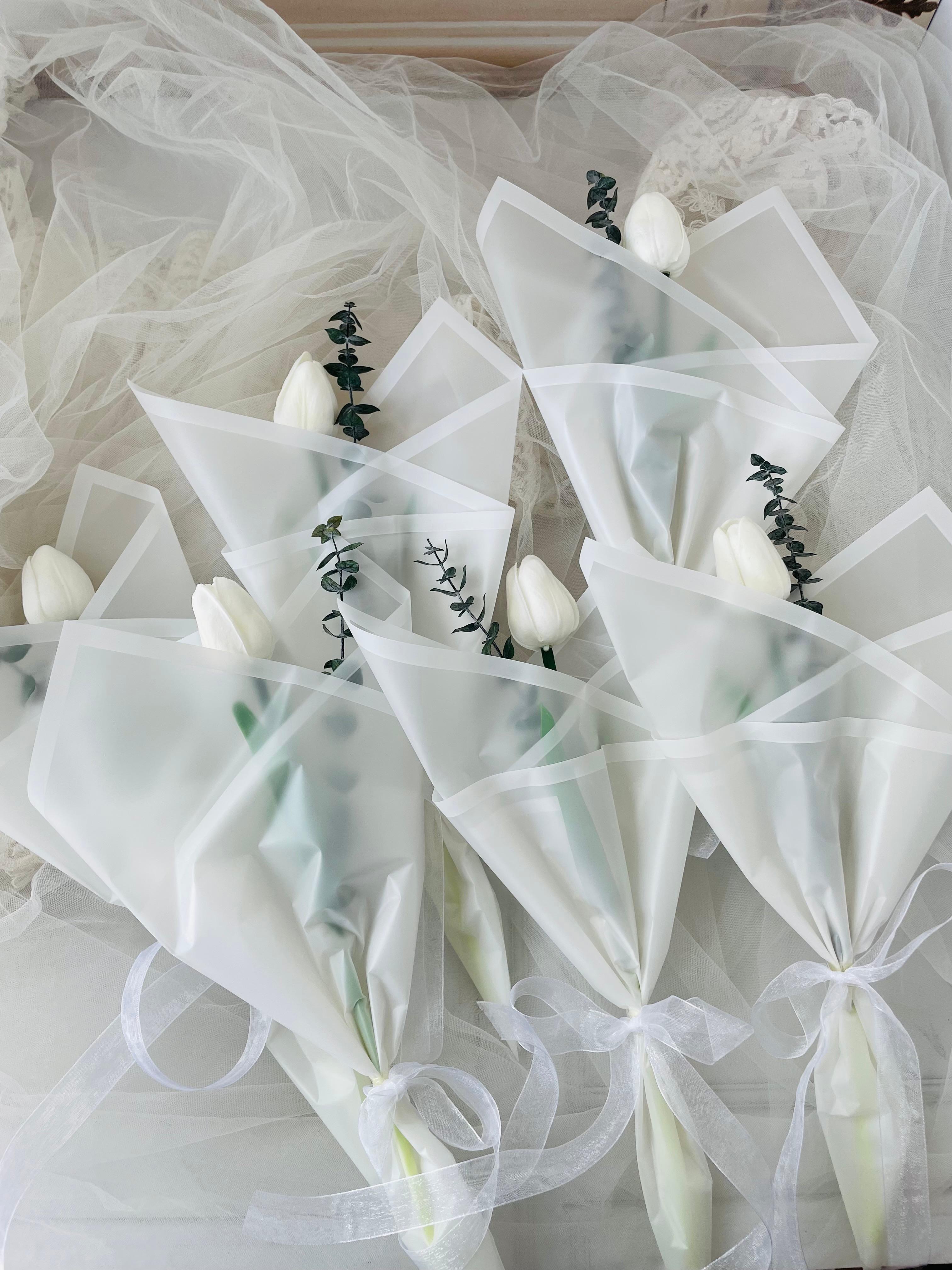?Beyaz lalelerin asaleti, yeşil yaprakların zarif dokunuşuyla birleşti. Sevginizi en saf haliyle anlatan özel bir isteme ve nişan buketi. 41 adet yapay ıslak laleden oluşuyor. Teslim süresi 15-20 iş günüdür; acil tarihler için not kısmına belirtmeniz yeterlidir. Ürünlerimiz tamamen el yapımıdır; bu nedenle her buket ve süs benzersizdir. Çiçeklerin yerleşimi ve detayları ufak farklılıklar gösterebilir, bu da ürünlerimize özel bir karakter katar. ?