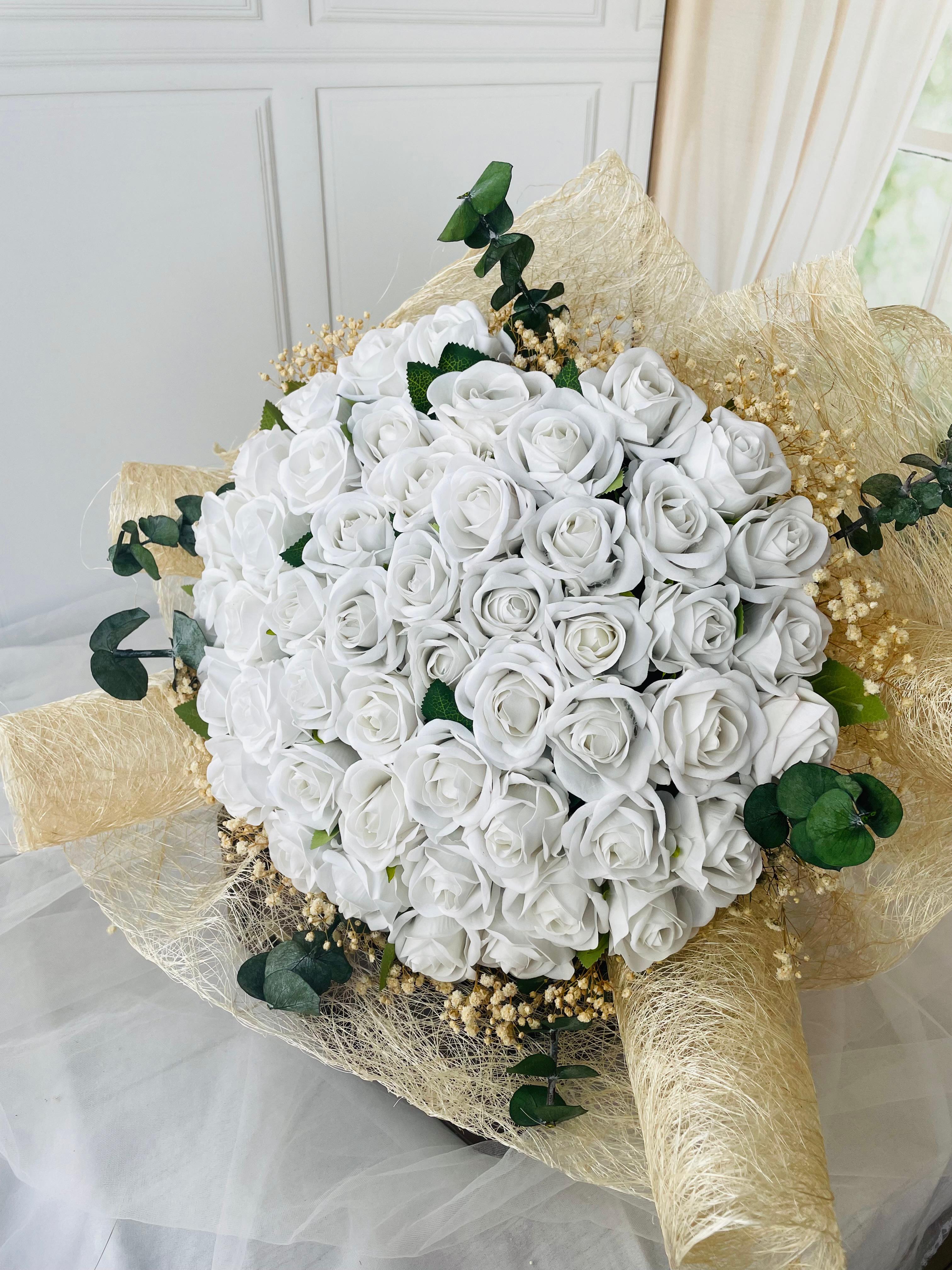 ?Beyaz güllerin asaleti, yeşil yaprakların zarif dokunuşuyla birleşti. Sevginizi en saf haliyle anlatan özel bir isteme ve nişan buketi. 41 adet yapay kadife gülden oluşuyor. Teslim süresi 15-20 iş günüdür; acil tarihler için not kısmına belirtmeniz yeterlidir. Ürünlerimiz tamamen el yapımıdır; bu nedenle her buket ve süs benzersizdir. Çiçeklerin yerleşimi ve detayları ufak farklılıklar gösterebilir, bu da ürünlerimize özel bir karakter katar. ?