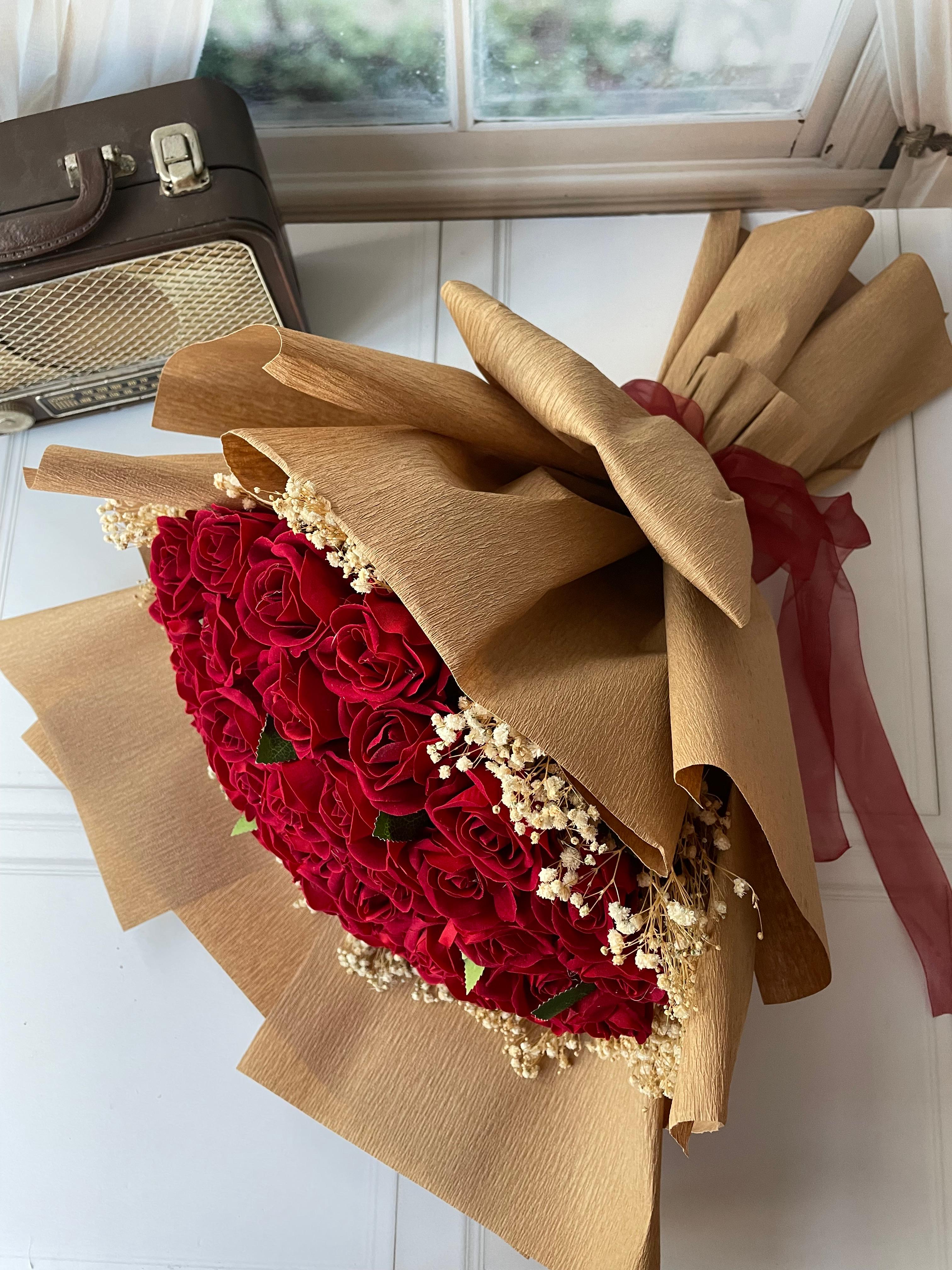 ❤️İsteme törenlerine zarafet katacak özel tasarım! Yoğun kırmızı güller, modern ambalajla birleşti. Sevginizin değerini göstermek için mükemmel bir tercih ?? 41 adet yapay kadife gülden oluşuyor . Uzun ömürlüdür ☘️ Teslim süresi 15-20 iş günüdür; acil tarihler için not kısmına belirtmeniz yeterlidir. ?Ürünlerimiz tamamen el yapımıdır; bu nedenle her buket ve süs benzersizdir. Çiçeklerin yerleşimi ve detayları ufak farklılıklar gösterebilir, bu da ürünlerimize özel bir karakter katar. ?