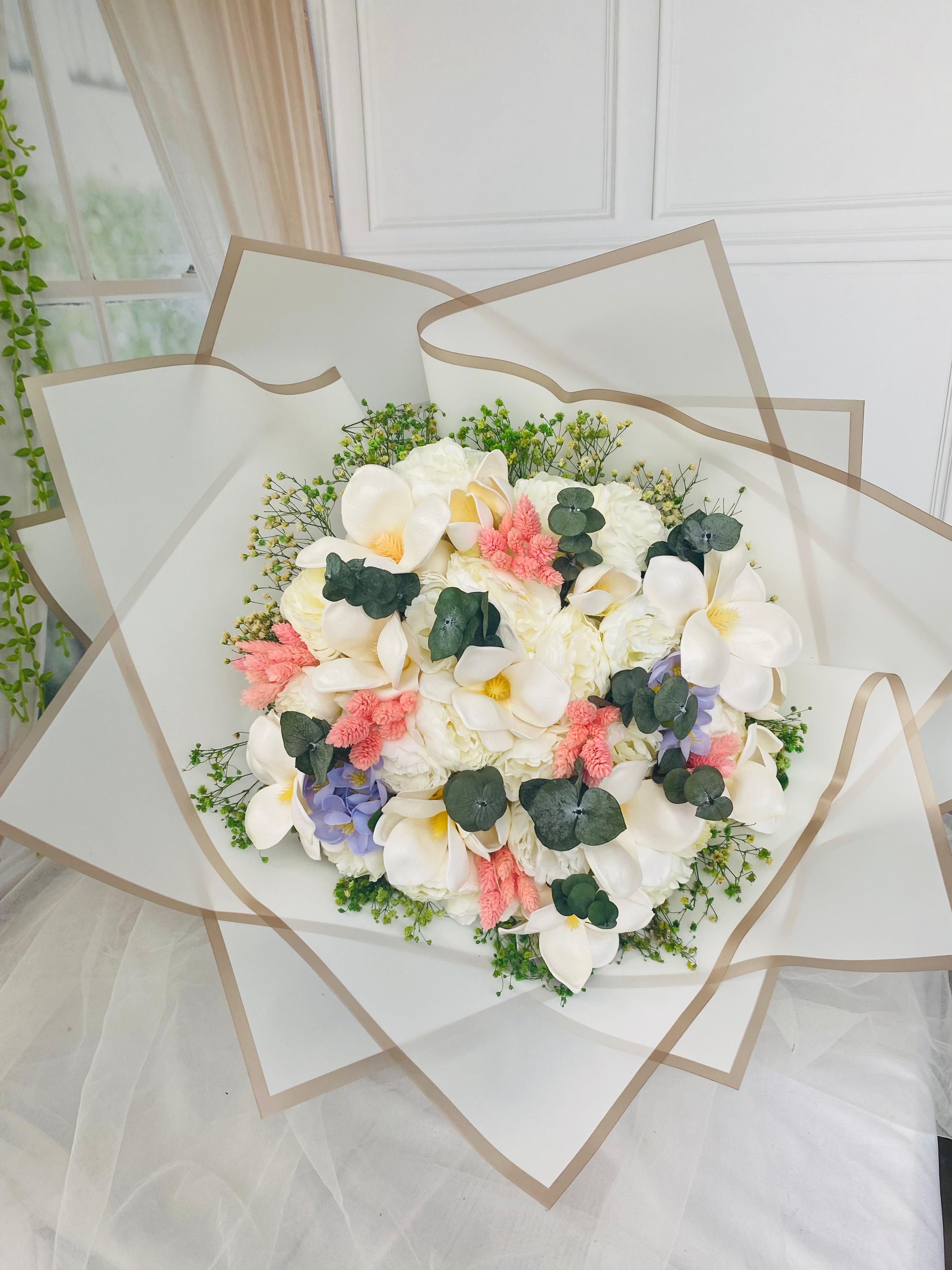 ?Kumaş ve şoklanmış çiçeklerden oluşmaktadır. Zarif detaylarıyla hem isteme hem de özel günler için kusursuz bir seçim. ✨ Birinci sınıf kalitedeki çiçeklerden oluşmaktadır. Ömürlüktür. Büyük boydur. Teslim süresi 15-20 iş günüdür; acil tarihler için not kısmına belirtmeniz yeterlidir. ?Ürünlerimiz tamamen el yapımıdır; bu nedenle her buket ve süs benzersizdir. Çiçeklerin yerleşimi ve detayları ufak farklılıklar gösterebilir, bu da ürünlerimize özel bir karakter katar. ?