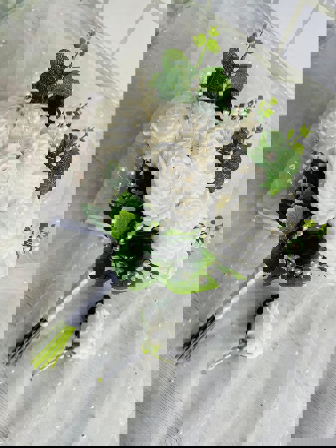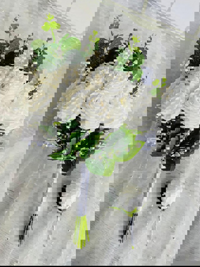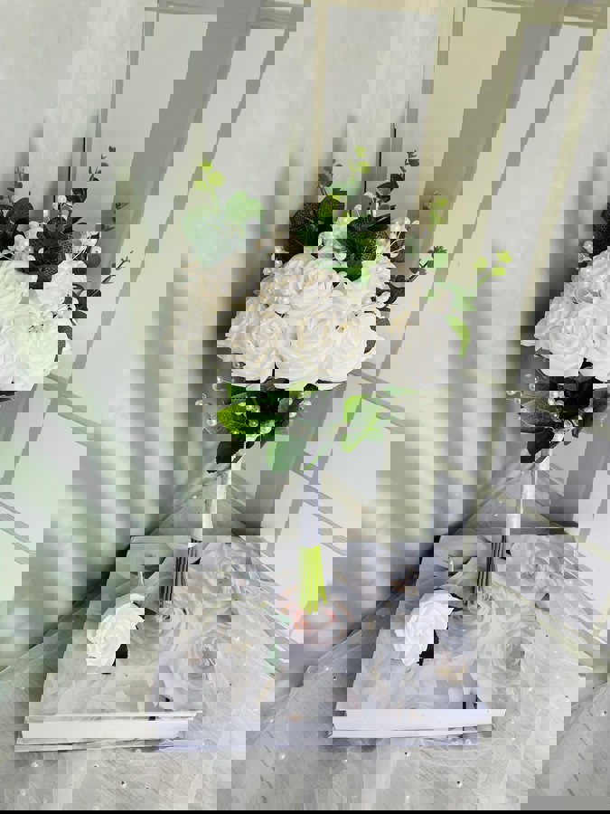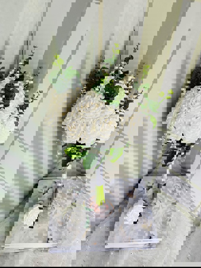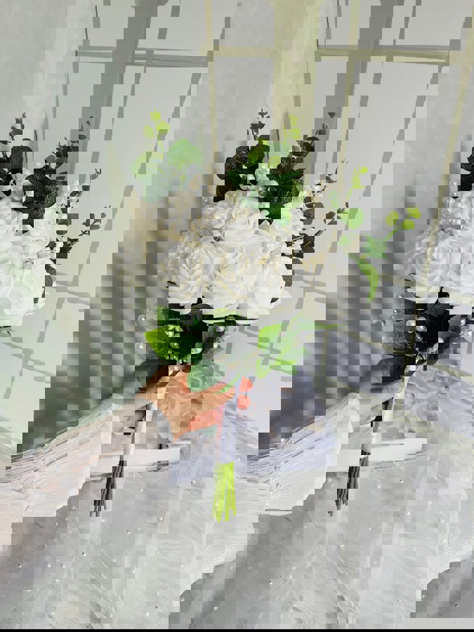 Bembeyaz ıslak güllerin masum ışıltısından ilham alan bu buket, şıklığın en zarif halini sunuyor. İnceliği ve duruluğu ile özel anlarınıza ışıltı katmak için özenle hazırlandı. Teslim süresi 15-20 iş günüdür; acil tarihler için not kısmına belirtmeniz yeterlidir. Ürünlerimiz tamamen el yapımıdır; bu nedenle her buket ve süs benzersizdir. Çiçeklerin yerleşimi ve detayları ufak farklılıklar gösterebilir, bu da ürünlerimize özel bir karakter katar.
