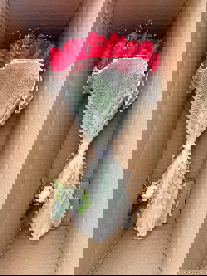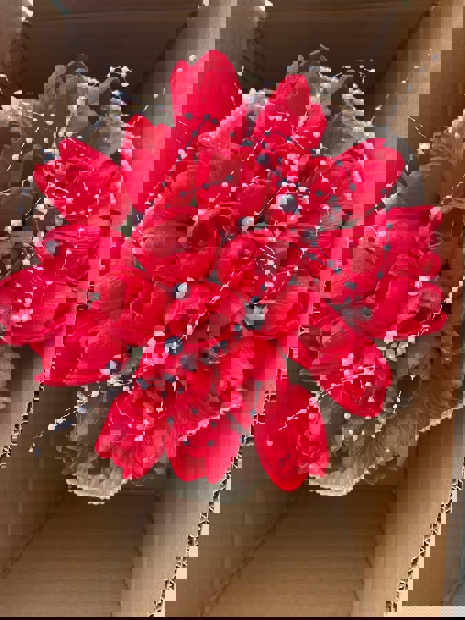 Kırmızı lalelerin asil ışıltısından ilham alan bu buket, şıklığın en zarif halini sunuyor. İnceliği ile özel anlarınıza ışıltı katmak için özenle hazırlandı. 24 adet ıslak dokulu laleden oluşuyor. Düğün veya nişan için uygundur. Teslim süresi 15-20 iş günüdür; acil tarihler için not kısmına belirtmeniz yeterlidir. Ürünlerimiz tamamen el yapımıdır; bu nedenle her buket ve süs benzersizdir. Çiçeklerin yerleşimi ve detayları ufak farklılıklar gösterebilir, bu da ürünlerimize özel bir karakter katar.