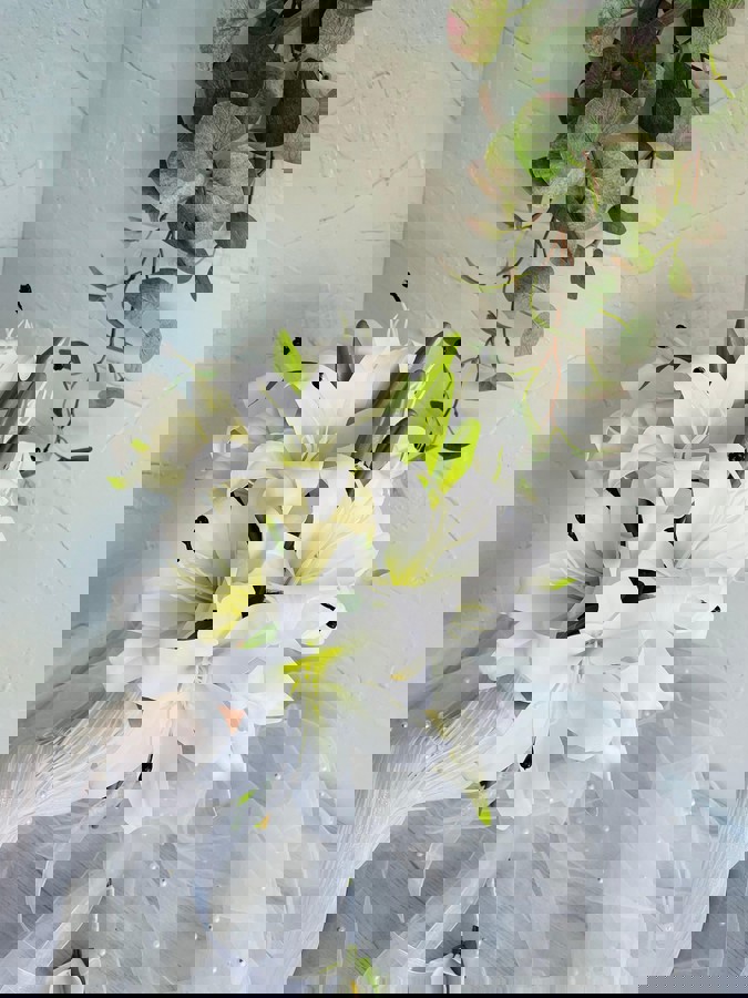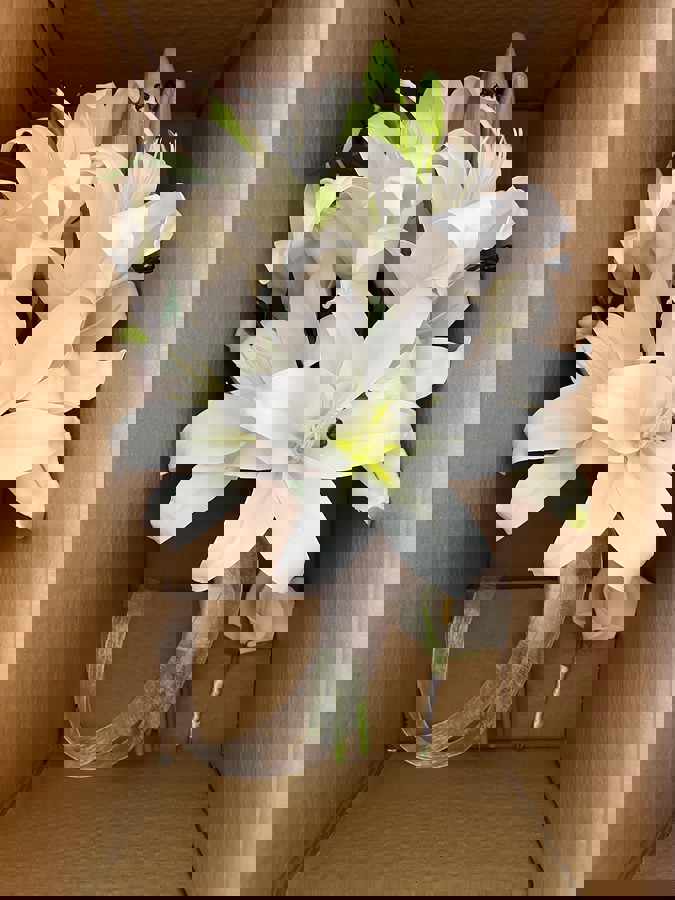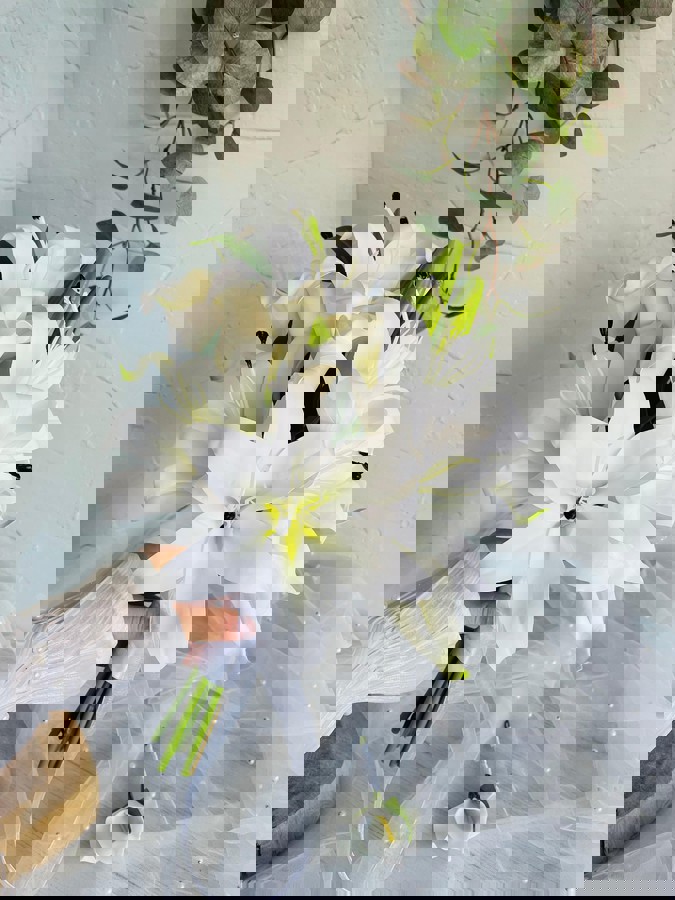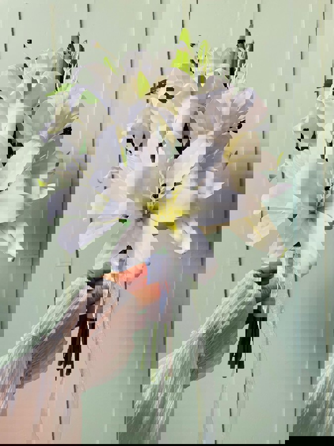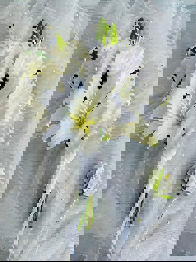 Zarif beyaz gala ve lilyumların zarafetiyle hazırlanan bu buket, saflığın ve şıklığın en güzel ifadesidir. Özel anlara sade bir dokunuş katar. ✨ Yaka çiçeği hediyedir. Teslim süresi 15-20 iş günüdür; acil tarihler için not kısmına belirtmeniz yeterlidir. Ürünlerimiz tamamen el yapımıdır; bu nedenle her buket ve süs benzersizdir. Çiçeklerin yerleşimi ve detayları ufak farklılıklar gösterebilir, bu da ürünlerimize özel bir karakter katar.