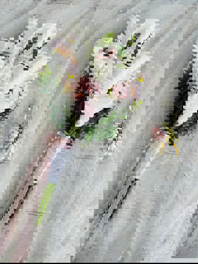 Sadelikten gelen ihtişamı taşıyan bu tasarım, her gelinin hayalini yansıtır. Orta boydur ne büyük ne de küçük. (Ölçü=53*33) Yaka çiçeği hediyedir . Teslim süresi 15-20 iş günüdür; acil tarihler için not kısmına belirtmeniz yeterlidir. Ürünlerimiz tamamen el yapımıdır; bu nedenle her buket ve süs benzersizdir. Çiçeklerin yerleşimi ve detayları ufak farklılıklar gösterebilir, bu da ürünlerimize özel bir karakter katar.
