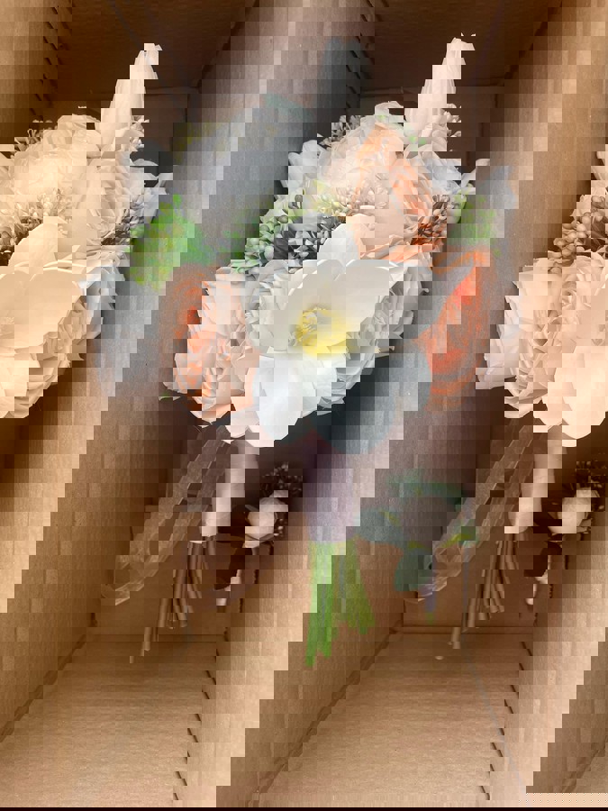 Gerçek çiçek görünümündeki birinci sınıf kumaş çiçeklerle hazırlanmıştır. Zarif ve sade tasarımıyla her gelinliğe uyum sağlar. Orta boydur ne büyük ne de küçük . Yaka çiçeği hediyedir. Teslim süresi 15-20 iş günüdür; acil tarihler için not kısmına belirtmeniz yeterlidir. Ürünlerimiz tamamen el yapımıdır; bu nedenle her buket ve süs benzersizdir. Çiçeklerin yerleşimi ve detayları ufak farklılıklar gösterebilir, bu da ürünlerimize özel bir karakter katar.