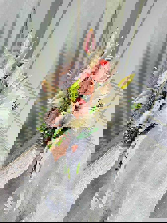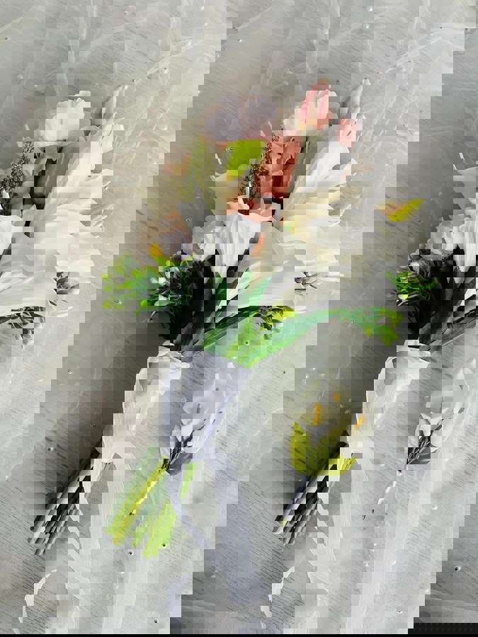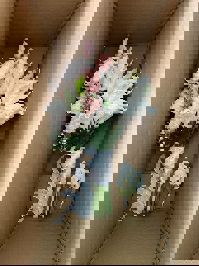 Gerçek çiçek görünümündeki kumaş ve ıslak dokulu birinci sınıf kumaş çiçeklerle hazırlanmıştır. Orta boydur ne büyük nede küçük . Yaka çiçeği hediyedir. Teslim süresi 15-20 iş günüdür; acil tarihler için not kısmına belirtmeniz yeterlidir. Ürünlerimiz tamamen el yapımıdır; bu nedenle her buket ve süs benzersizdir. Çiçeklerin yerleşimi ve detayları ufak farklılıklar gösterebilir, bu da ürünlerimize özel bir karakter katar.
