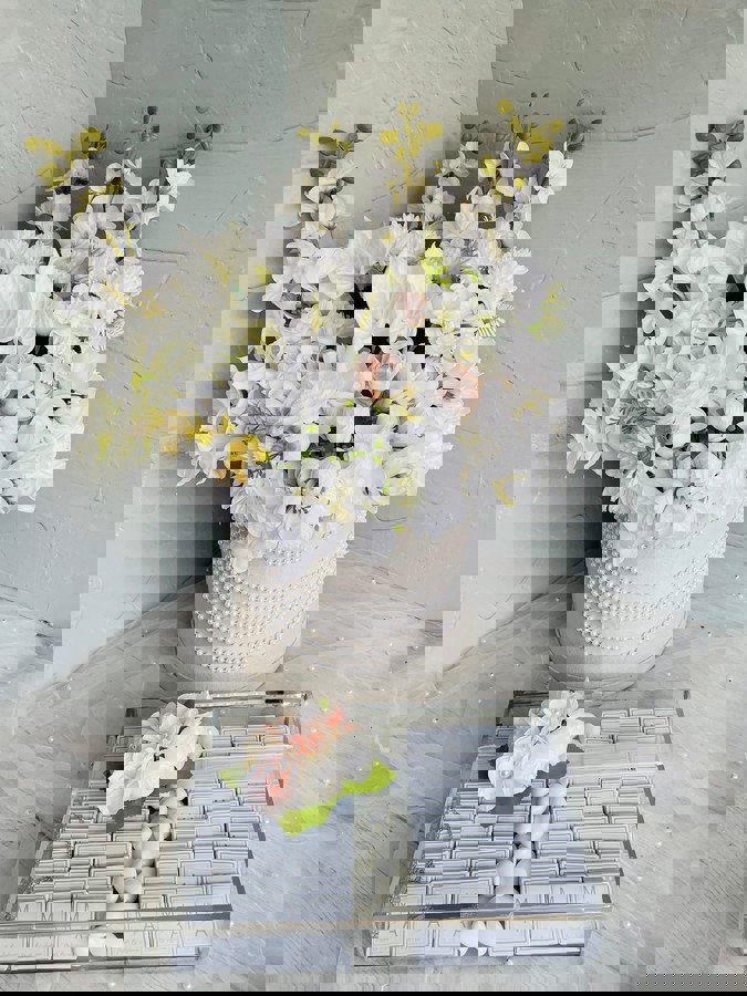 Bembeyaz çiçeklerin zarif uyumuyla hazırlanan bu kutu isteme buketi, özel anlarınızı sade ve şık bir dokunuşla taçlandırır. Ömürlüktür. Büyük boydur. Teslim süresi 15-20 iş günüdür; acil tarihler için not kısmına belirtmeniz yeterlidir. Ürünlerimiz tamamen el yapımıdır; bu nedenle her buket ve süs benzersizdir. Çiçeklerin yerleşimi ve detayları ufak farklılıklar gösterebilir, bu da ürünlerimize özel bir karakter katar.