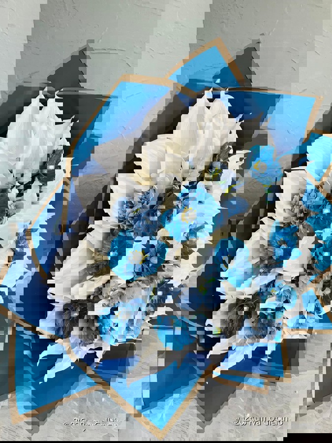 Mavi ve beyaz çiçeklerin yumuşak geçişleriyle huzur veren bir tasarım. Zarif detaylarıyla hem isteme hem de özel günler için kusursuz bir seçim. ✨ Birinci sınıf kalitedeki çiçeklerden oluşmaktadır. Ömürlüktür. Orta boydur. Teslim süresi 15-20 iş günüdür; acil tarihler için not kısmına belirtmeniz yeterlidir. 💌Ürünlerimiz tamamen el yapımıdır; bu nedenle her buket ve süs benzersizdir. Çiçeklerin yerleşimi ve detayları ufak farklılıklar gösterebilir, bu da ürünlerimize özel bir karakter katar. 💐